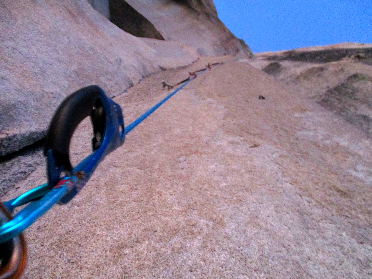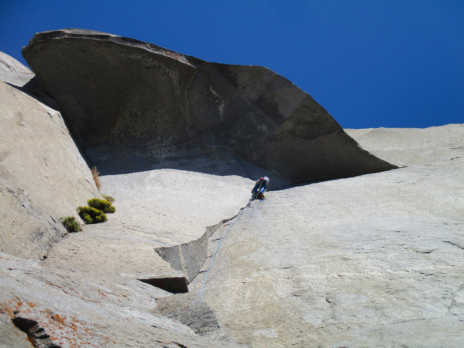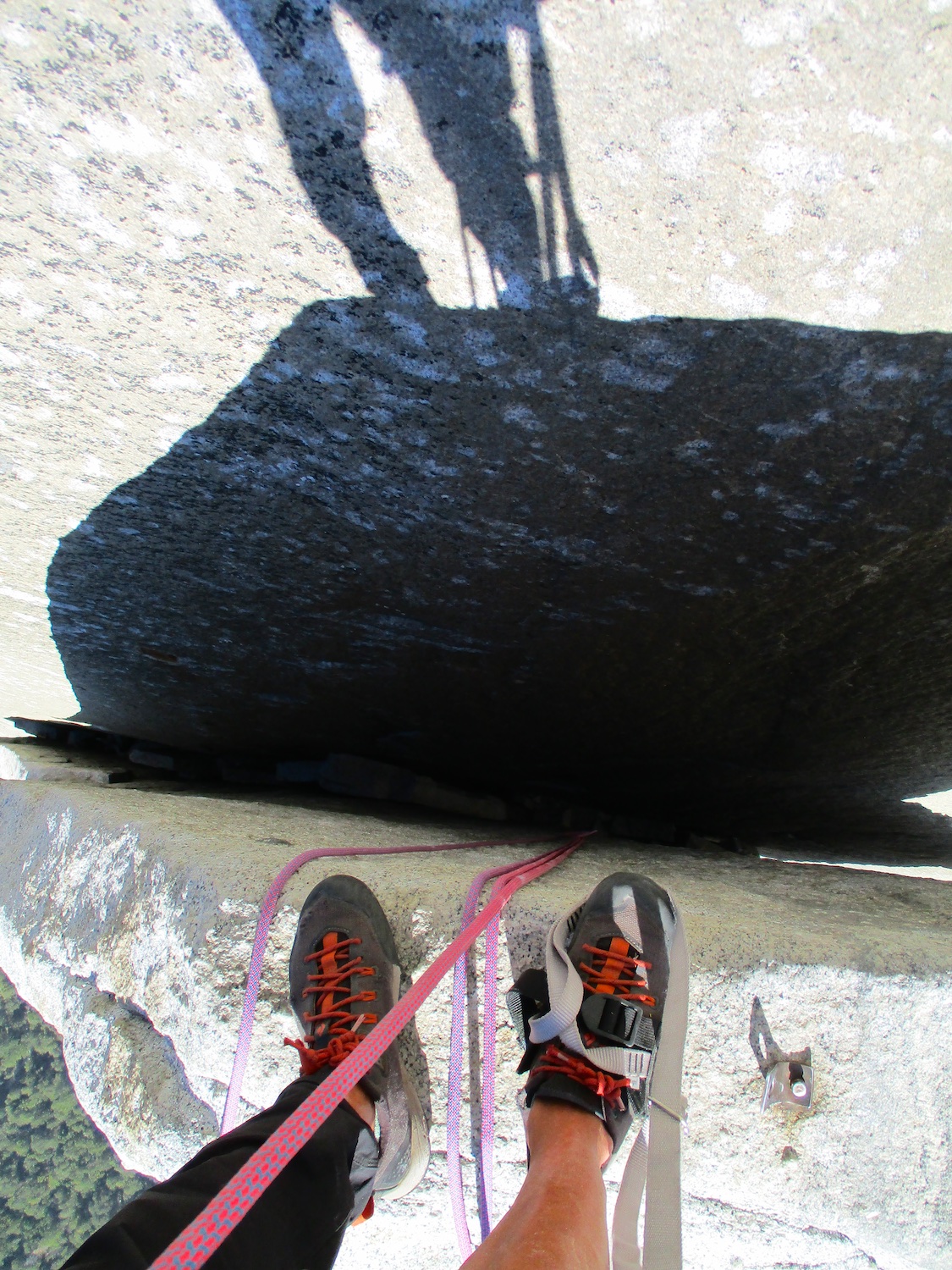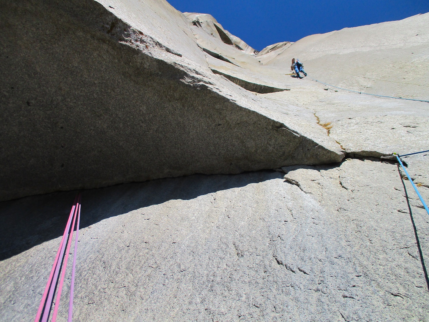 Nate and I climbed the route in just over 19 hours (I'm obviously not as fast as Eric Sloan...). To speed things up, Nate usually short-fixed and was already about 30-40 feet into the next pitch by the time I arrived at the anchor and put him on belay, and then passed him all of the gear I collected via his 45 foot tag line. It was a splitter October weekend, so there were several parties on the route—at least 3 NIAD parties and 5 hauling parties; we passed 6 parties and were passed by one party. Another factor to consider was the amount of daylight—sunrise at 7:06 am and sunset at 6:22 pm gave just over 11 hours of daylight. As follower, I carried the pack, which contained extra clothes, food, 1 gallon of water each (for a total of 16 lb of water starting off the route), and miscellaneous items like tape and batteries. I appreciated the athleticism of the day. Our bodies felt great, and the only real complaint on Sunday was we were a bit thirsty and our fingers hurt (my thumbnails had split back from all the jugging and Nate's pads were raw from touching 3000 feet of Yosemite granite). It was so nice to be back in the Valley again; I love this place. I took lots of photos.