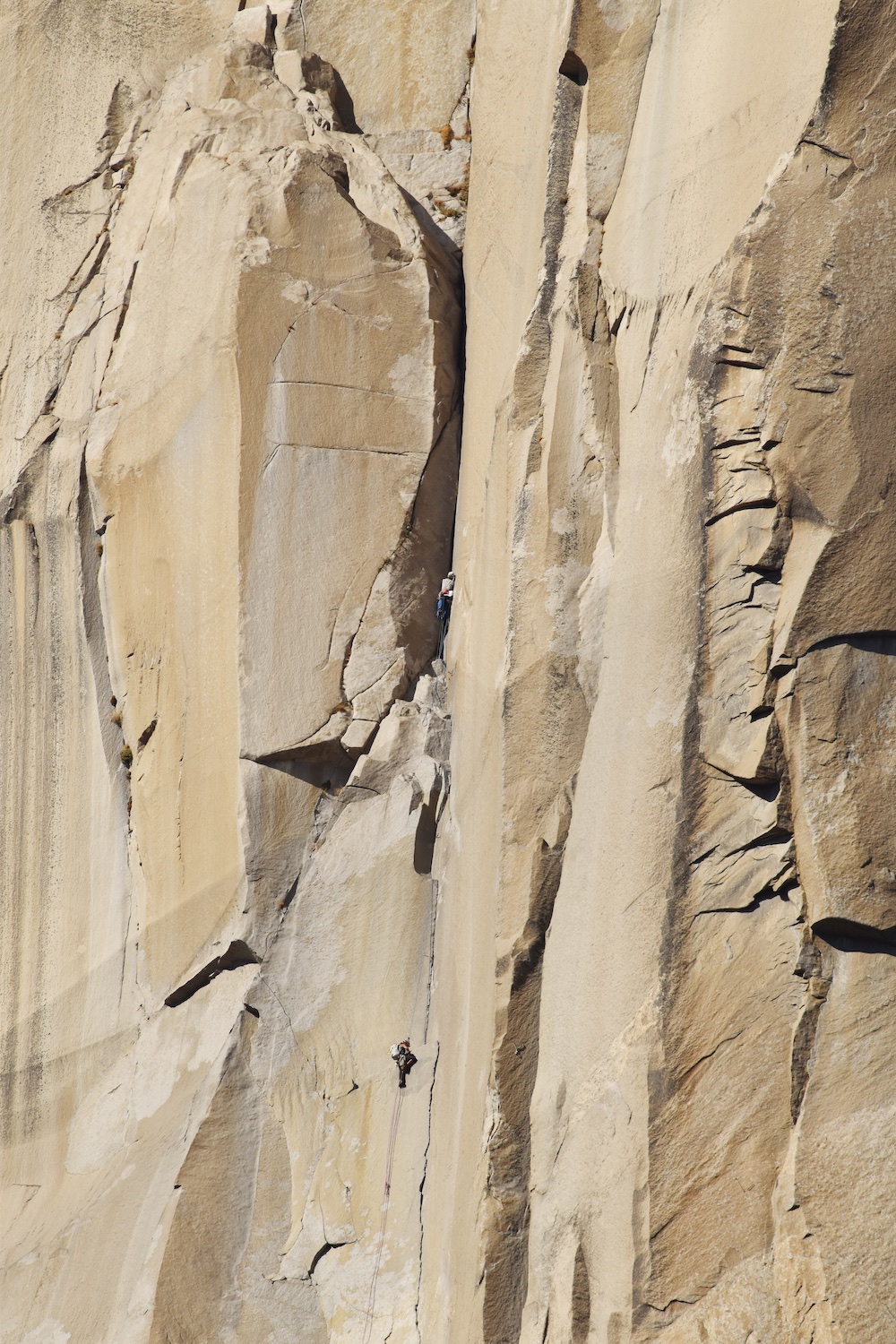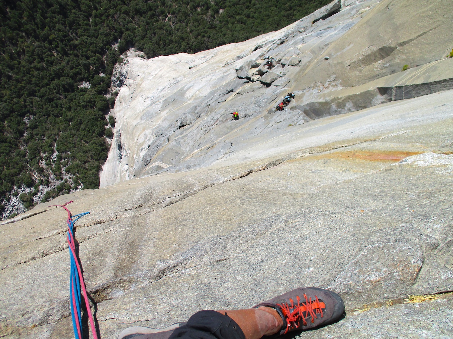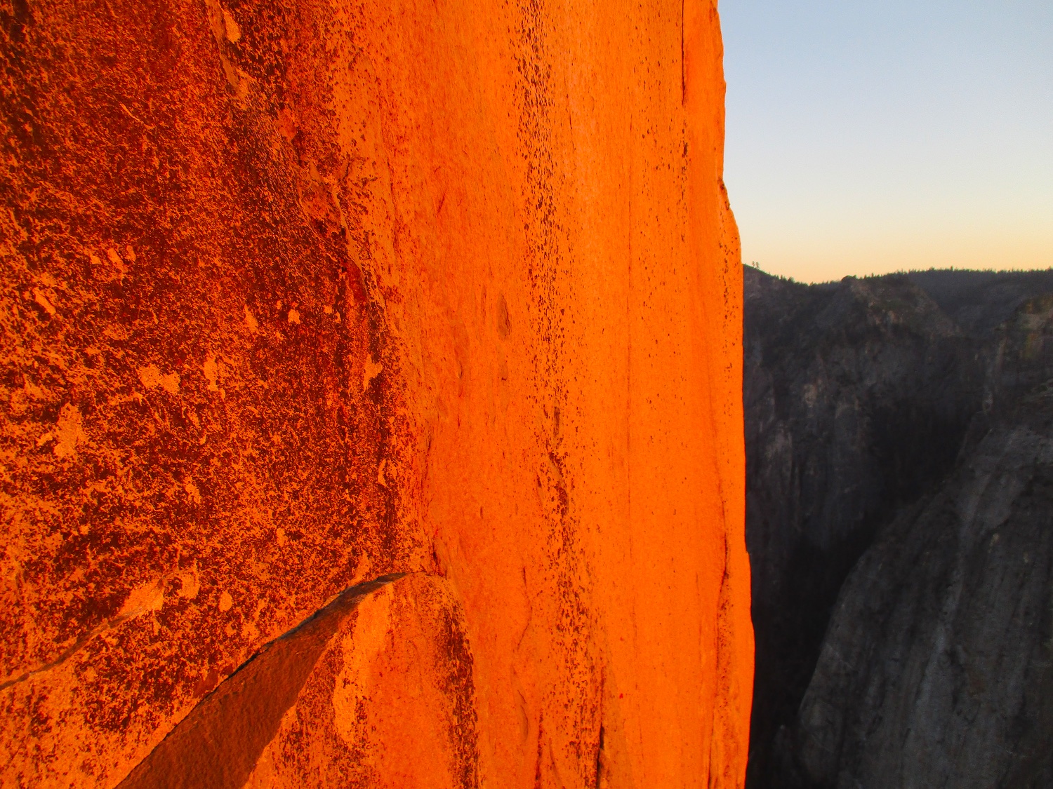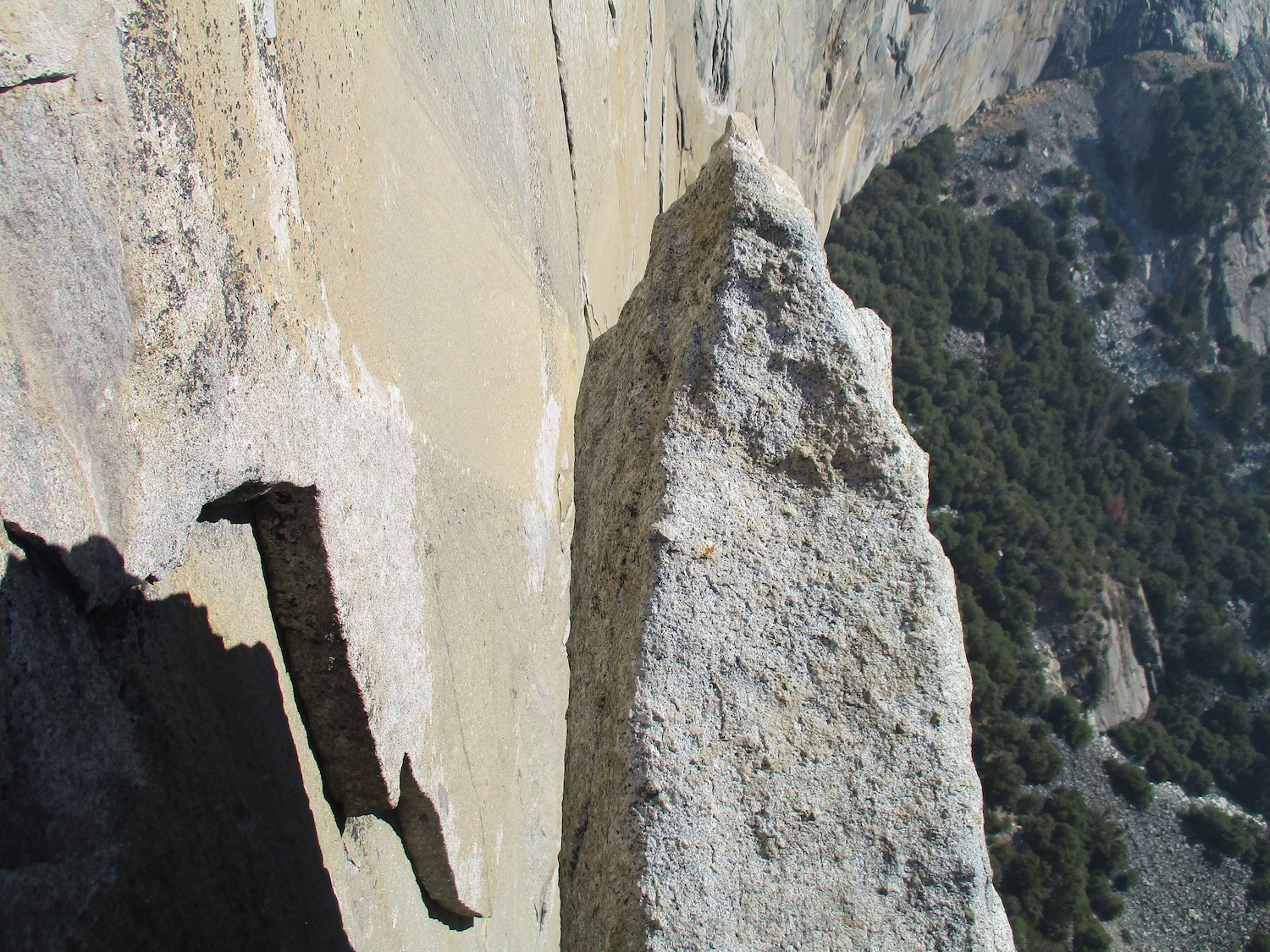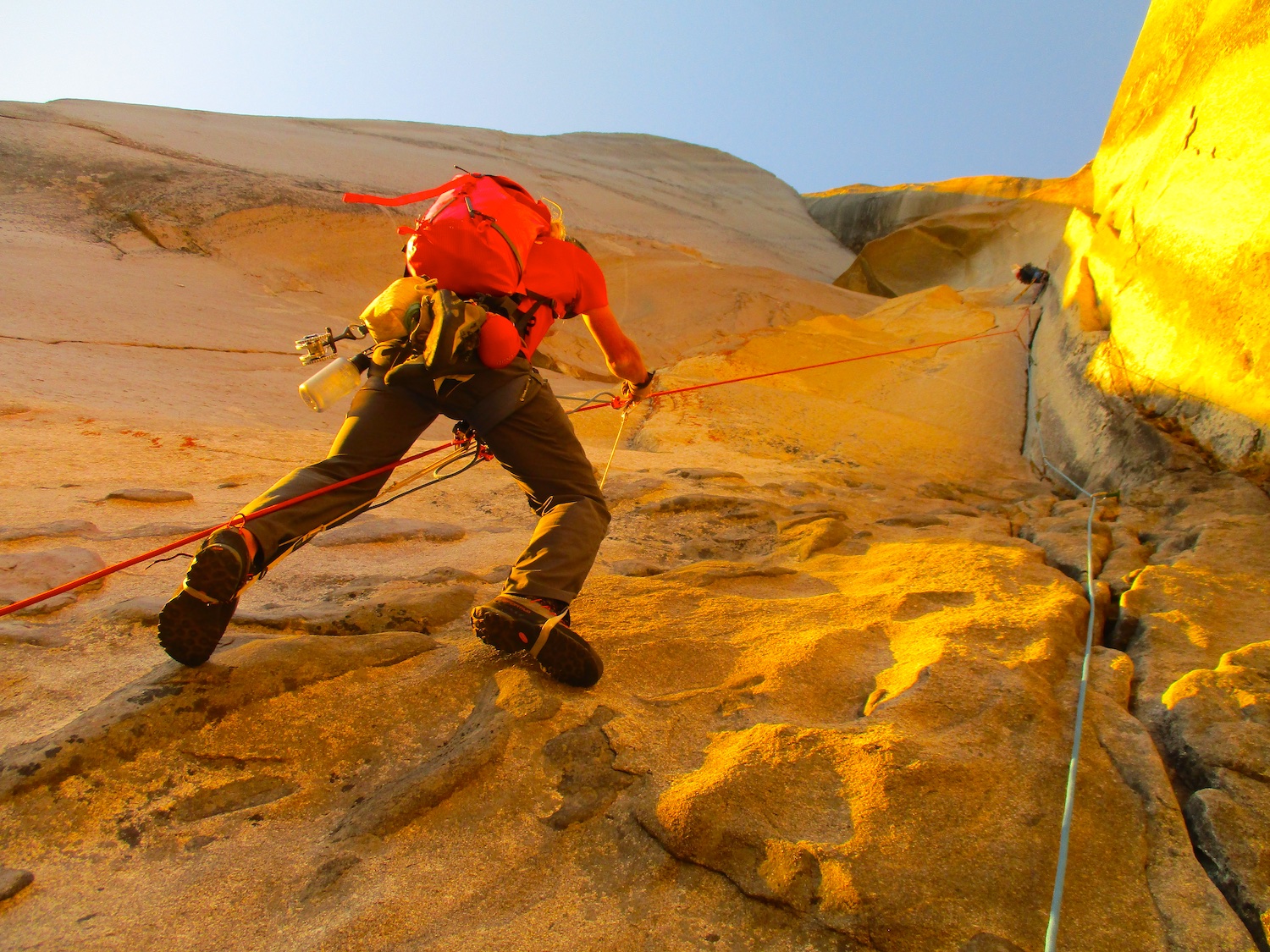 Nate and I climbed the route in just over 19 hours (I'm obviously not as fast as Eric Sloan...). To speed things up, Nate usually short-fixed and was already about 30-40 feet into the next pitch by the time I arrived at the anchor and put him on belay, and then passed him all of the gear I collected via his 45 foot tag line. It was a splitter October weekend, so there were several parties on the route—at least 3 NIAD parties and 5 hauling parties; we passed 6 parties and were passed by one party. Another factor to consider was the amount of daylight—sunrise at 7:06 am and sunset at 6:22 pm gave just over 11 hours of daylight. As follower, I carried the pack, which contained extra clothes, food, 1 gallon of water each (for a total of 16 lb of water starting off the route), and miscellaneous items like tape and batteries. I appreciated the athleticism of the day. Our bodies felt great, and the only real complaint on Sunday was we were a bit thirsty and our fingers hurt (my thumbnails had split back from all the jugging and Nate's pads were raw from touching 3000 feet of Yosemite granite). It was so nice to be back in the Valley again; I love this place. I took lots of photos.