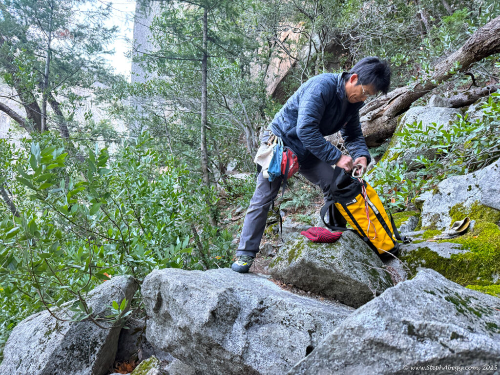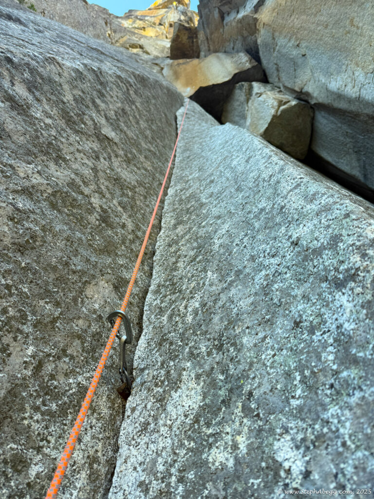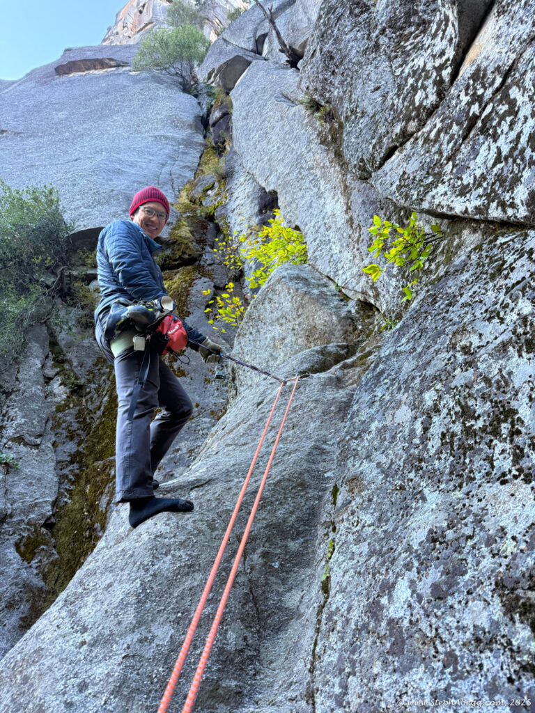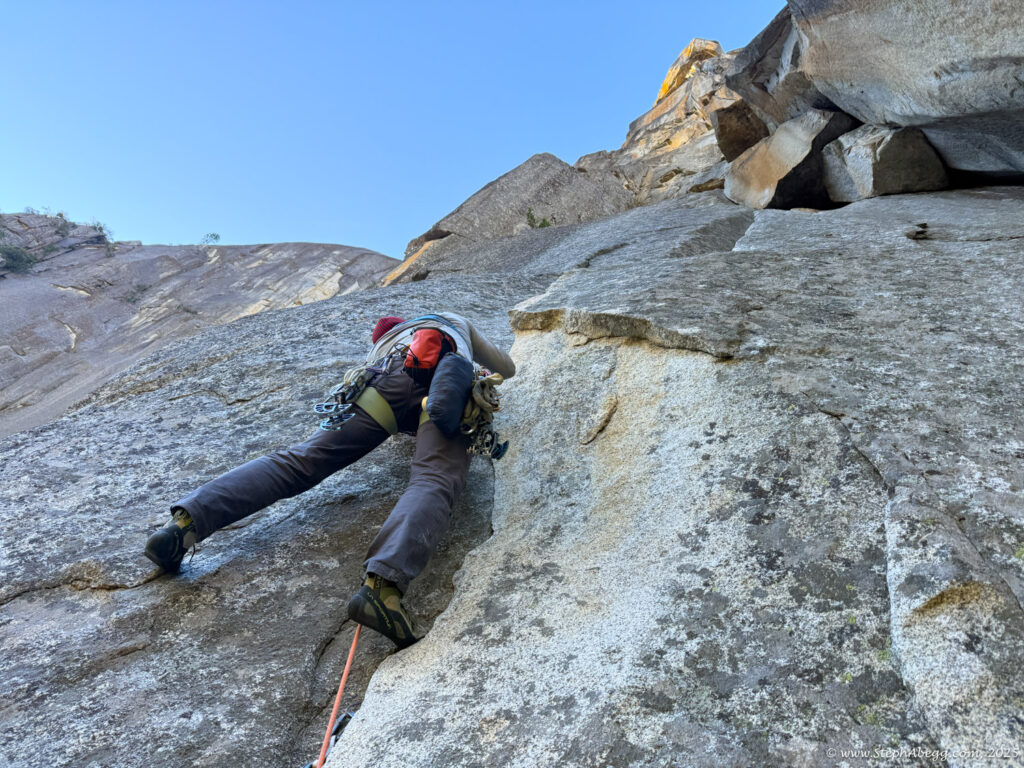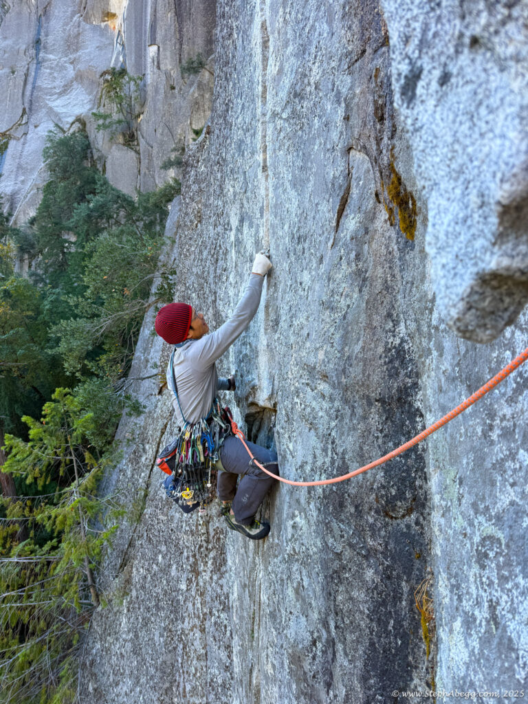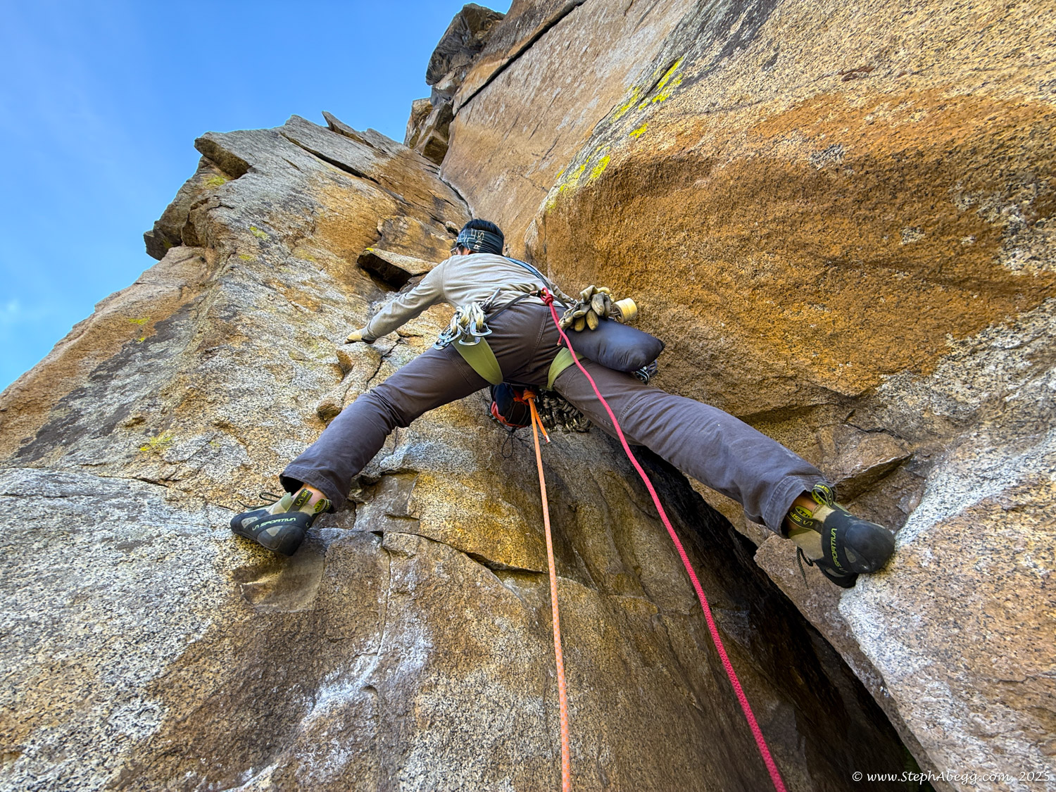 I climbed the Rostrum for the second time, about a year after my first go. This time we went as a team of three: the incredible Steve Su led the entire route while Nate and I toprope soloed in tandem. (This toprope soloing in tandem was somewhat of an experiment, but it seemed to work just fine.) Steve had been up the Rostrum at least eight times over the years, so he knew it well. We stashed our haul bag at the ledge three pitches up—something we hadn’t done on our previous ascent. It was a chilly start, but the day warmed up nicely. There were three parties on the route, and we were first in line.
