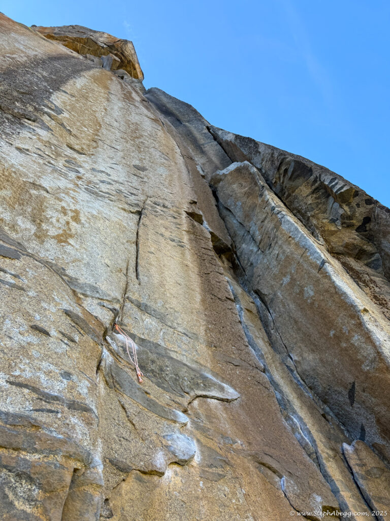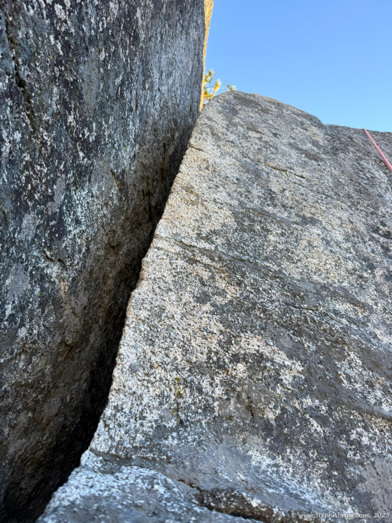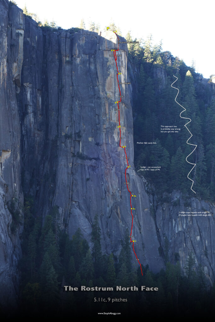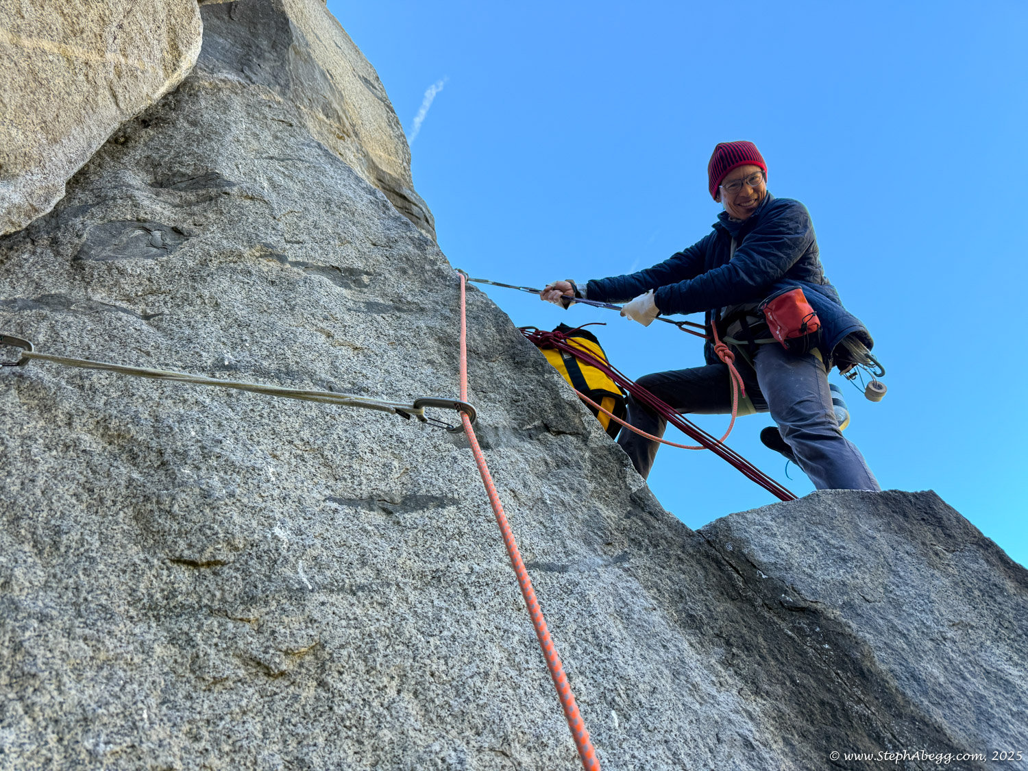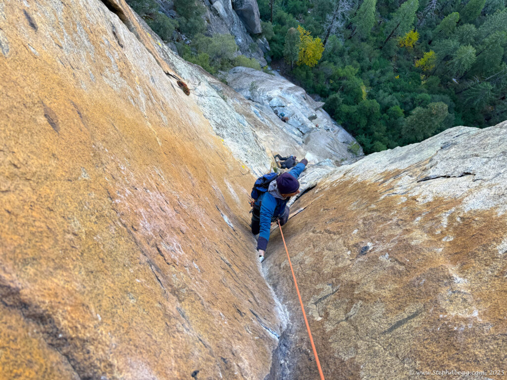 I climbed the Rostrum for the second time, about a year after my first go. This time we went as a team of three: the incredible Steve Su led the entire route while Nate and I toprope soloed in tandem. (This toprope soloing in tandem was somewhat of an experiment, but it seemed to work just fine.) Steve had been up the Rostrum at least eight times over the years, so he knew it well. We stashed our haul bag at the ledge three pitches up—something we hadn’t done on our previous ascent. It was a chilly start, but the day warmed up nicely. There were three parties on the route, and we were first in line.