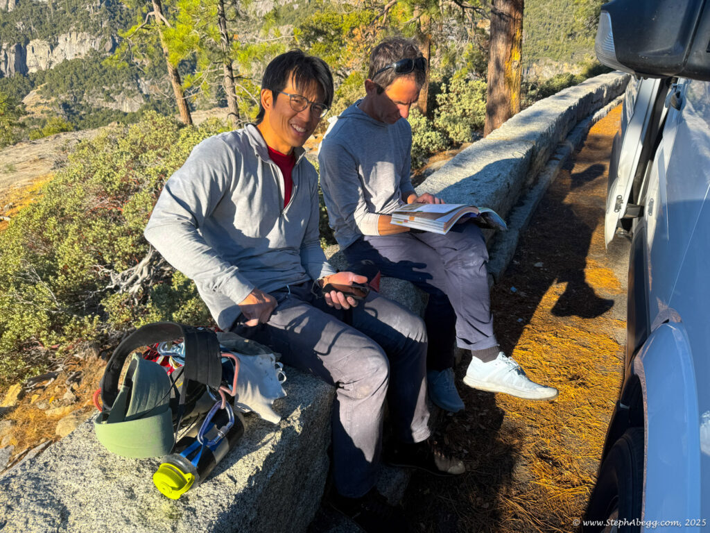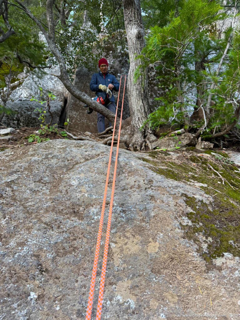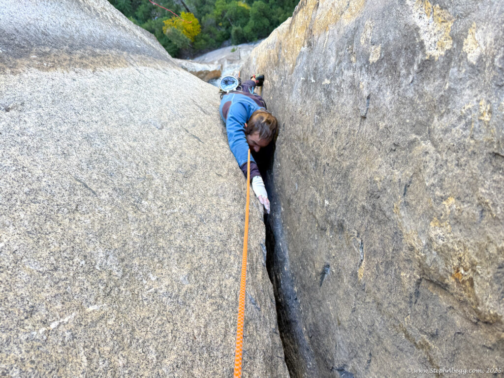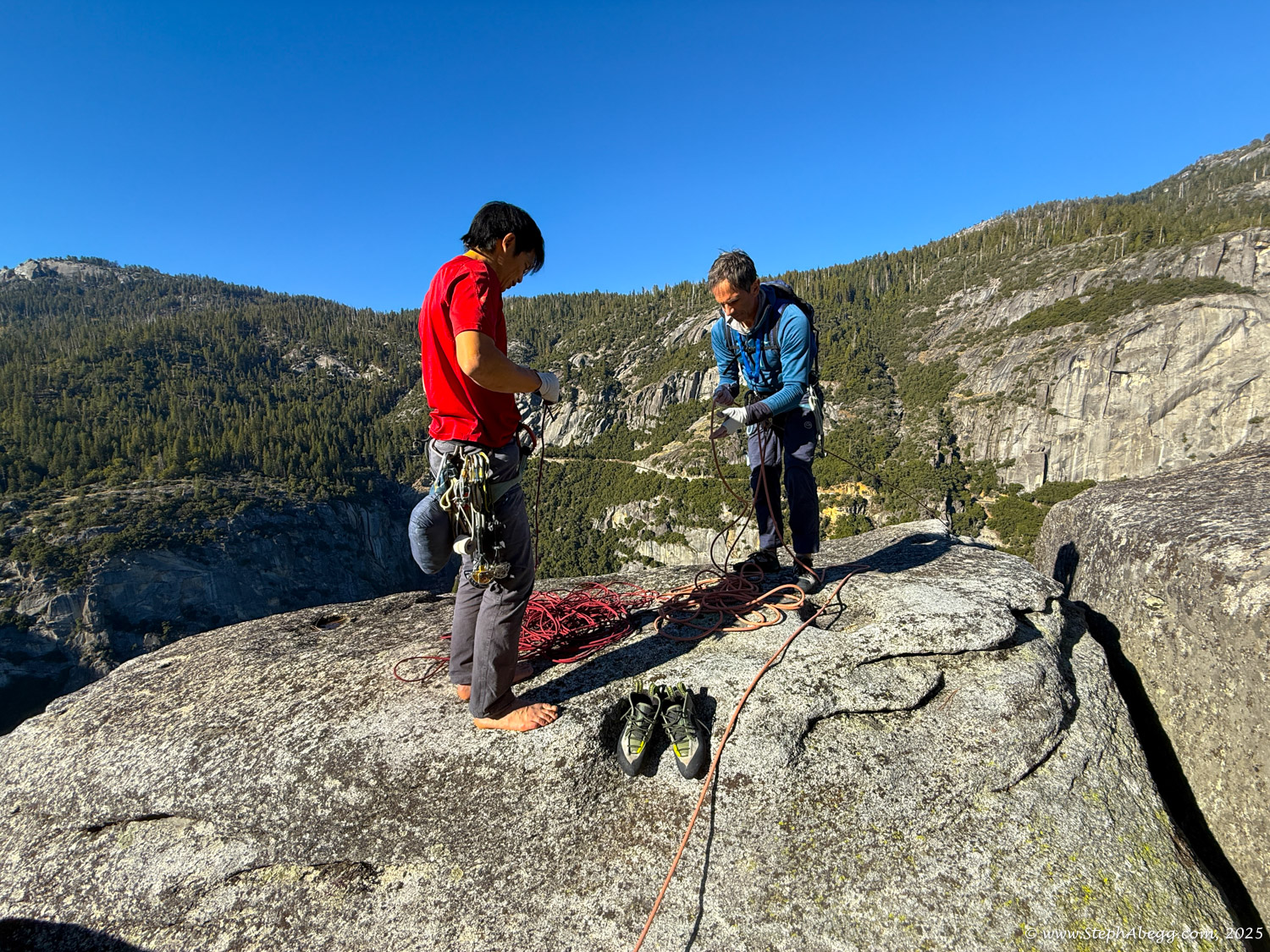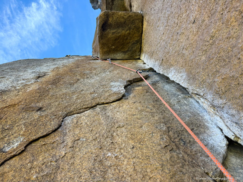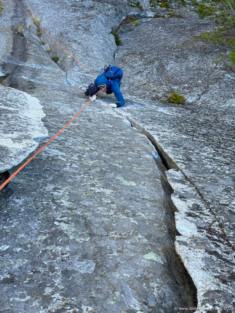 I climbed the Rostrum for the second time, about a year after my first go. This time we went as a team of three: the incredible Steve Su led the entire route while Nate and I toprope soloed in tandem. (This toprope soloing in tandem was somewhat of an experiment, but it seemed to work just fine.) Steve had been up the Rostrum at least eight times over the years, so he knew it well. We stashed our haul bag at the ledge three pitches up—something we hadn’t done on our previous ascent. It was a chilly start, but the day warmed up nicely. There were three parties on the route, and we were first in line.