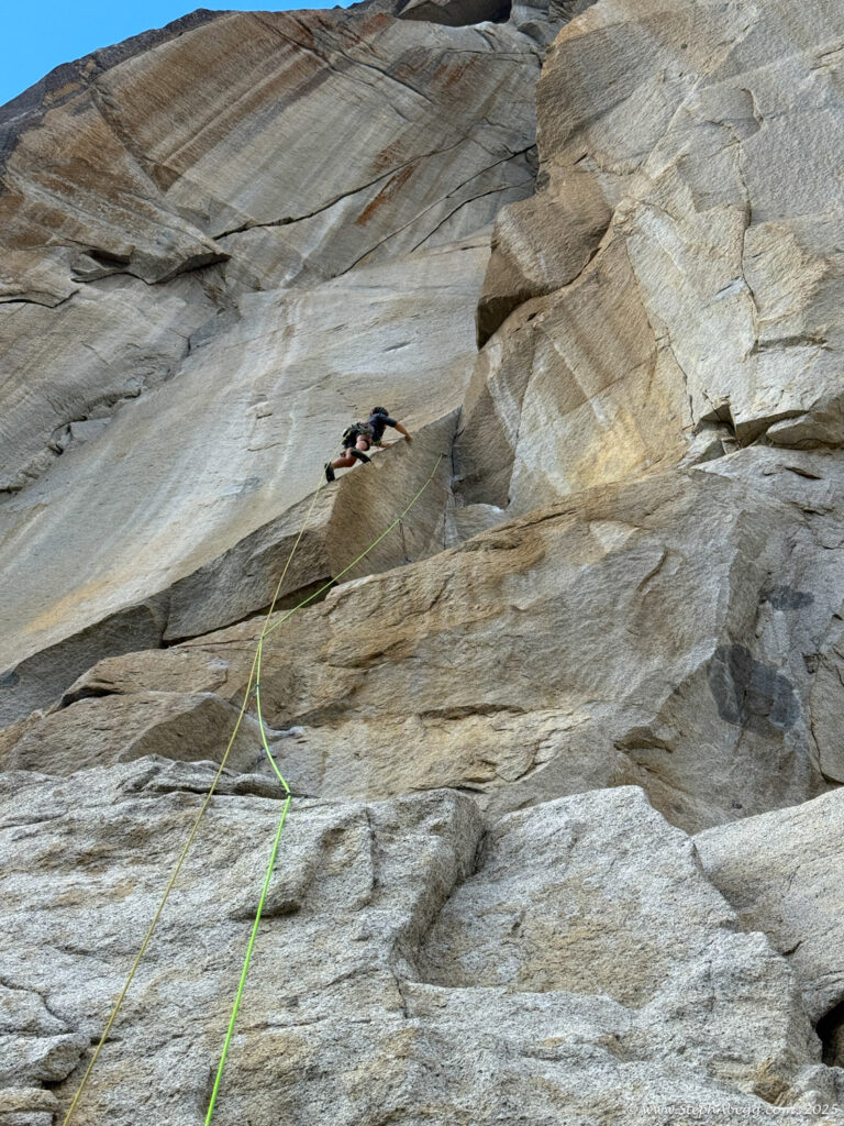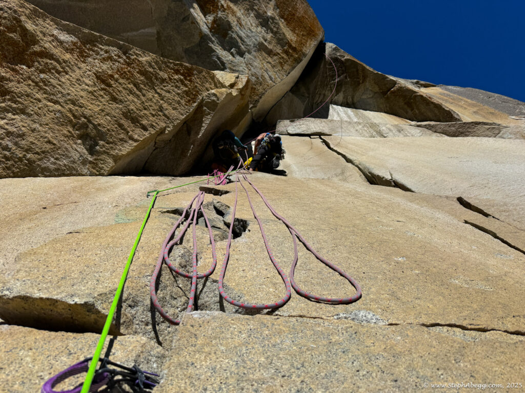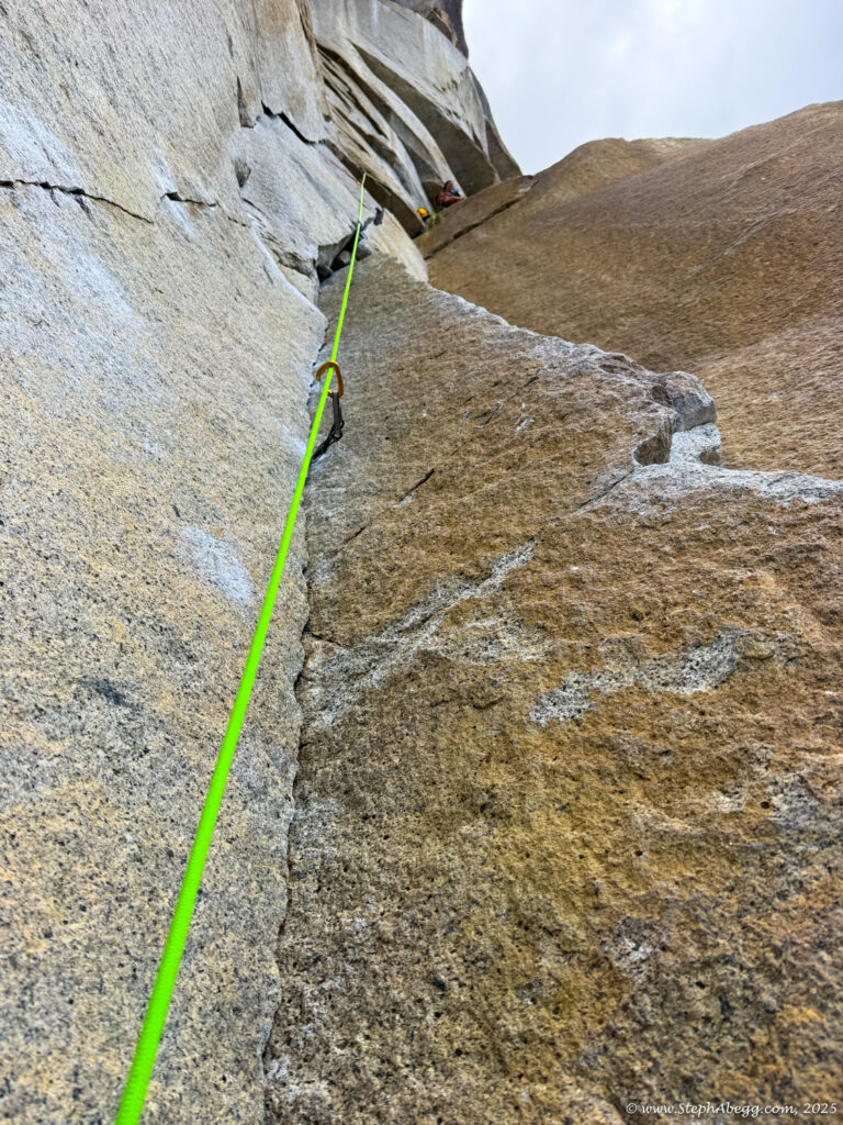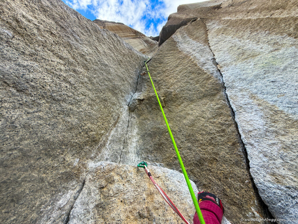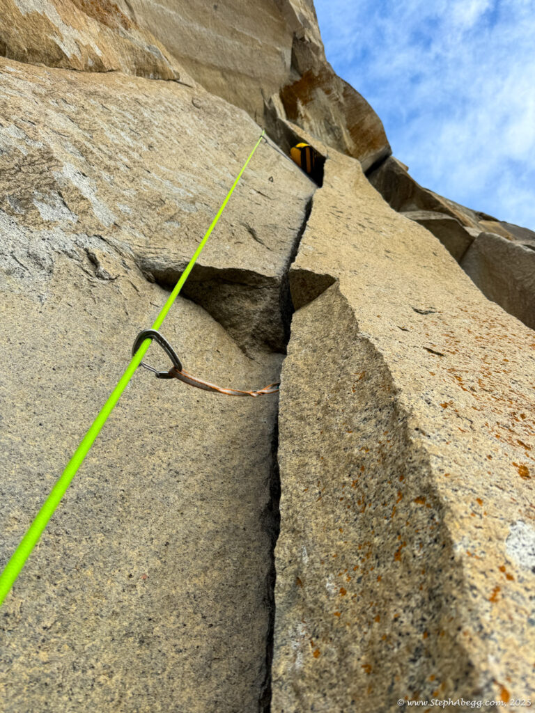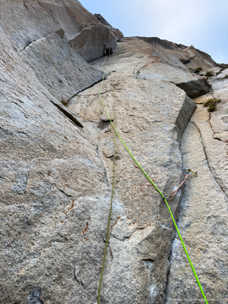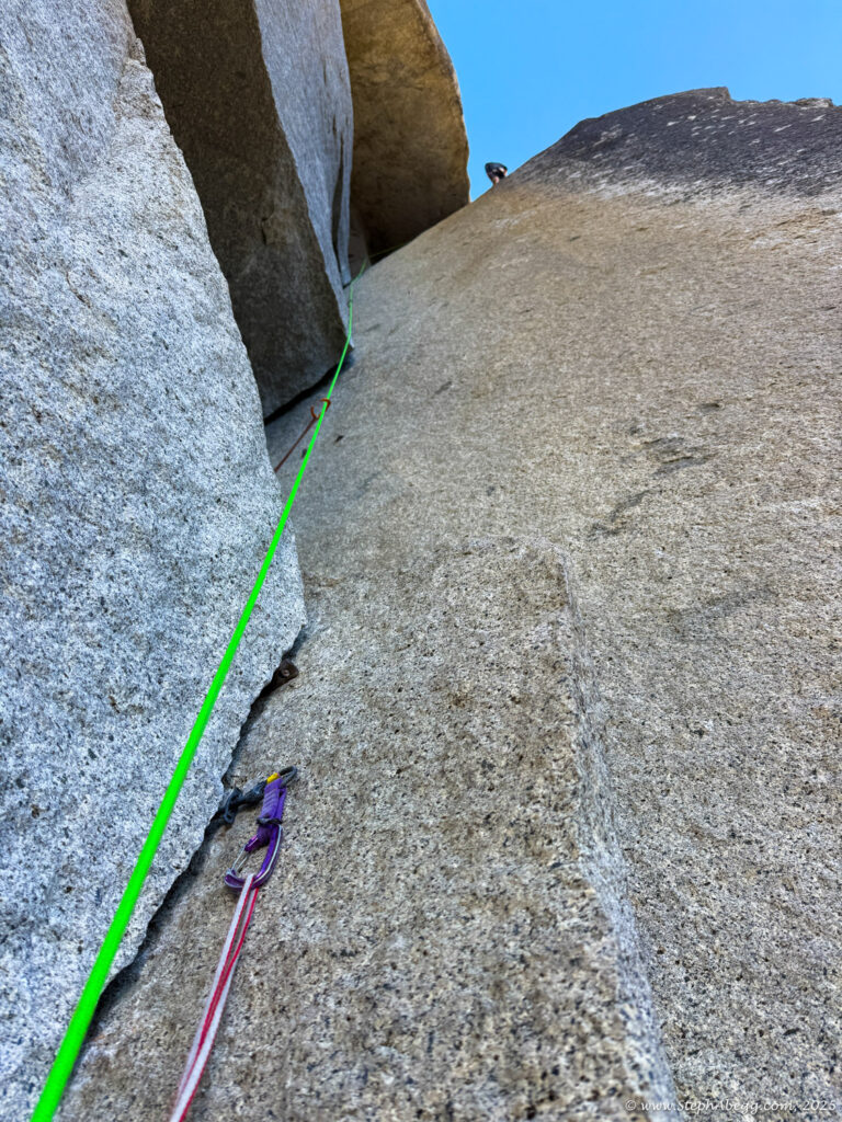 I led every pitch, and Brooke followed in fix-and-follow mode. Three parties were on the route—one ahead and one behind us, all doing