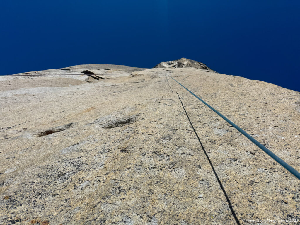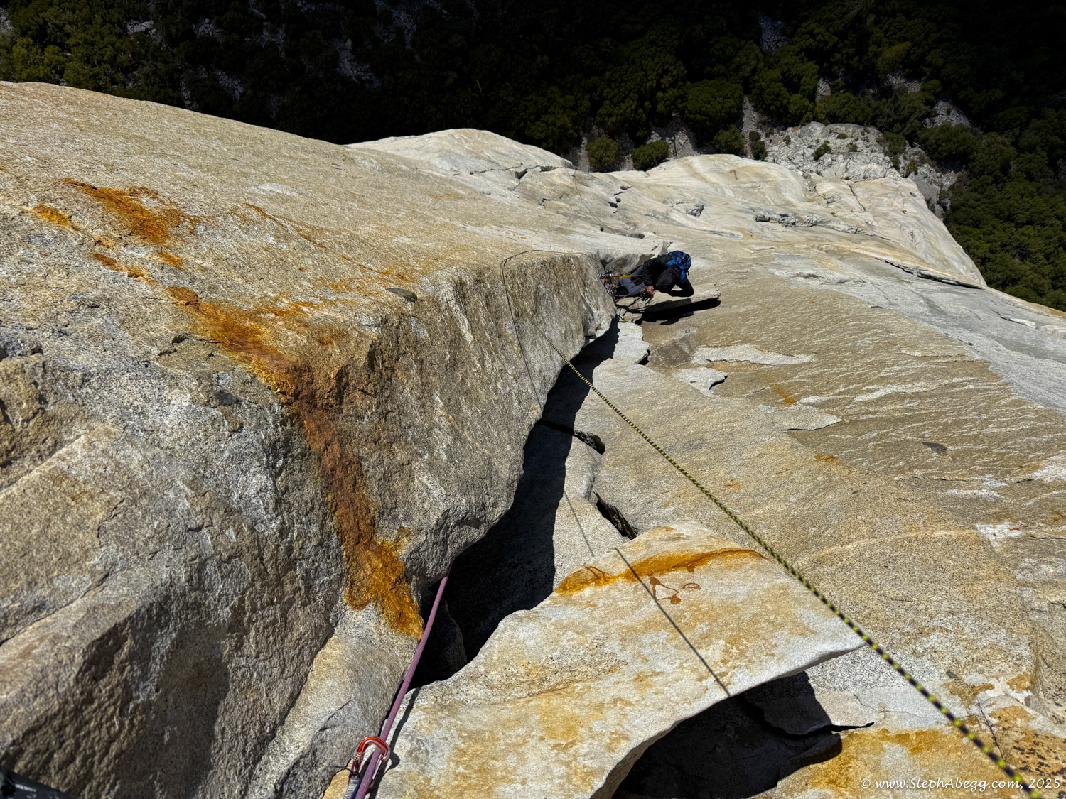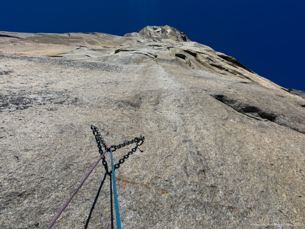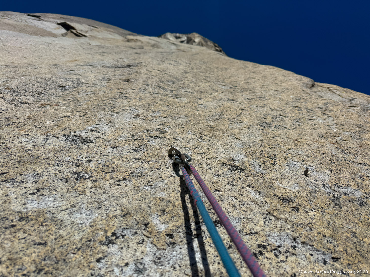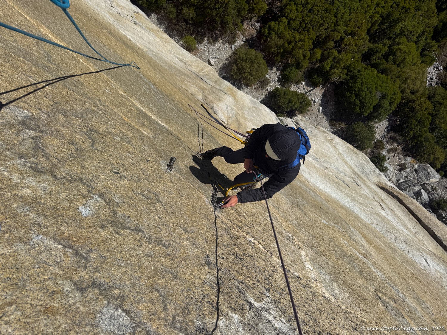 We timed our start so that we began Pitch 1 just as headlamps were no longer needed. I climbed mostly in a mix of free and French-free style. At each anchor, I pulled up about 40 feet of rope, fixed it, yelled down that the rope was fixed, and then short-fixed the beginning of the next pitch until Nate reached the anchor and put me on belay. Up to Sickle Ledge, for each short-fix segment I self-belayed with a GriGri, but after that I just accepted the “death loop” of slack in the fixed 40 feet. We used a 40-foot tag line for gear transfers—Nate would clip the cleaned gear to it, I’d haul it up, resupply, and keep going. I back-cleaned a bit to conserve gear and managed the follower pendulums along the way.
