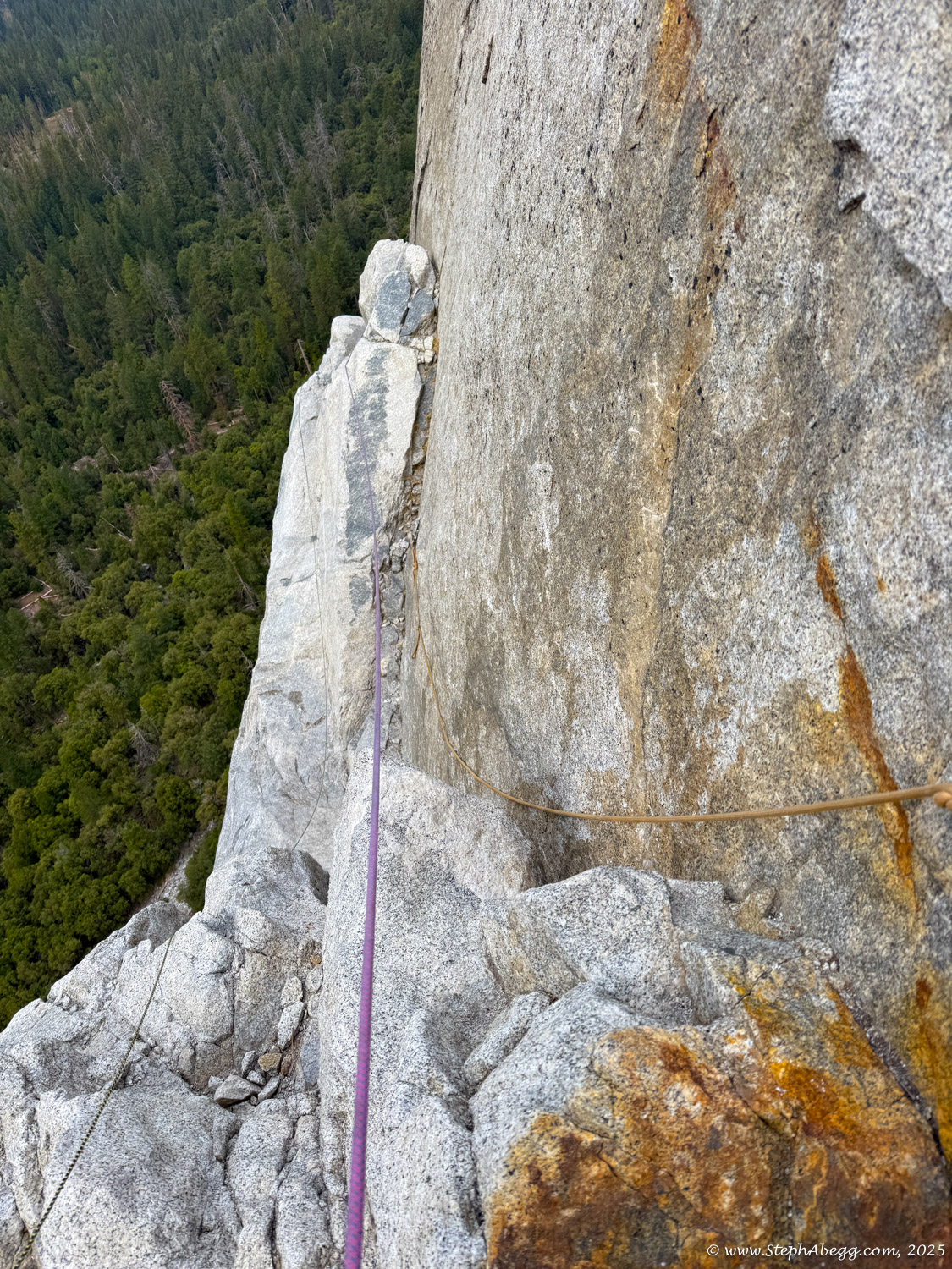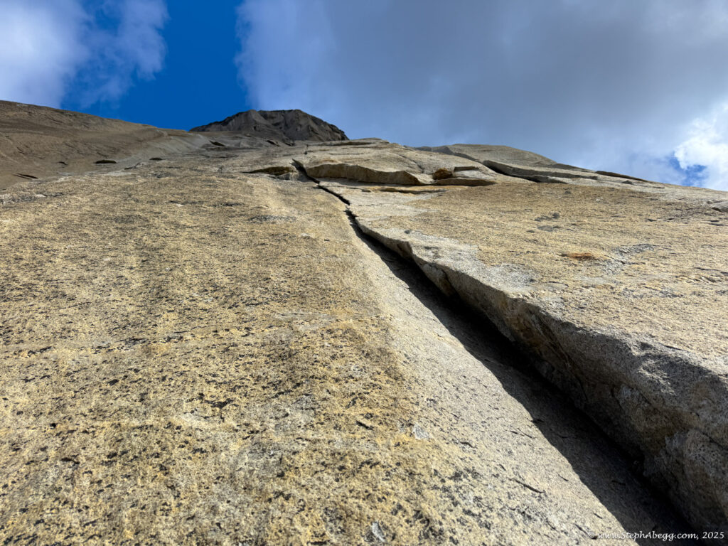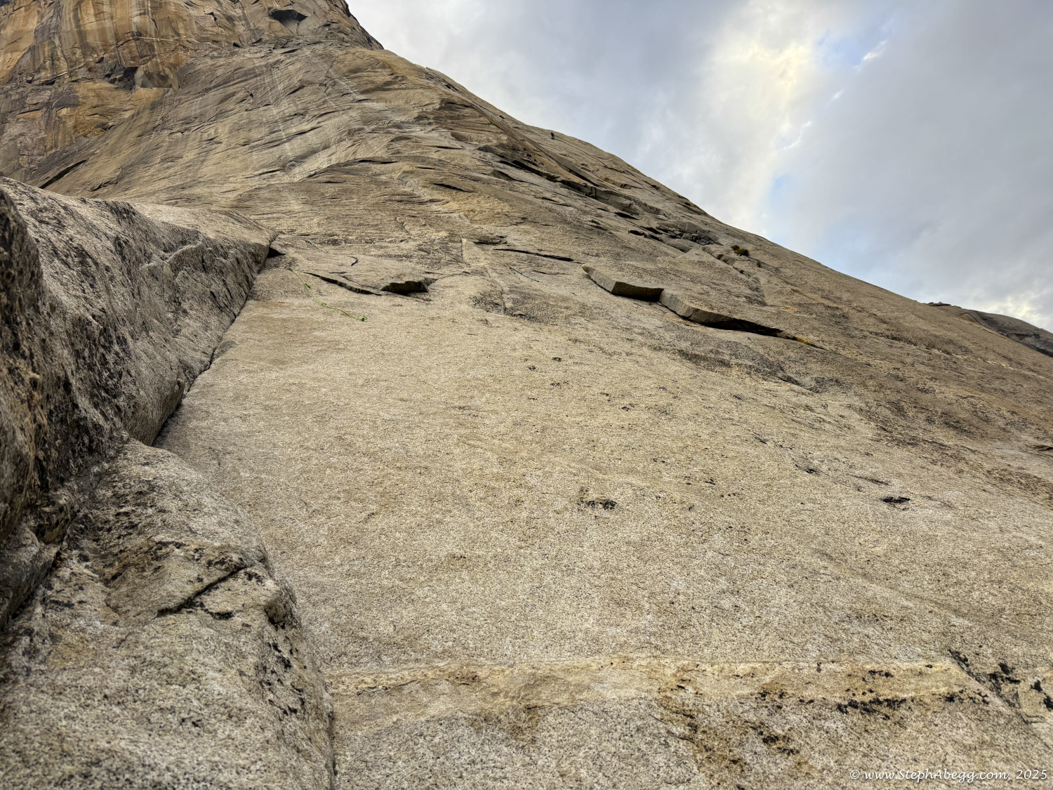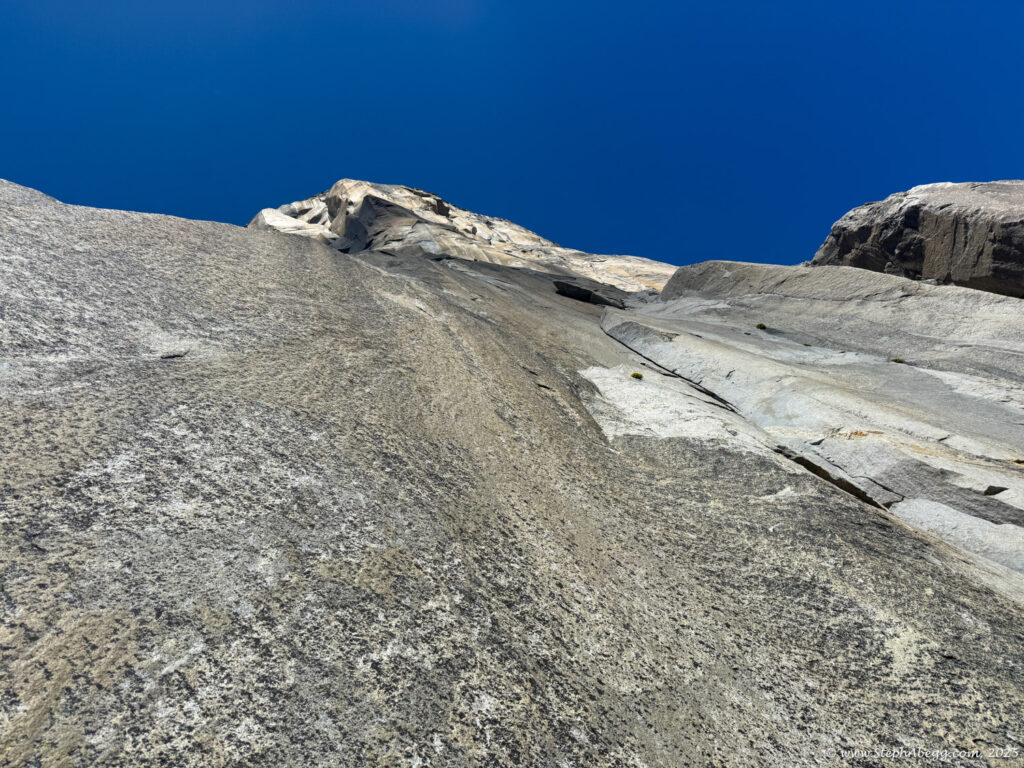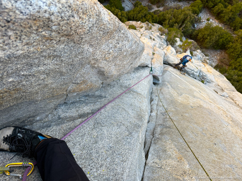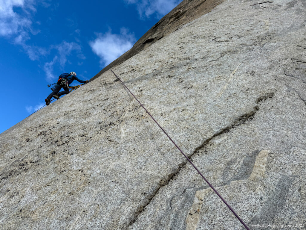 We timed our start so that we began Pitch 1 just as headlamps were no longer needed. I climbed mostly in a mix of free and French-free style. At each anchor, I pulled up about 40 feet of rope, fixed it, yelled down that the rope was fixed, and then short-fixed the beginning of the next pitch until Nate reached the anchor and put me on belay. Up to Sickle Ledge, for each short-fix segment I self-belayed with a GriGri, but after that I just accepted the “death loop” of slack in the fixed 40 feet. We used a 40-foot tag line for gear transfers—Nate would clip the cleaned gear to it, I’d haul it up, resupply, and keep going. I back-cleaned a bit to conserve gear and managed the follower pendulums along the way.