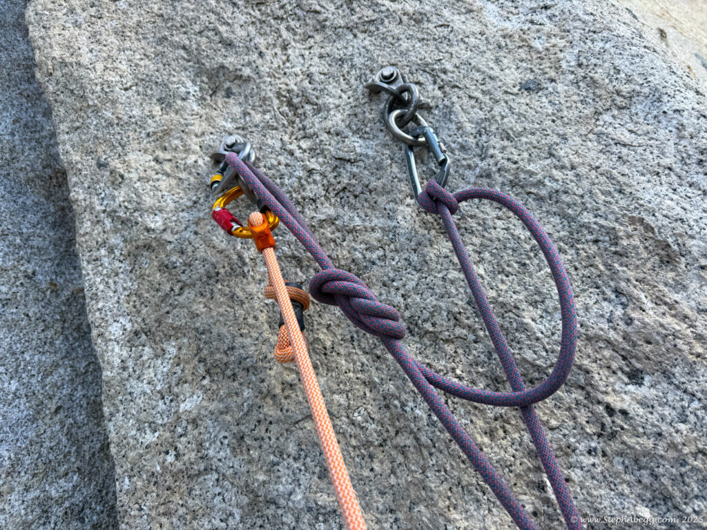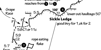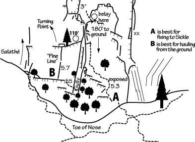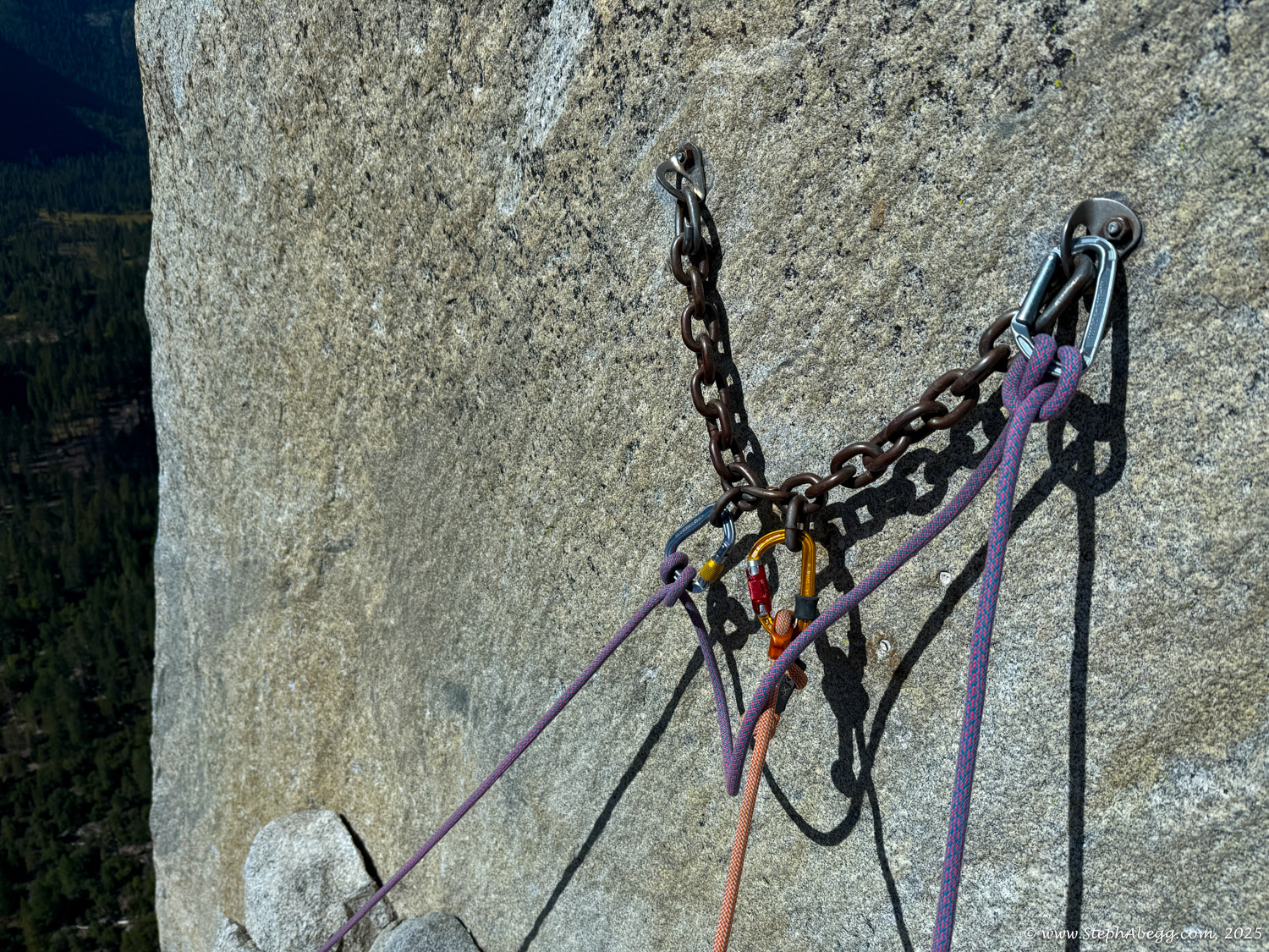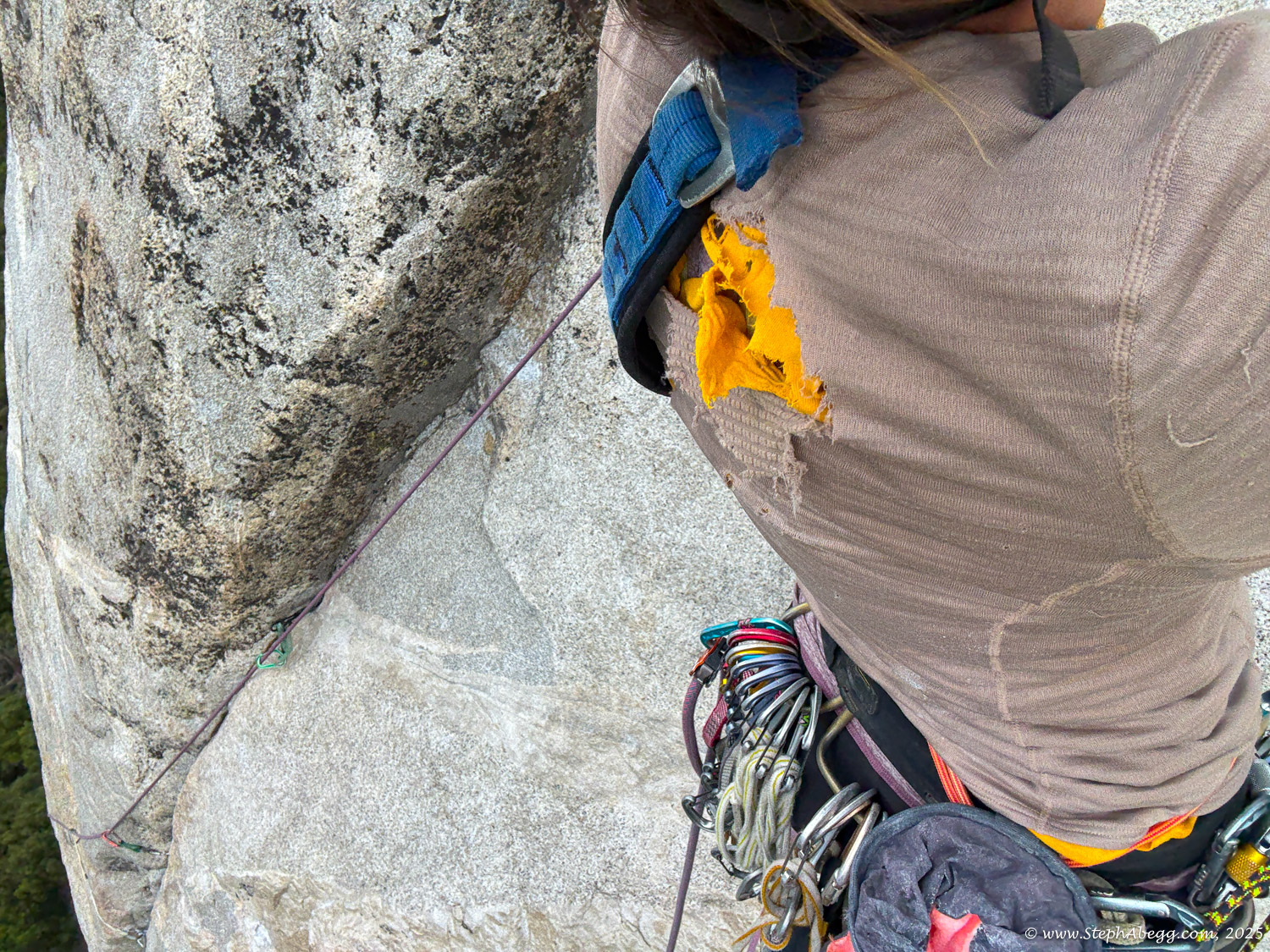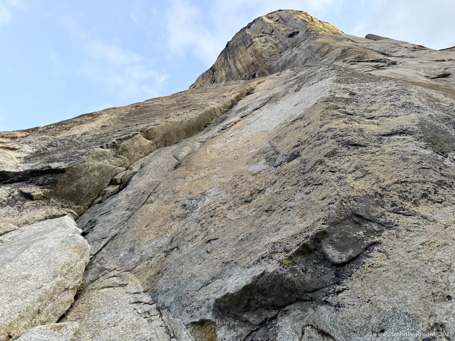 We timed our start so that we began Pitch 1 just as headlamps were no longer needed. I climbed mostly in a mix of free and French-free style. At each anchor, I pulled up about 40 feet of rope, fixed it, yelled down that the rope was fixed, and then short-fixed the beginning of the next pitch until Nate reached the anchor and put me on belay. Up to Sickle Ledge, for each short-fix segment I self-belayed with a GriGri, but after that I just accepted the “death loop” of slack in the fixed 40 feet. We used a 40-foot tag line for gear transfers—Nate would clip the cleaned gear to it, I’d haul it up, resupply, and keep going. I back-cleaned a bit to conserve gear and managed the follower pendulums along the way.