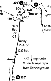 Our total time was 4 hours and 40 minutes from when I started Pitch 1 to when Nate topped out on Dolt Tower. If my fall cost us about 10 minutes, that works out to roughly an 18-hour NIAD pace with me leading—not blazing fast, but respectable. Nate’s onsight NIAD time in 2010 is around 11.5 hours (reaching Dolt in under 3 hours), so he’s clearly the faster half of our team, whether I’m leading or jugging.