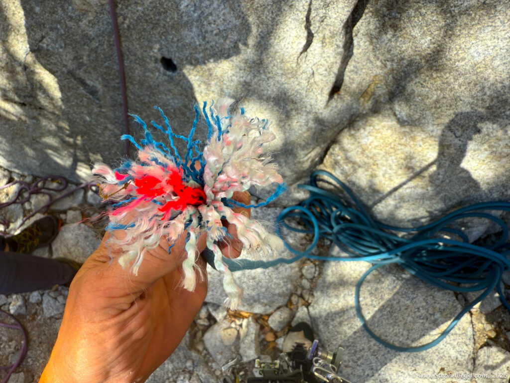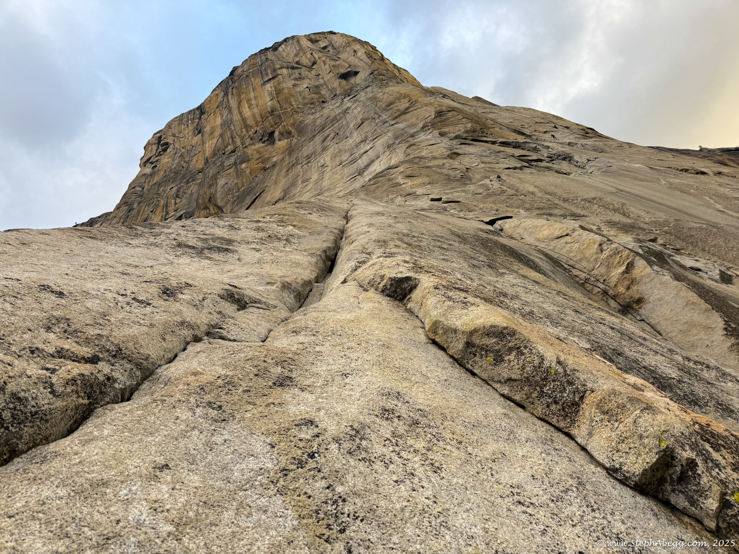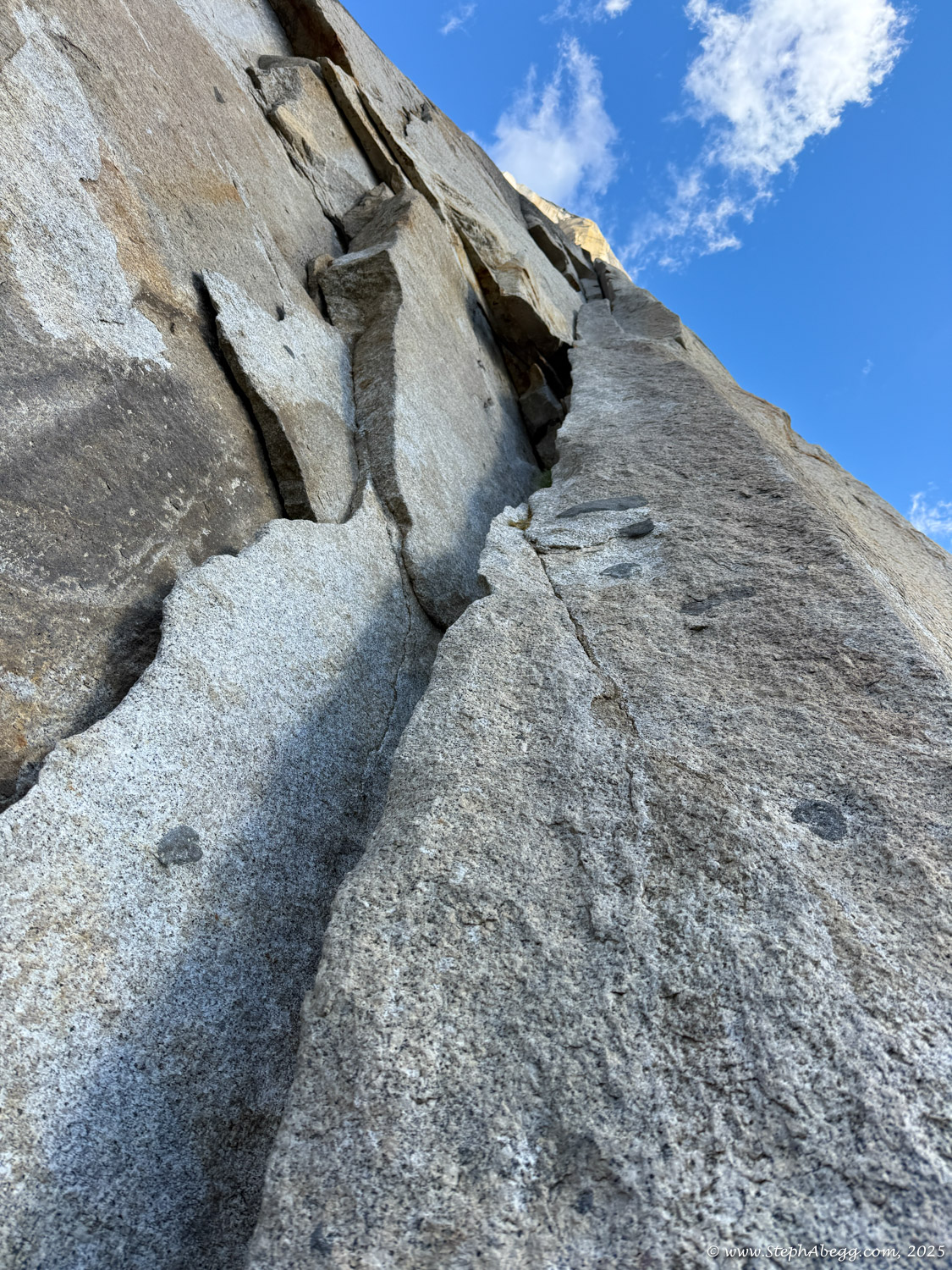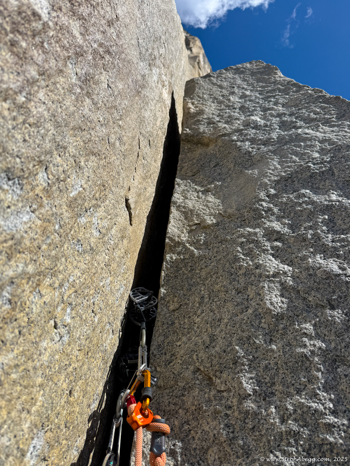 Less than an hour into the route, midway up Pitch 2, on normal belay and not short-fixing, I took the biggest whipper of my life when a cam popped out of a pin scar. The cam below ripped as well, and I was caught by a 0.2 C4. I ended up on my back, head-down. I don’t think I hit my head, but my helmet cracked in the back. I had thought the cam was bomber and had just back-cleaned the one below—it’s possible a trigger wire got pulled or snagged in the scar and dislodged it. My back was sore, and I had shimmering across my vision for the next two pitches—"retinal migraine" says Google, which can be caused by sudden stress—but I was determined to keep going.