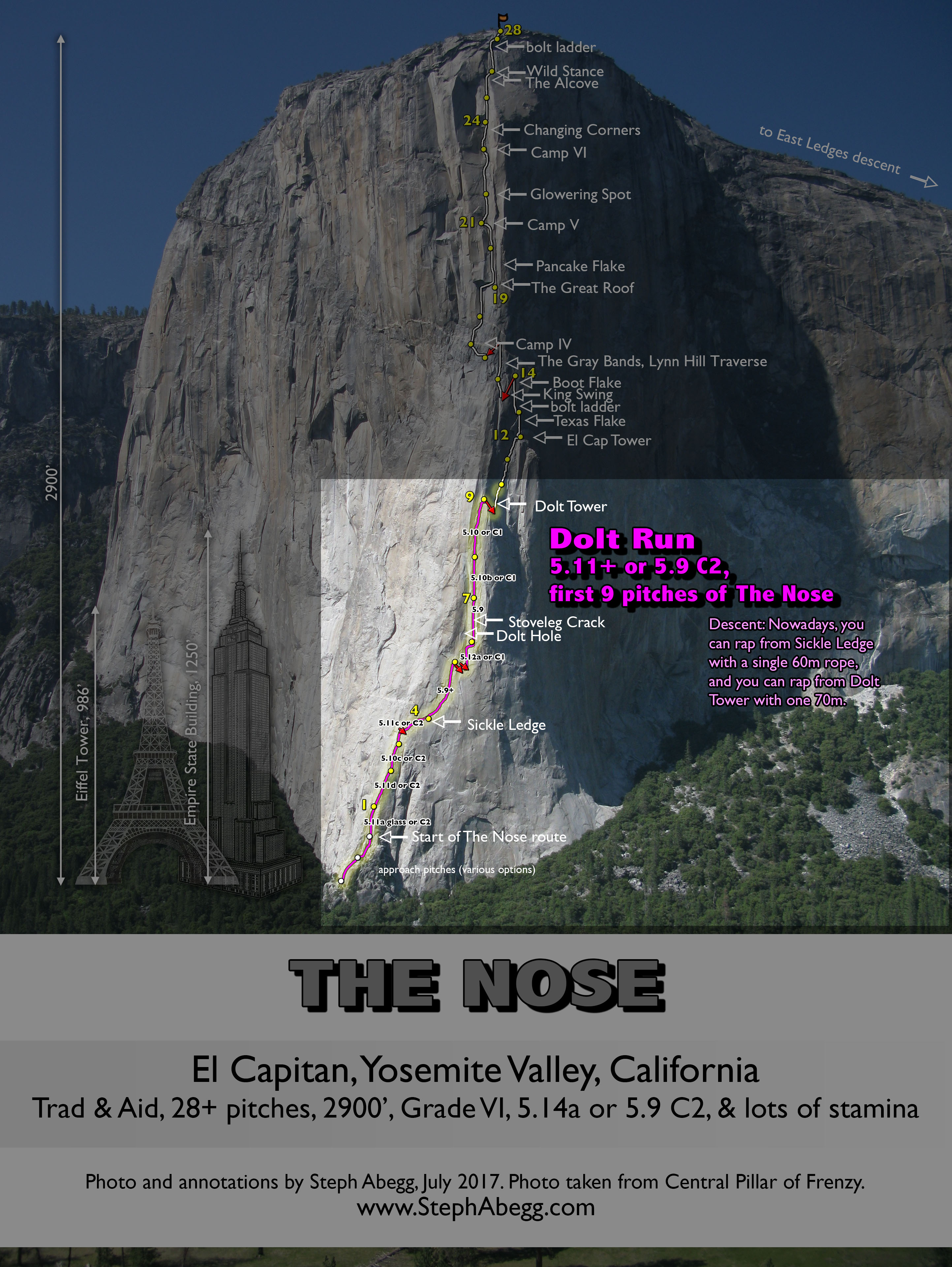 A “Dolt Run” refers to climbing the first nine pitches of The Nose on El Capitan, up to Dolt Tower. From there, it’s possible to rappel with a single 70m rope. Many parties do a Dolt Run to gauge their speed and readiness for a Nose-in-a-Day (NIAD) attempt. Typically, a Dolt Run takes about 25% of the time it would take to complete a full NIAD ascent.