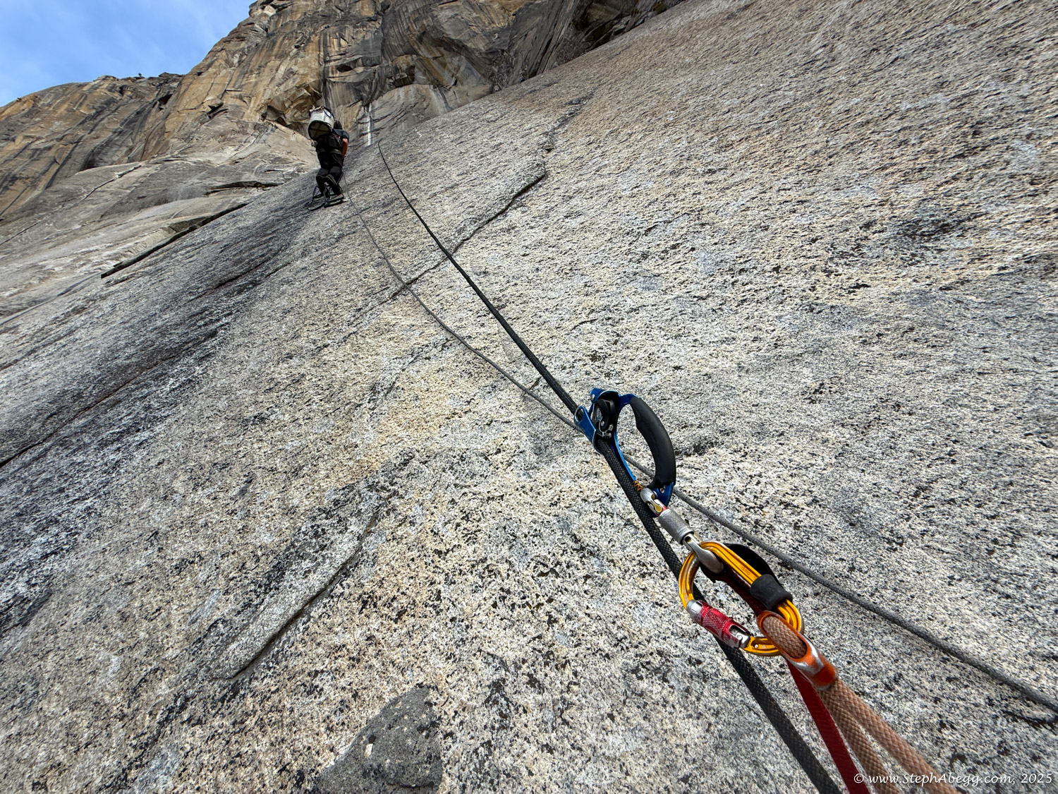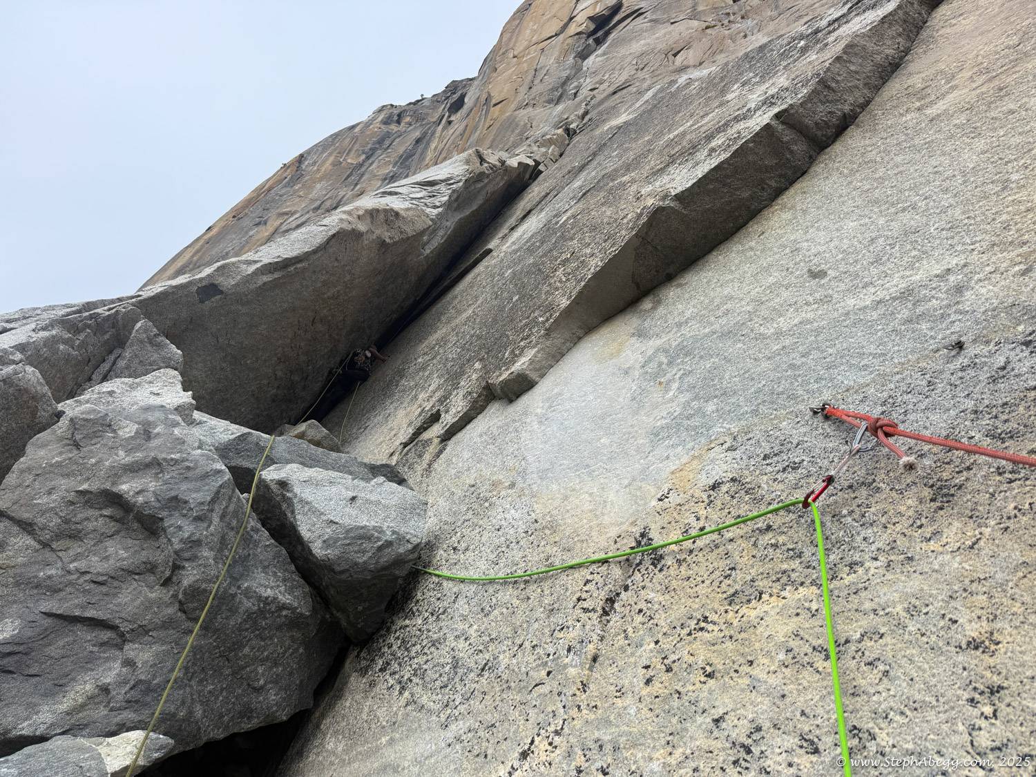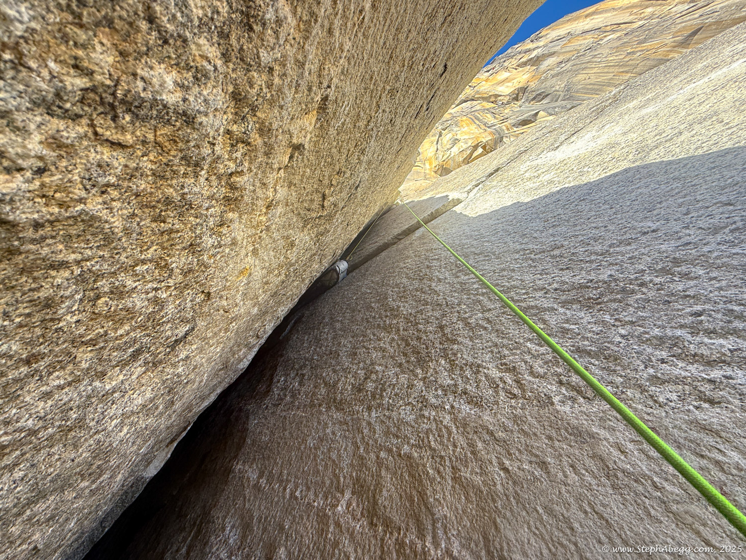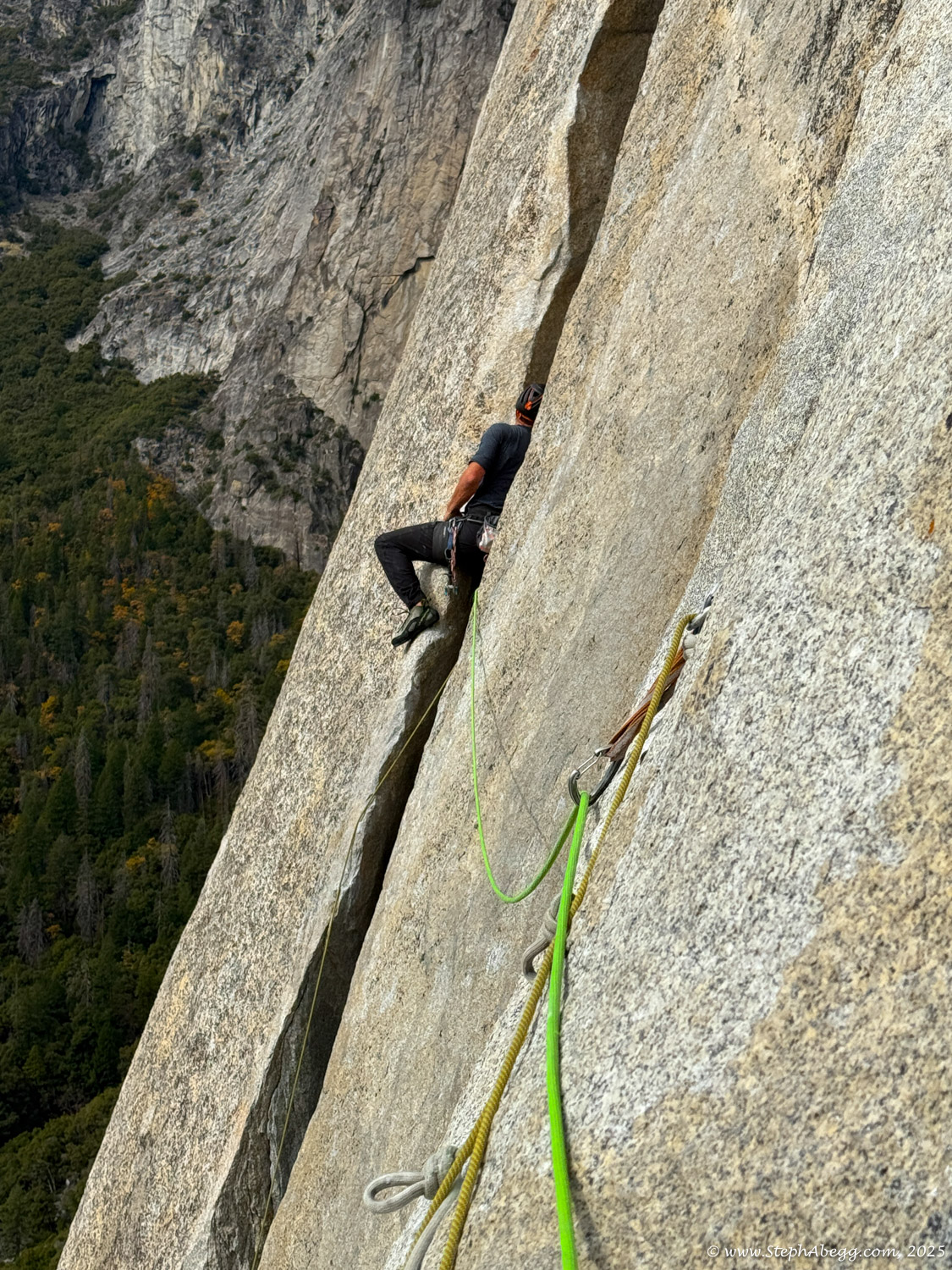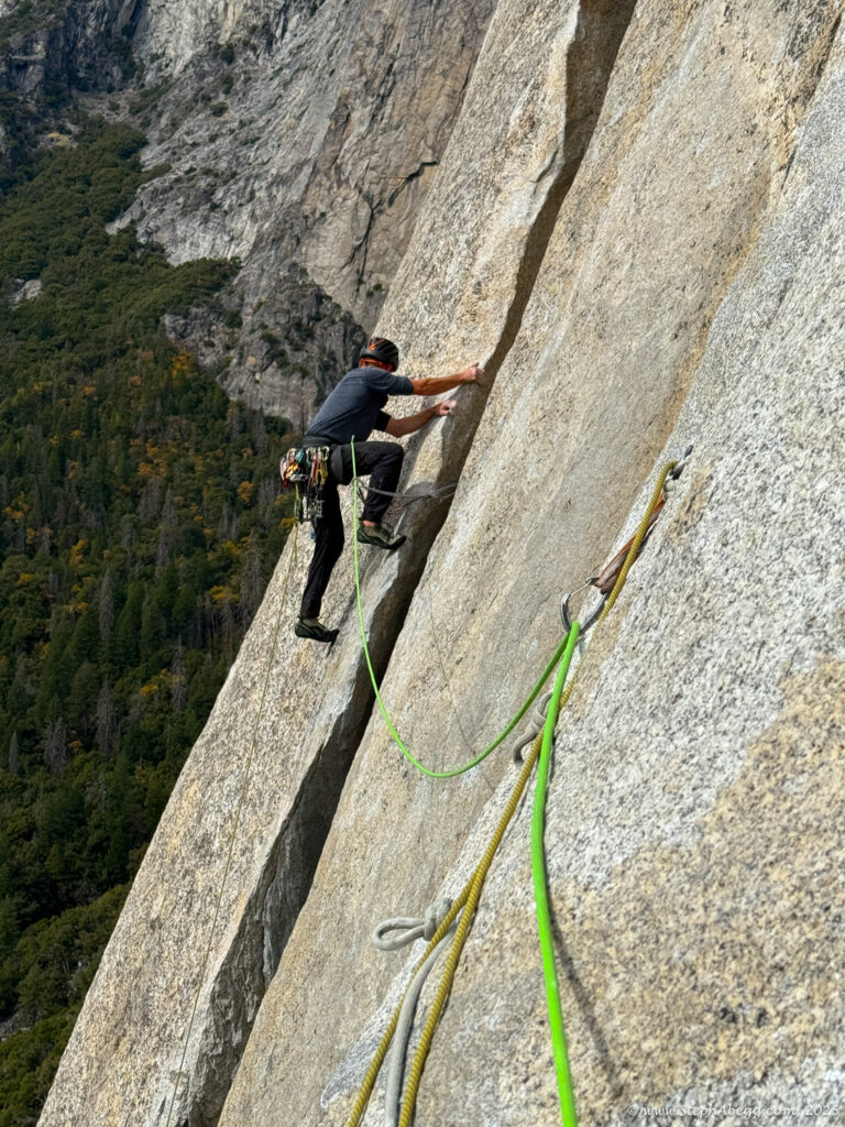 Freerider, plus the descent down to Heart Ledge (which counts as Pitch 9)—so we planned to jug the fixed lines up to Heart Ledge and start climbing from there. The day’s main goal was to reach the Monster Offwidth (Pitch 15), though we weren’t sure how long the Hollow Flake (Pitch 11) would take us, so we figured we’d just see how far we could get.