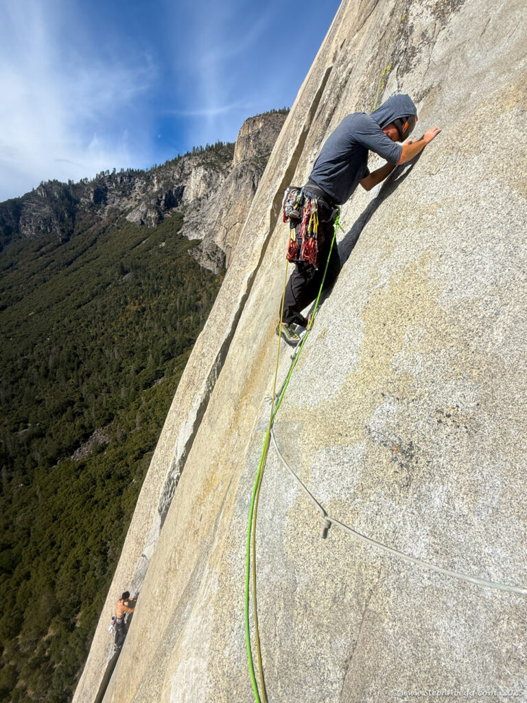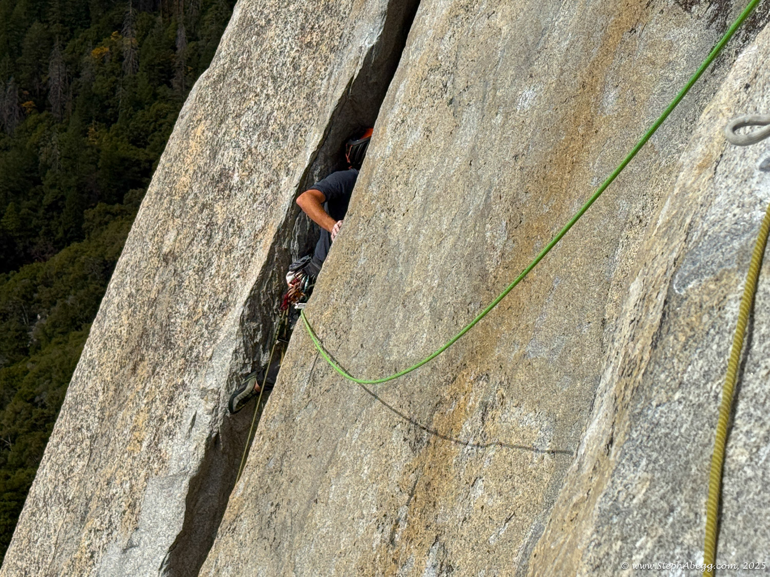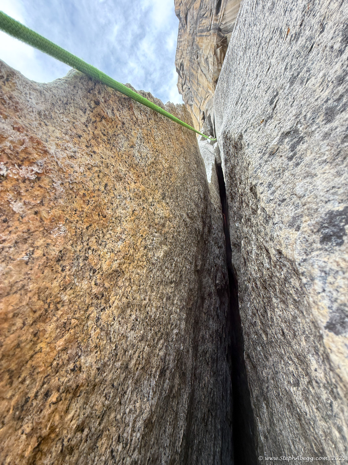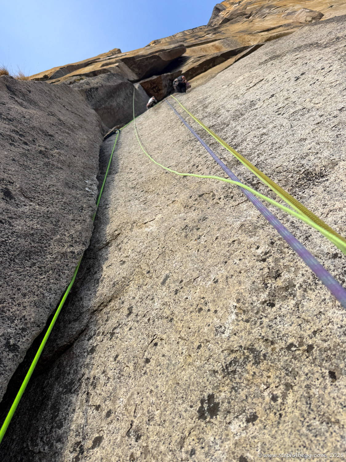 Freerider, plus the descent down to Heart Ledge (which counts as Pitch 9)—so we planned to jug the fixed lines up to Heart Ledge and start climbing from there. The day’s main goal was to reach the Monster Offwidth (Pitch 15), though we weren’t sure how long the Hollow Flake (Pitch 11) would take us, so we figured we’d just see how far we could get.