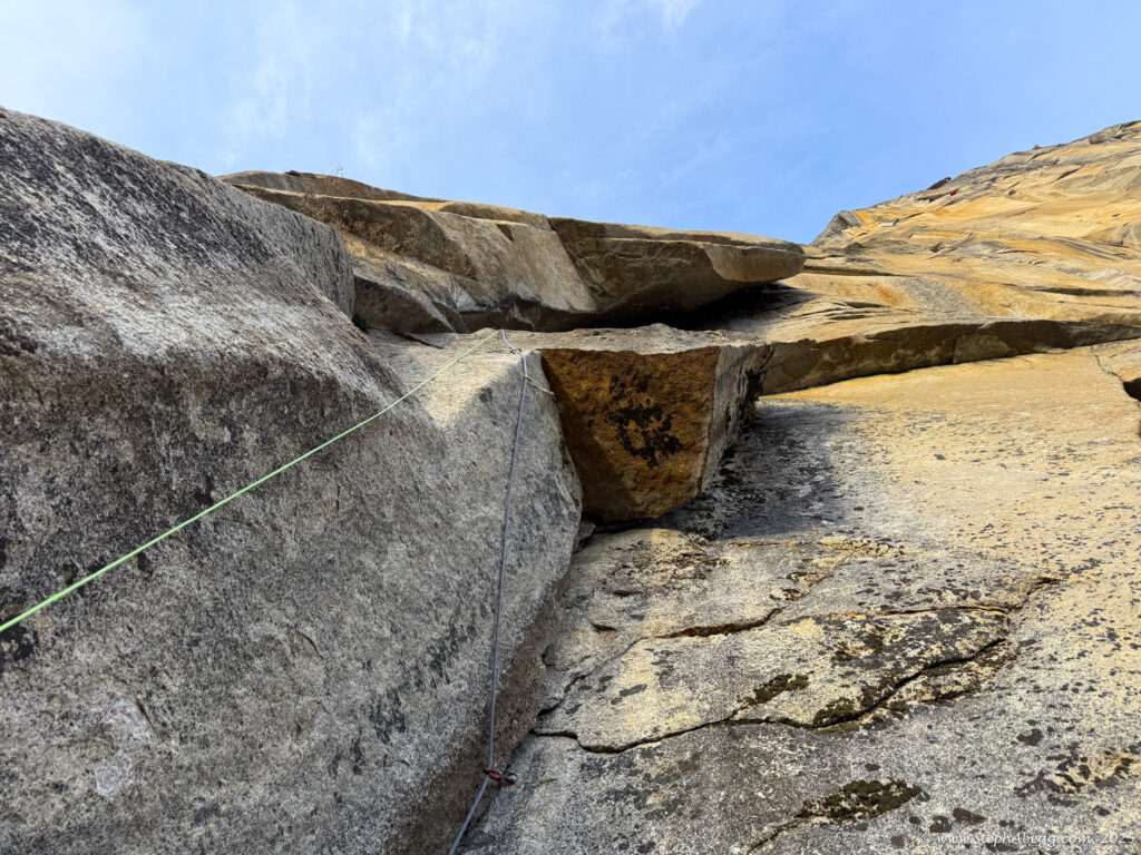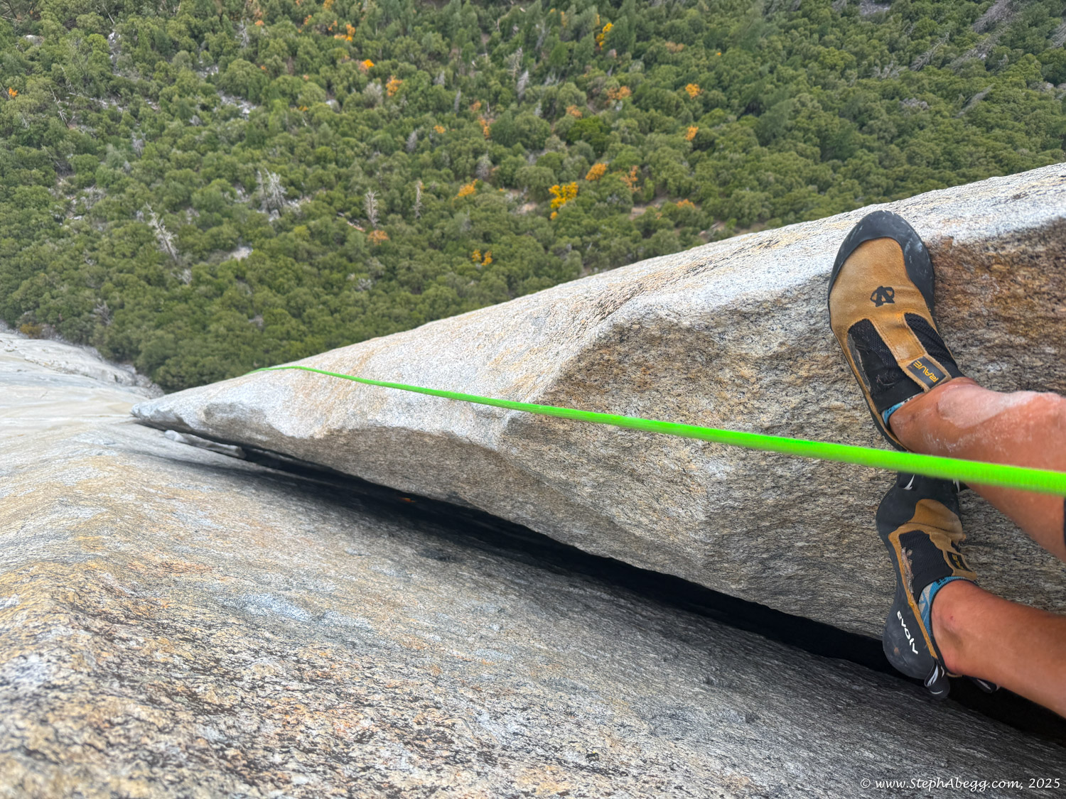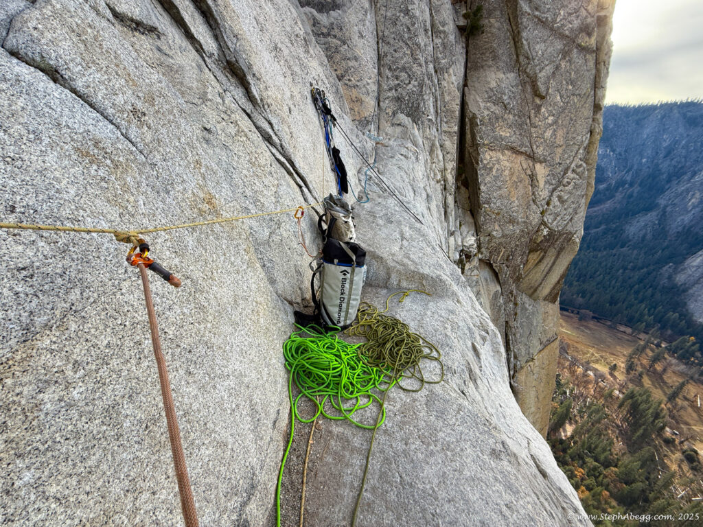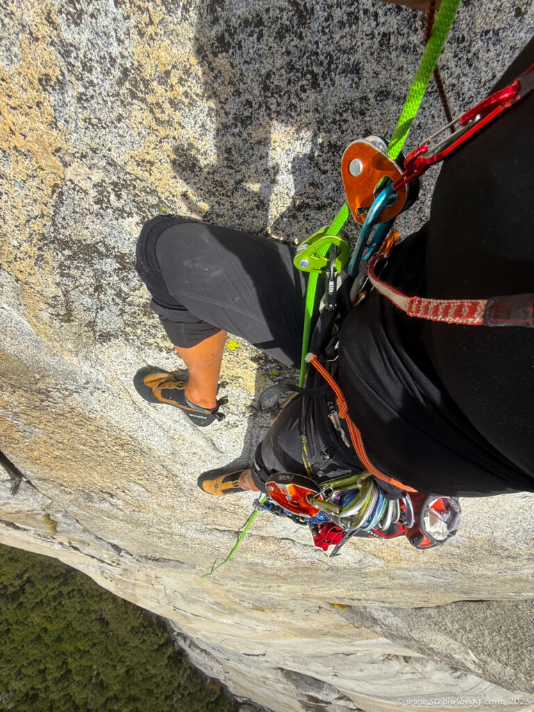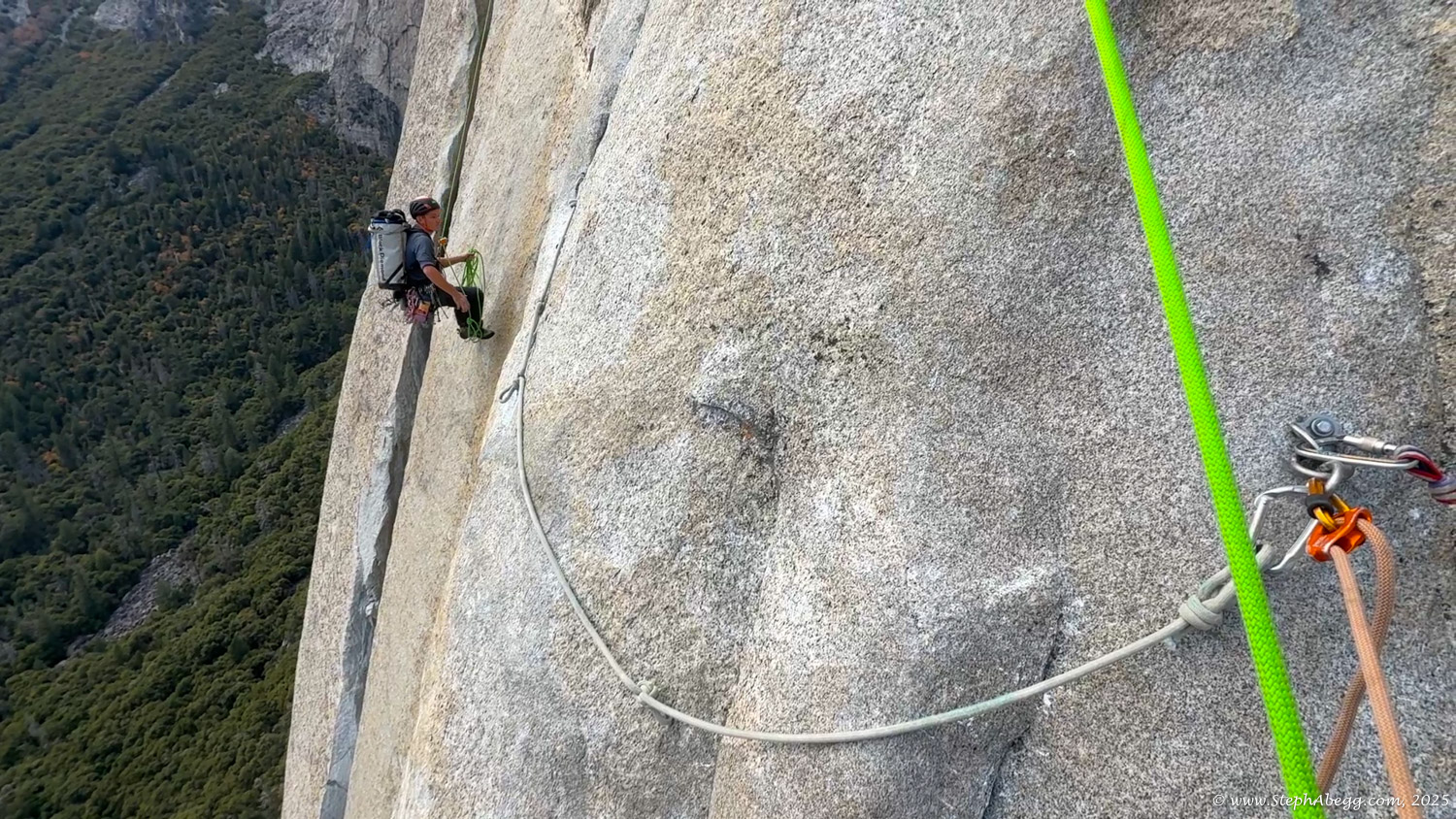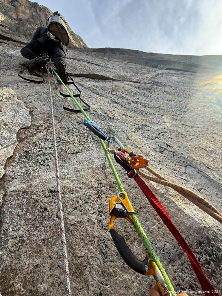 Freerider, plus the descent down to Heart Ledge (which counts as Pitch 9)—so we planned to jug the fixed lines up to Heart Ledge and start climbing from there. The day’s main goal was to reach the Monster Offwidth (Pitch 15), though we weren’t sure how long the Hollow Flake (Pitch 11) would take us, so we figured we’d just see how far we could get.