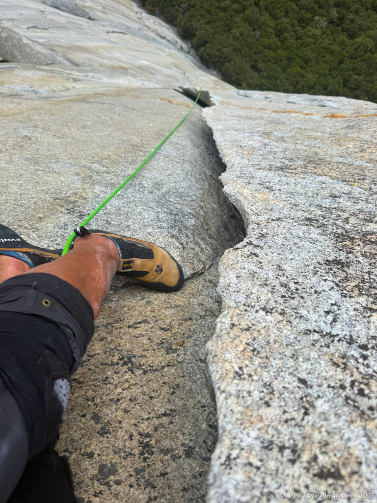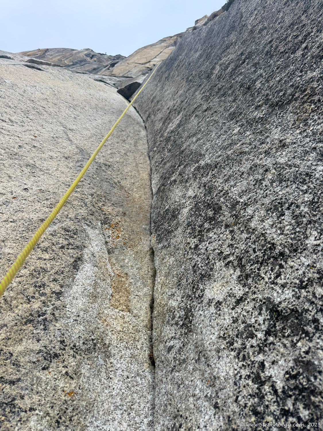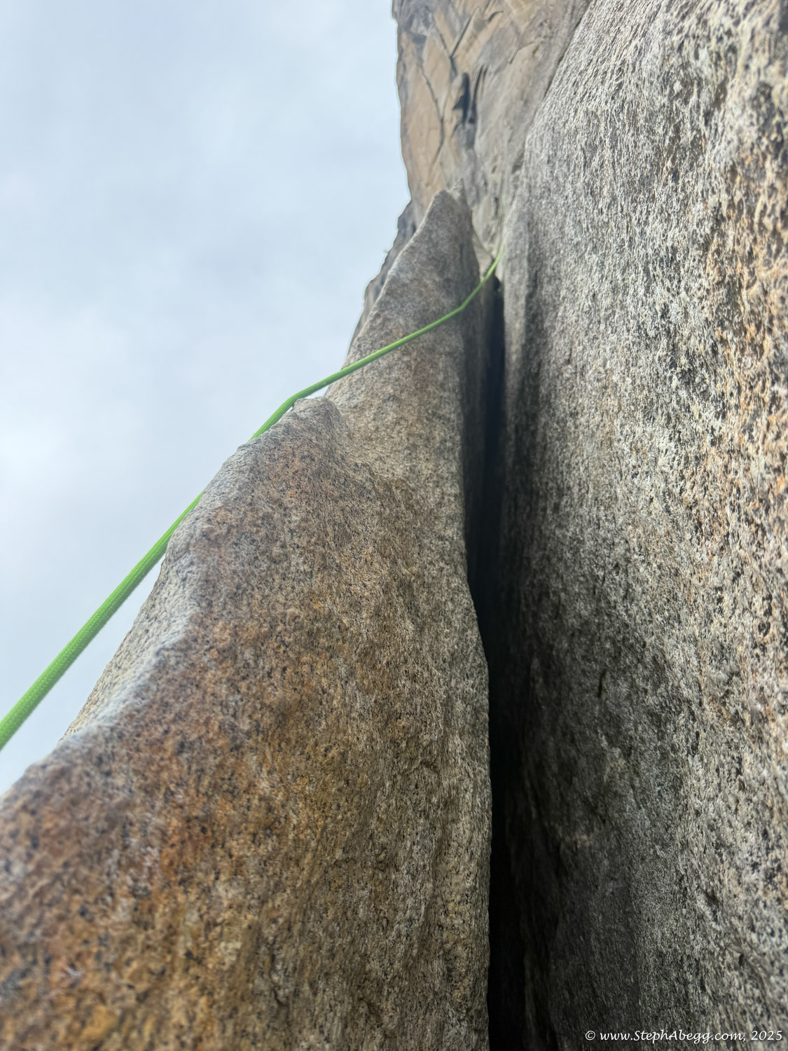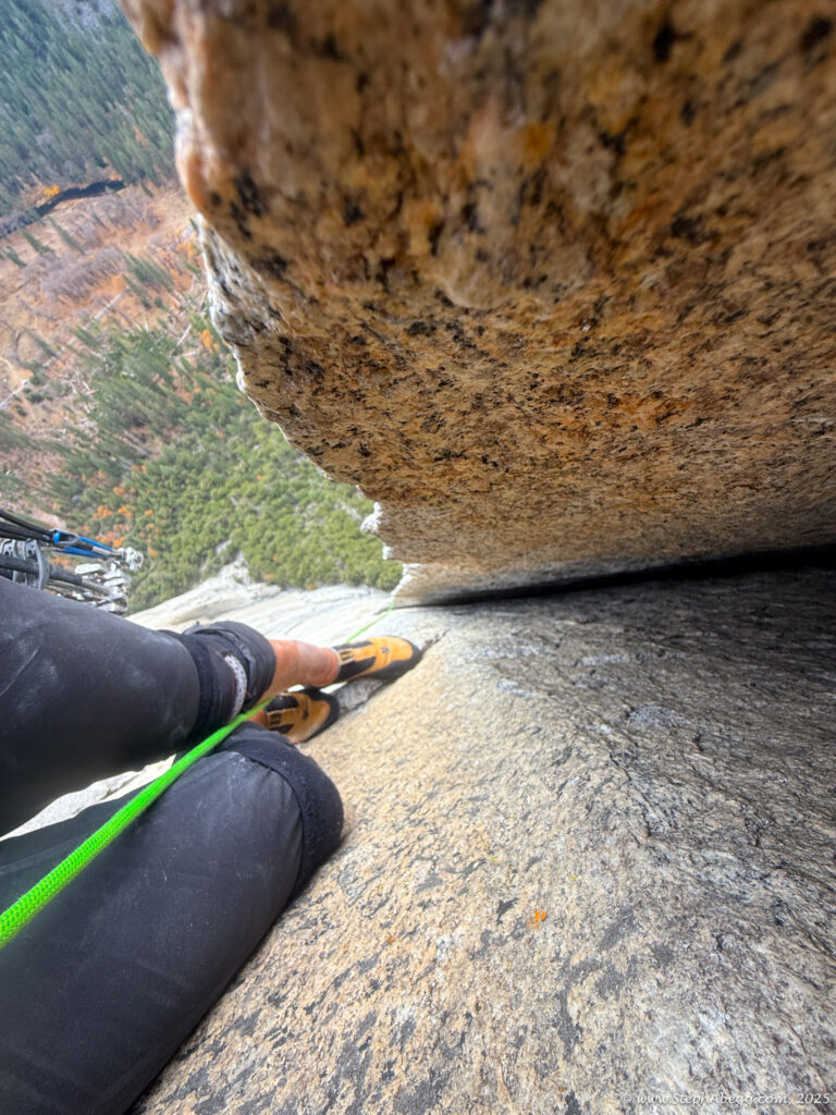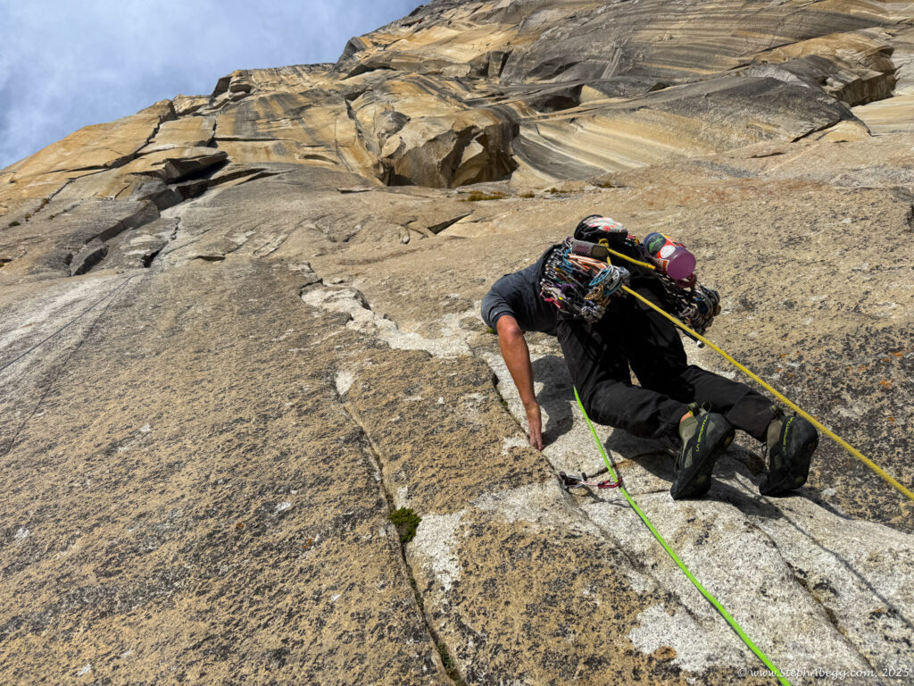 Freerider, plus the descent down to Heart Ledge (which counts as Pitch 9)—so we planned to jug the fixed lines up to Heart Ledge and start climbing from there. The day’s main goal was to reach the Monster Offwidth (Pitch 15), though we weren’t sure how long the Hollow Flake (Pitch 11) would take us, so we figured we’d just see how far we could get.