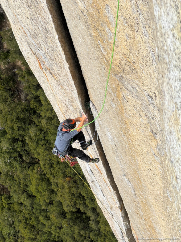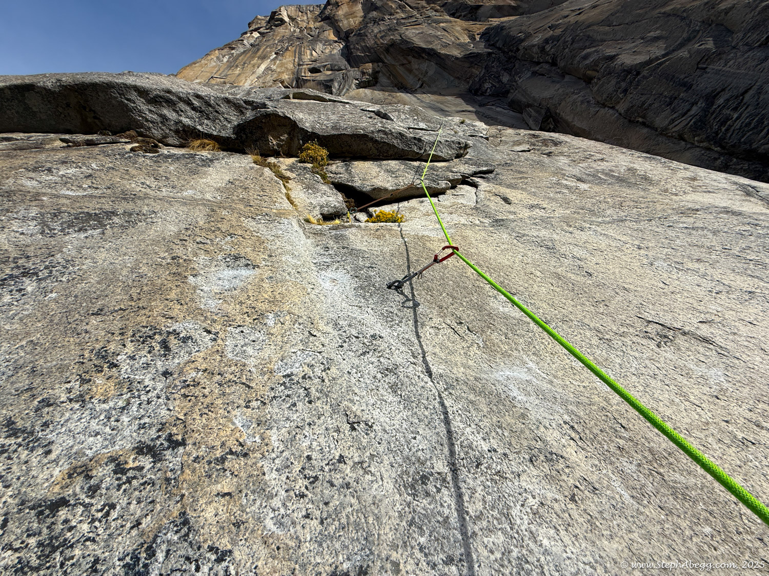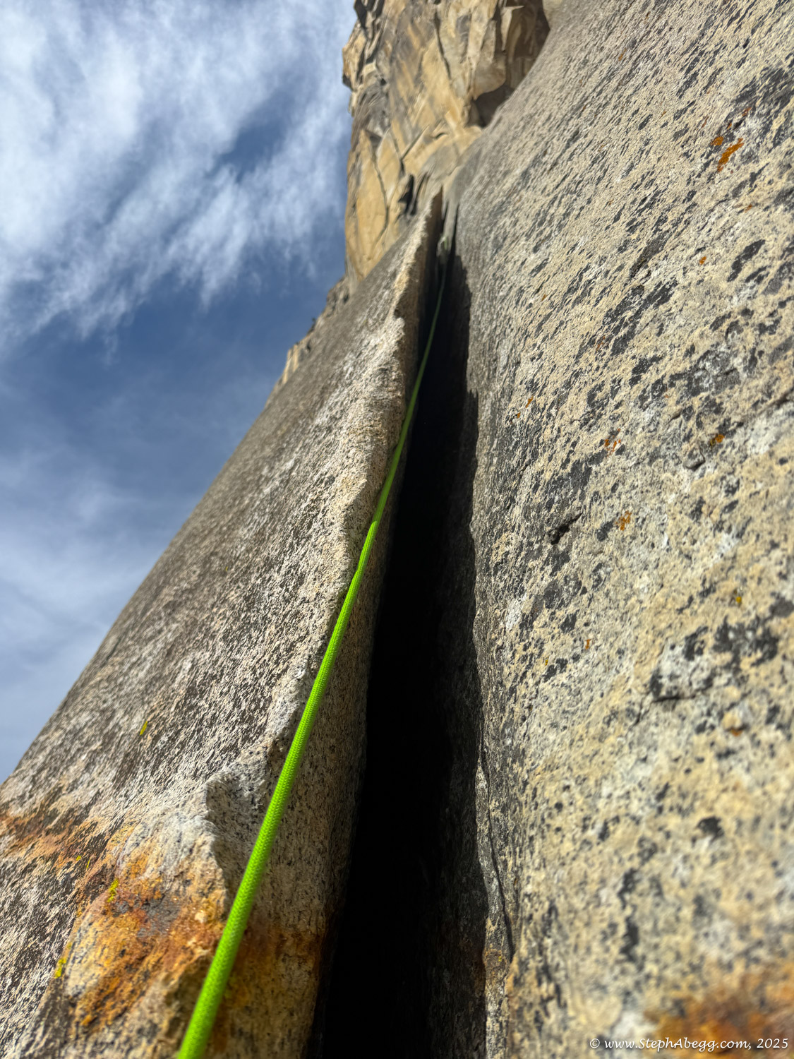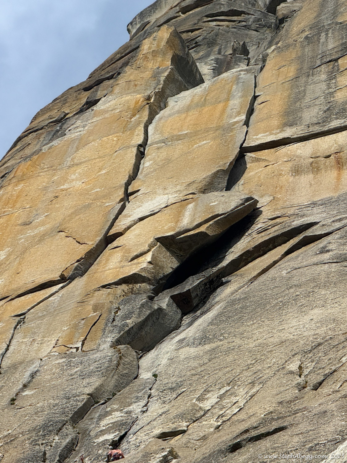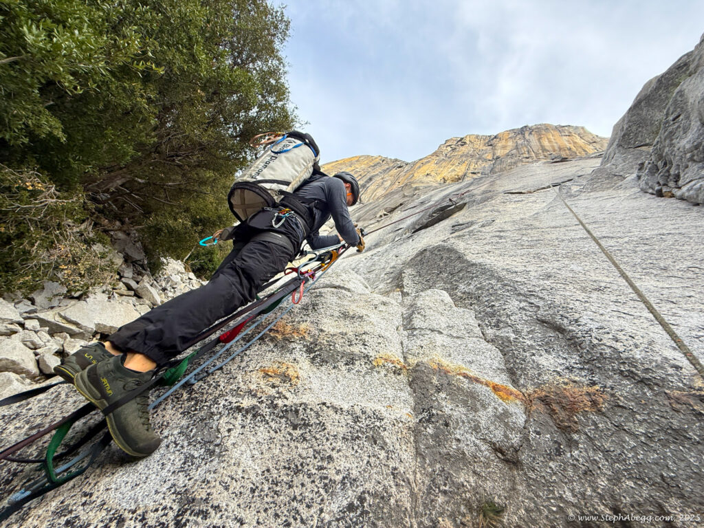 Freerider, plus the descent down to Heart Ledge (which counts as Pitch 9)—so we planned to jug the fixed lines up to Heart Ledge and start climbing from there. The day’s main goal was to reach the Monster Offwidth (Pitch 15), though we weren’t sure how long the Hollow Flake (Pitch 11) would take us, so we figured we’d just see how far we could get.
