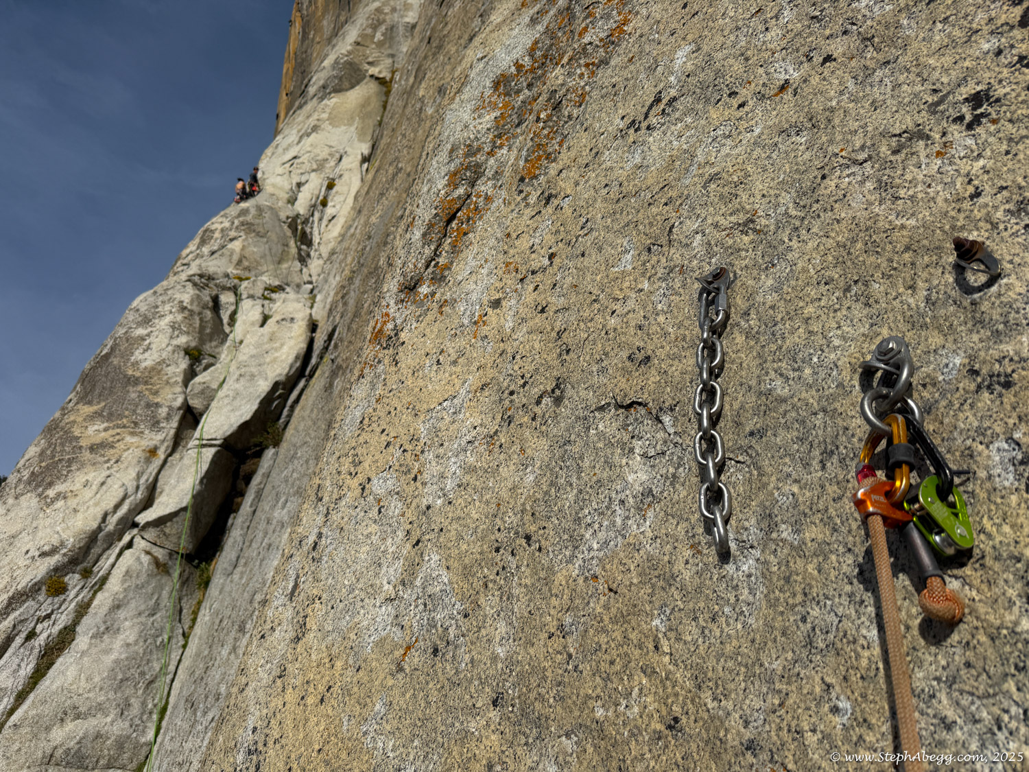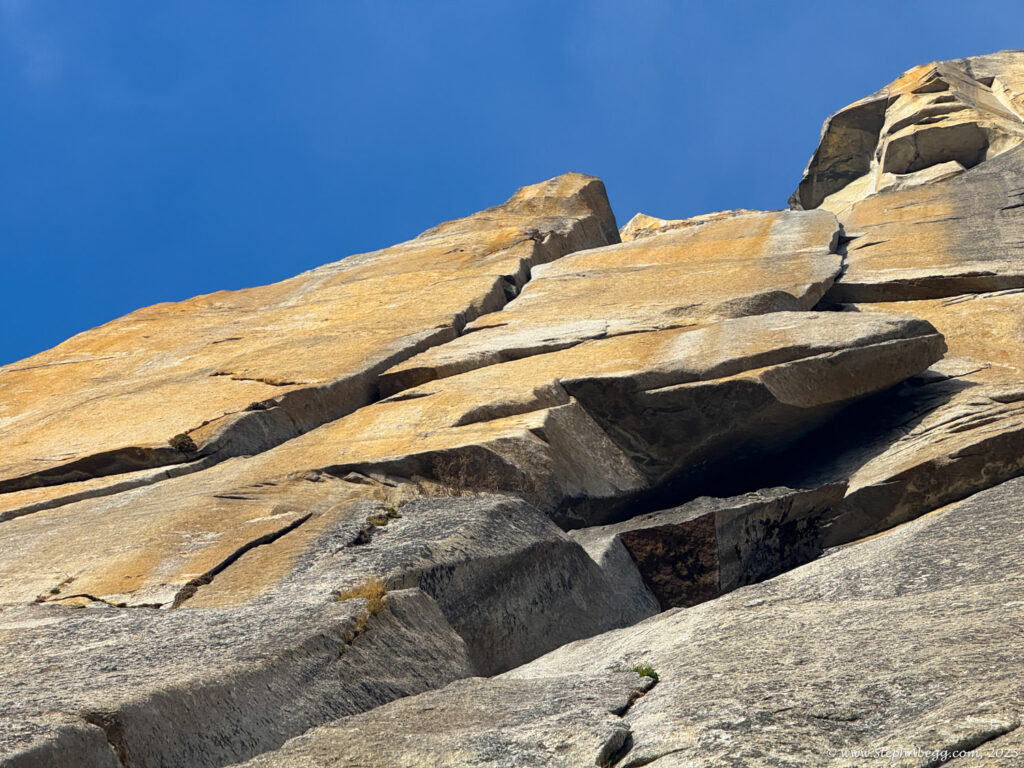 The next few pitches offered some enjoyable climbing. We eventually caught up with the party ahead of us, who had taken an hour-long break on a ledge. Just as we arrived, they started climbing again, forcing us to wait a bit. With the 4:49 p.m. sunset and our desire to avoid rappelling in the dark, that delay cost us valuable time. We climbed to the base of the Ear and would have liked to continue up to the Monster Offwidth, but decided to play it safe and start our descent.
