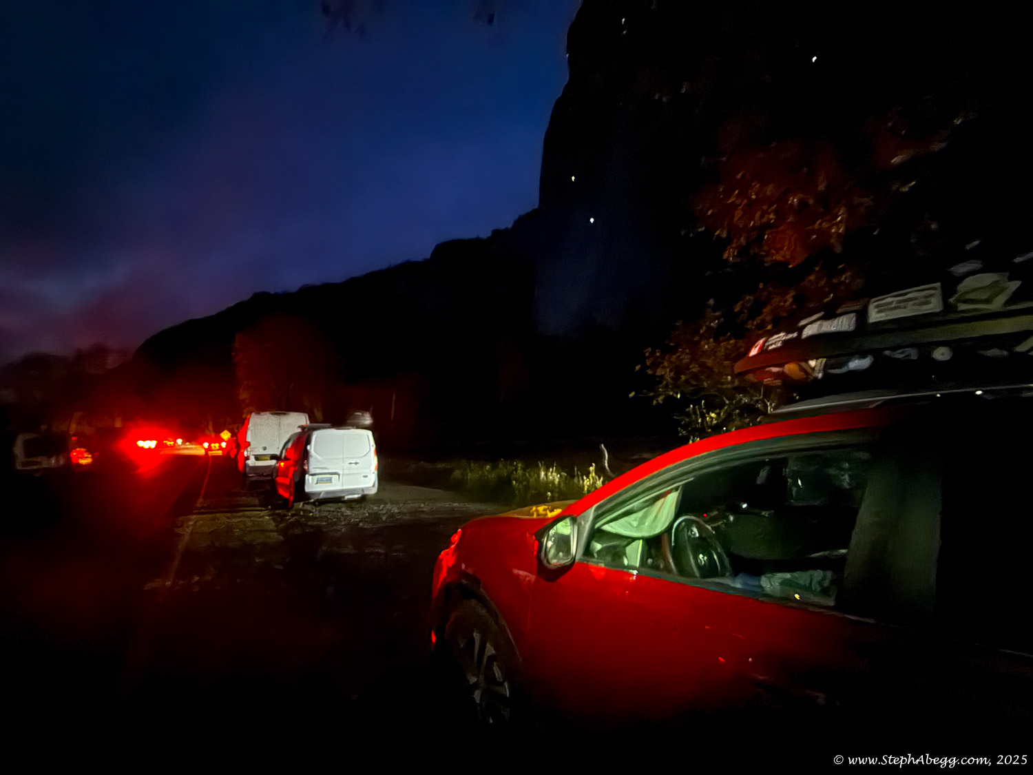 We managed to rappel with a single 70m rope. The rappels were a bit diagonal but went more smoothly than expected, and soon we were back at Heart Ledge and rappelling the fixed lines to the base. We reached the ground just after sunset.
