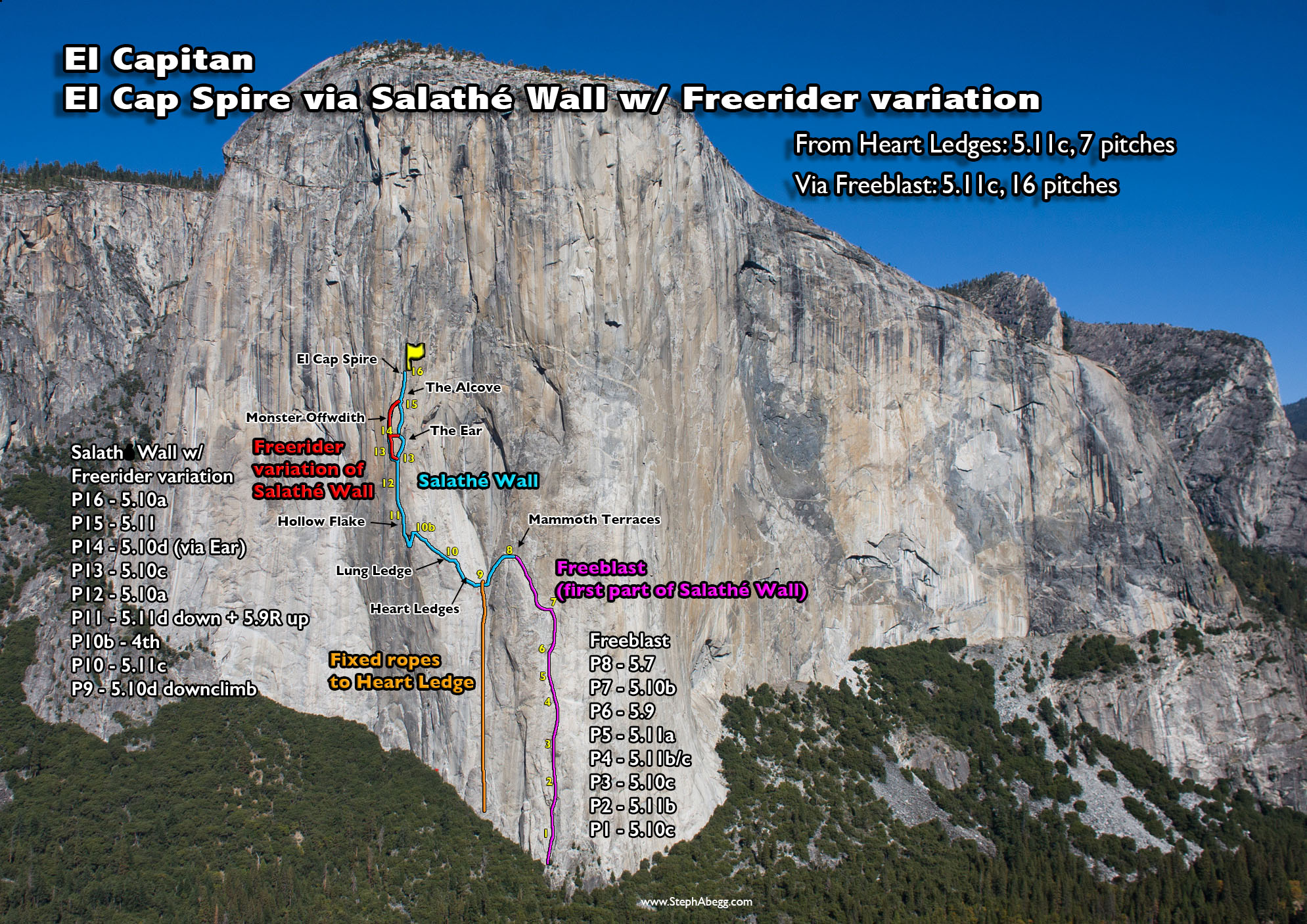 Freerider/Salathé Wall up to El Cap Spire (a bit farther than we got), along with pitch-by-pitch photos from our climb. I’m inspired to come back and work more of