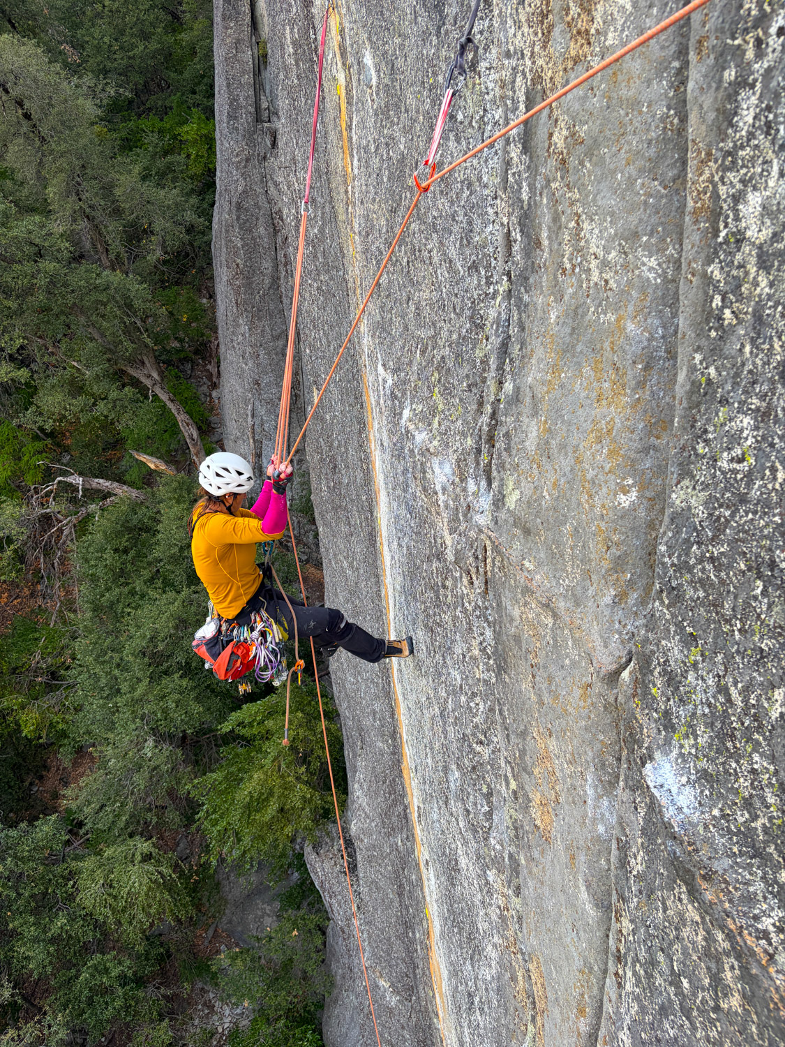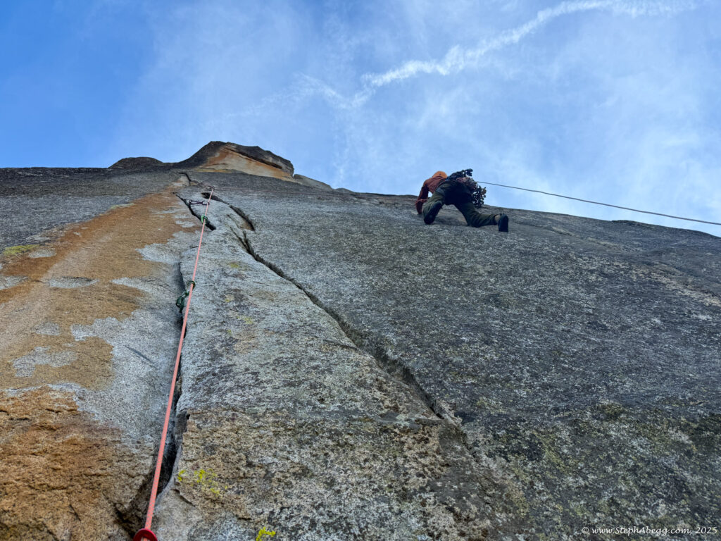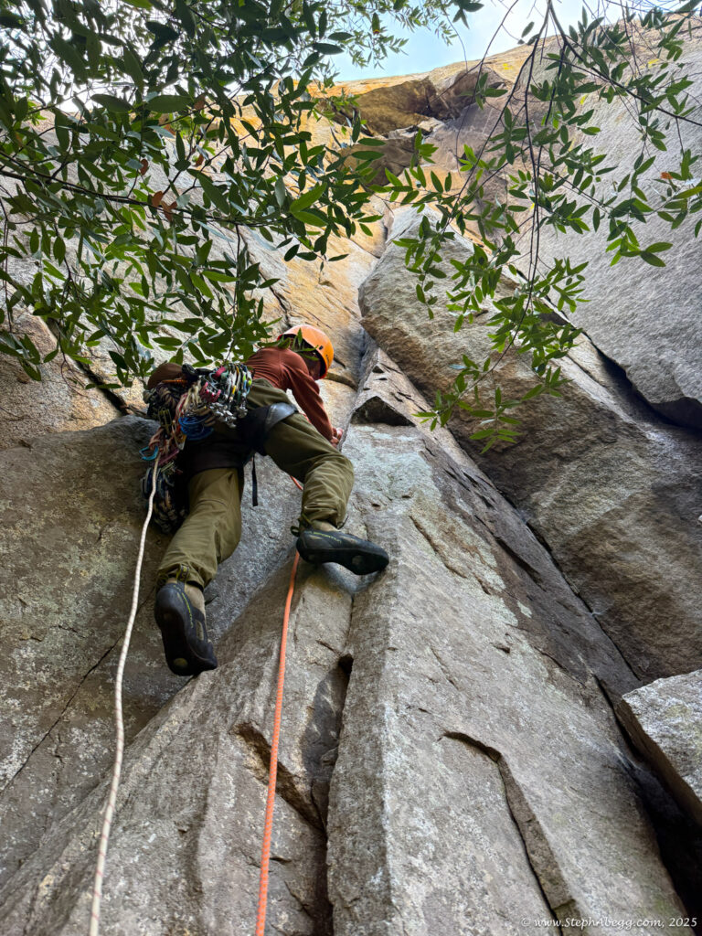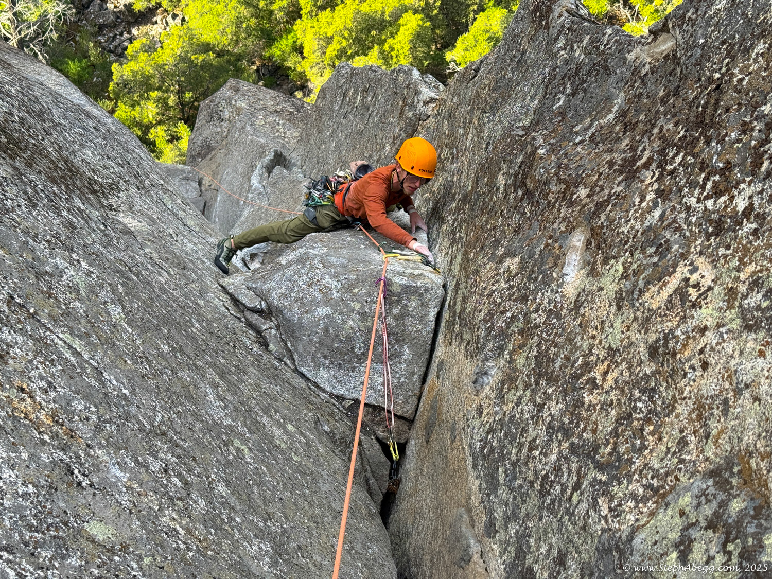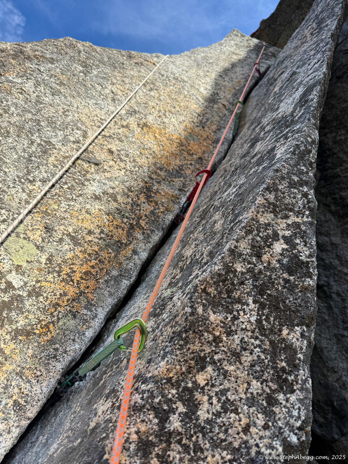 We climbed in fix-and-follow style, hauling a pack with water, food, and extra layers. The route was in the shade, and temps were perfect for climbing in a t-shirt—our jackets never left the bag. One of the day’s cruxes turned out to be the approach: crossing slick river rocks over the rushing water. It wasn’t too bad though—and honestly, pretty cool that you get to start the climb by crossing the river.