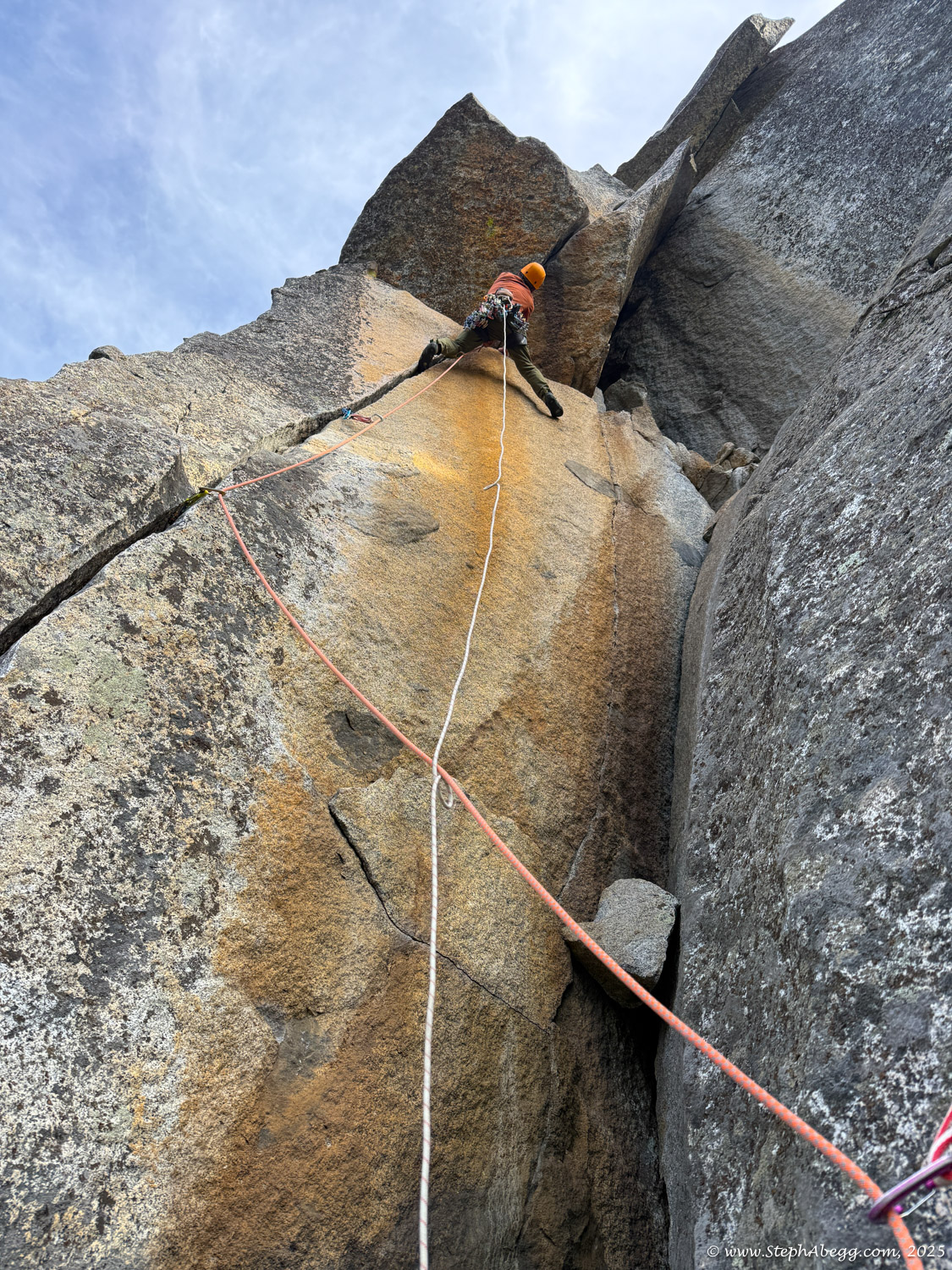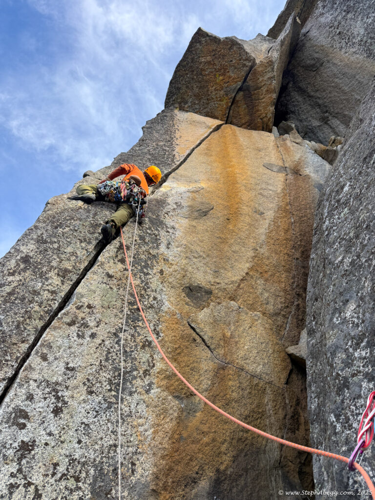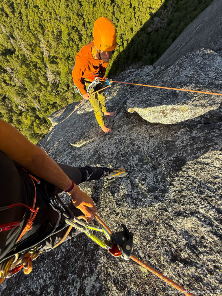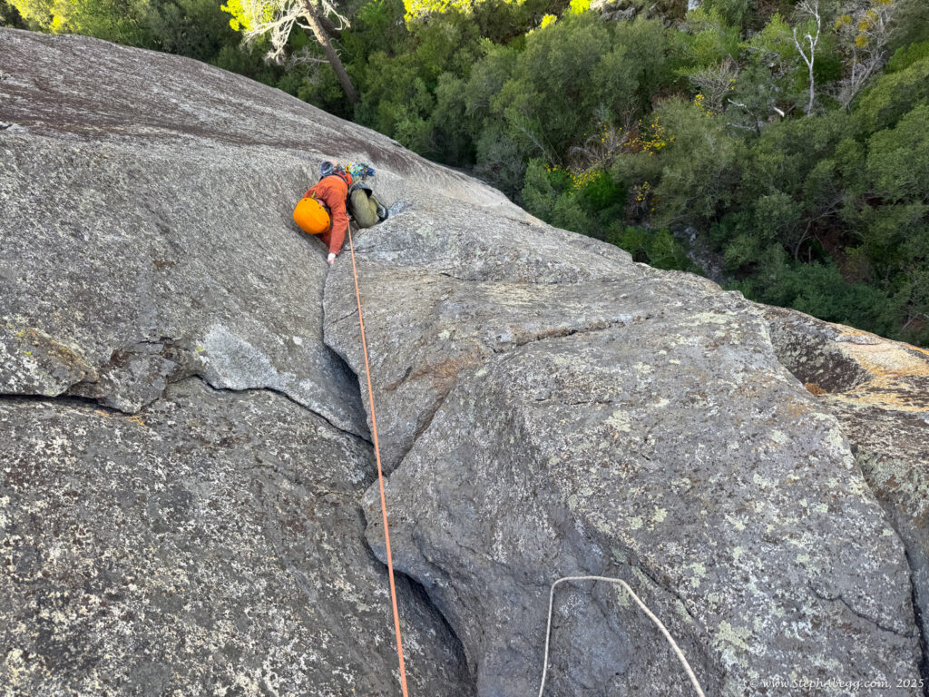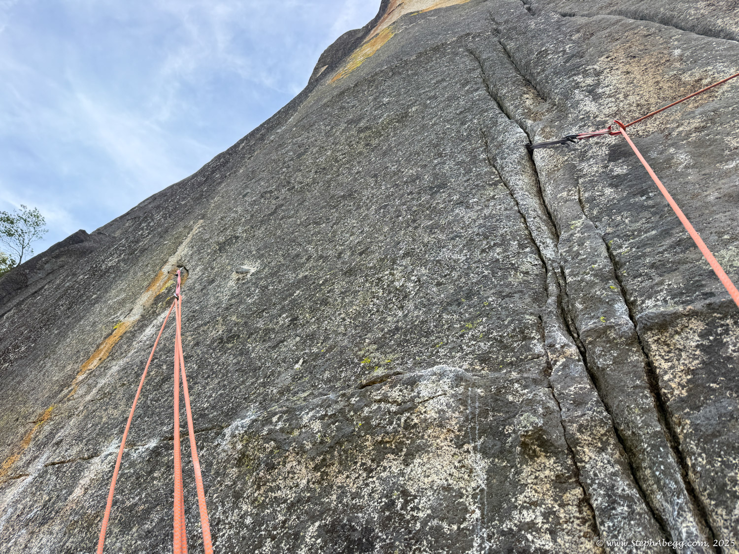 We climbed in fix-and-follow style, hauling a pack with water, food, and extra layers. The route was in the shade, and temps were perfect for climbing in a t-shirt—our jackets never left the bag. One of the day’s cruxes turned out to be the approach: crossing slick river rocks over the rushing water. It wasn’t too bad though—and honestly, pretty cool that you get to start the climb by crossing the river.