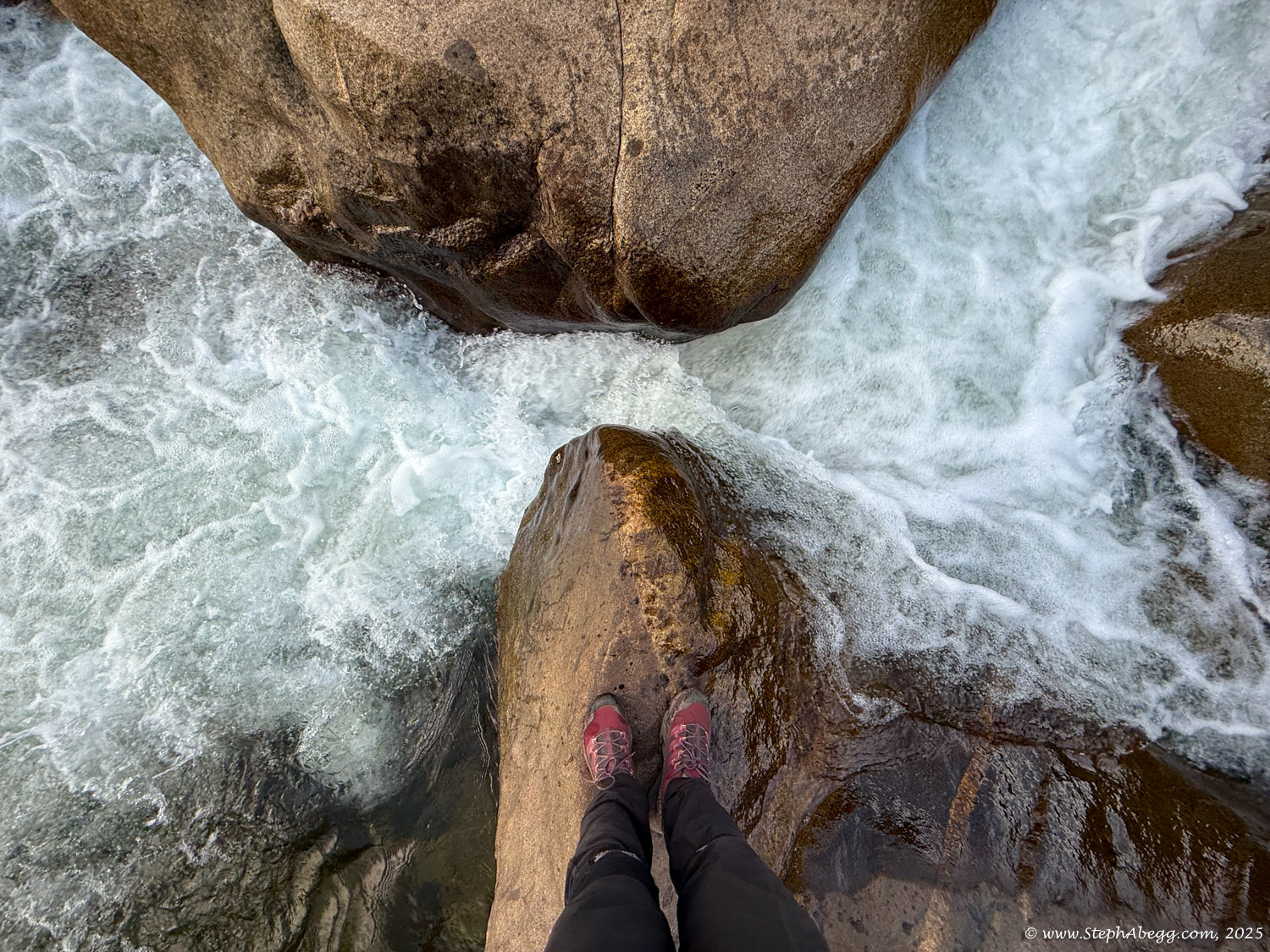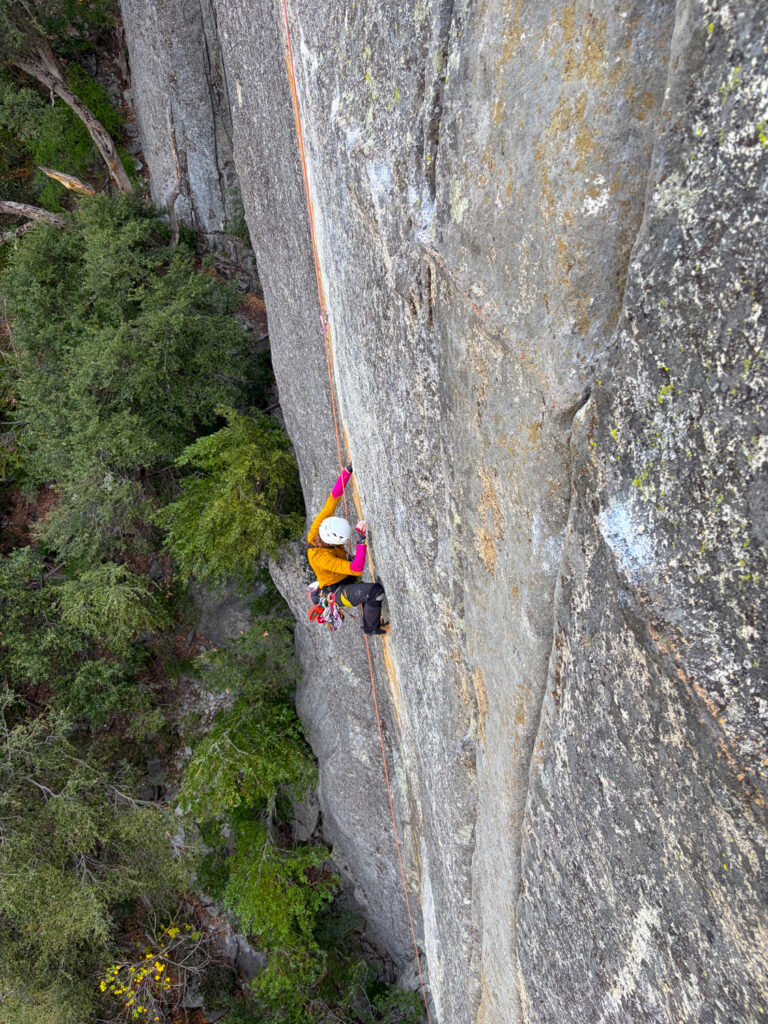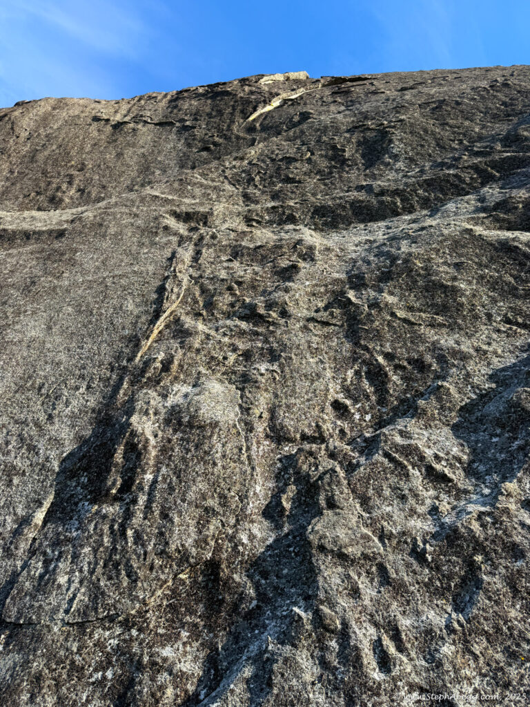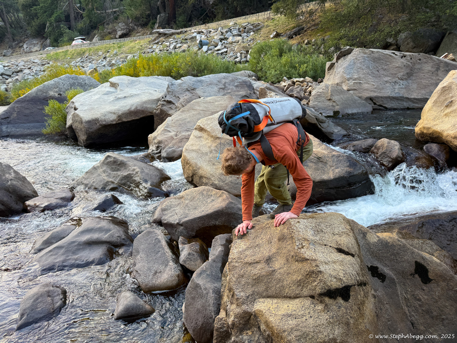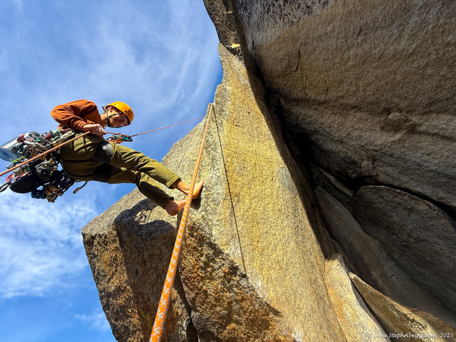 We climbed in fix-and-follow style, hauling a pack with water, food, and extra layers. The route was in the shade, and temps were perfect for climbing in a t-shirt—our jackets never left the bag. One of the day’s cruxes turned out to be the approach: crossing slick river rocks over the rushing water. It wasn’t too bad though—and honestly, pretty cool that you get to start the climb by crossing the river.