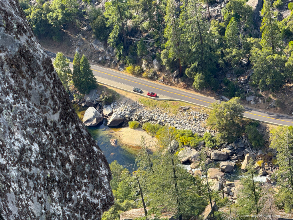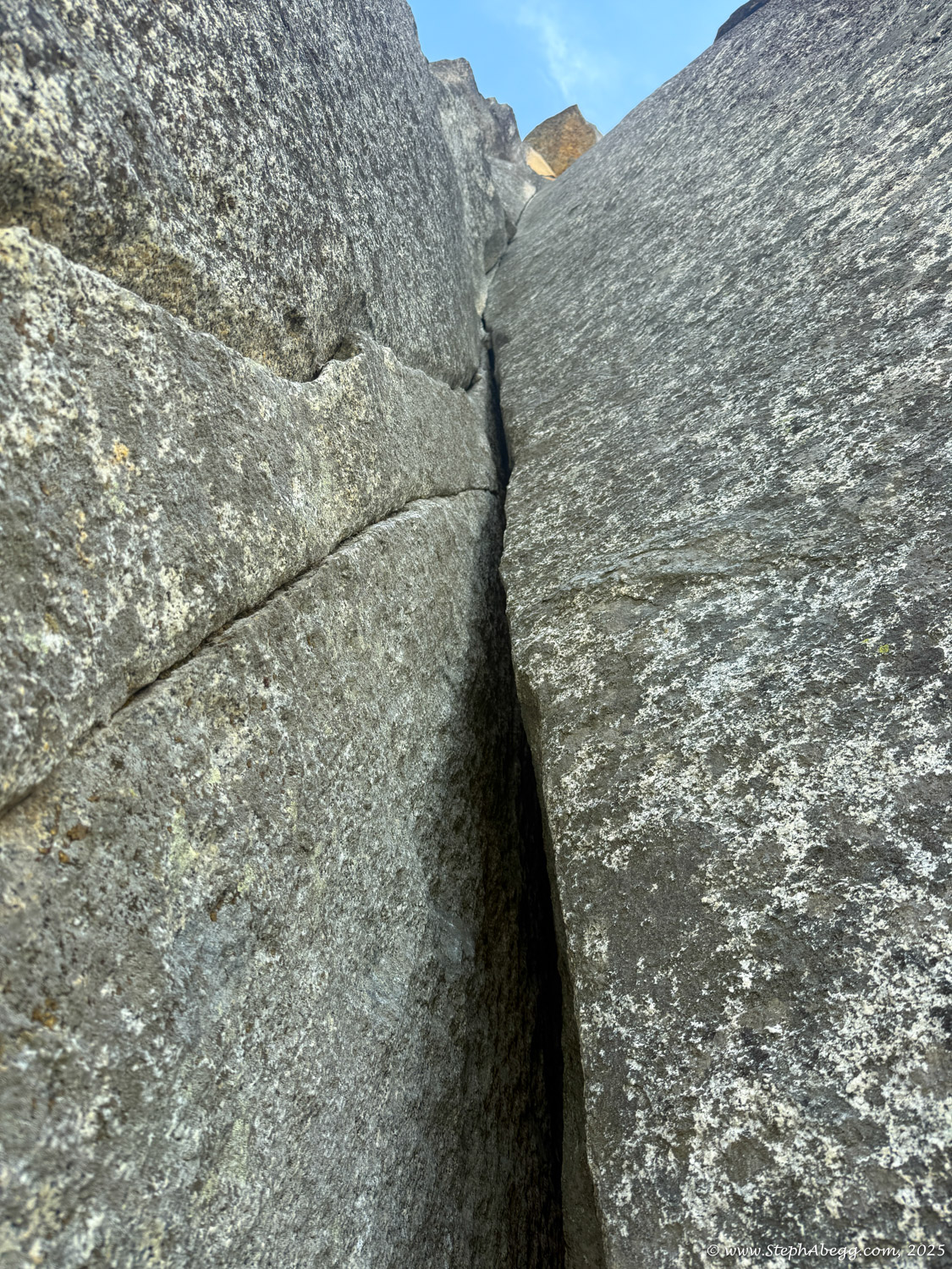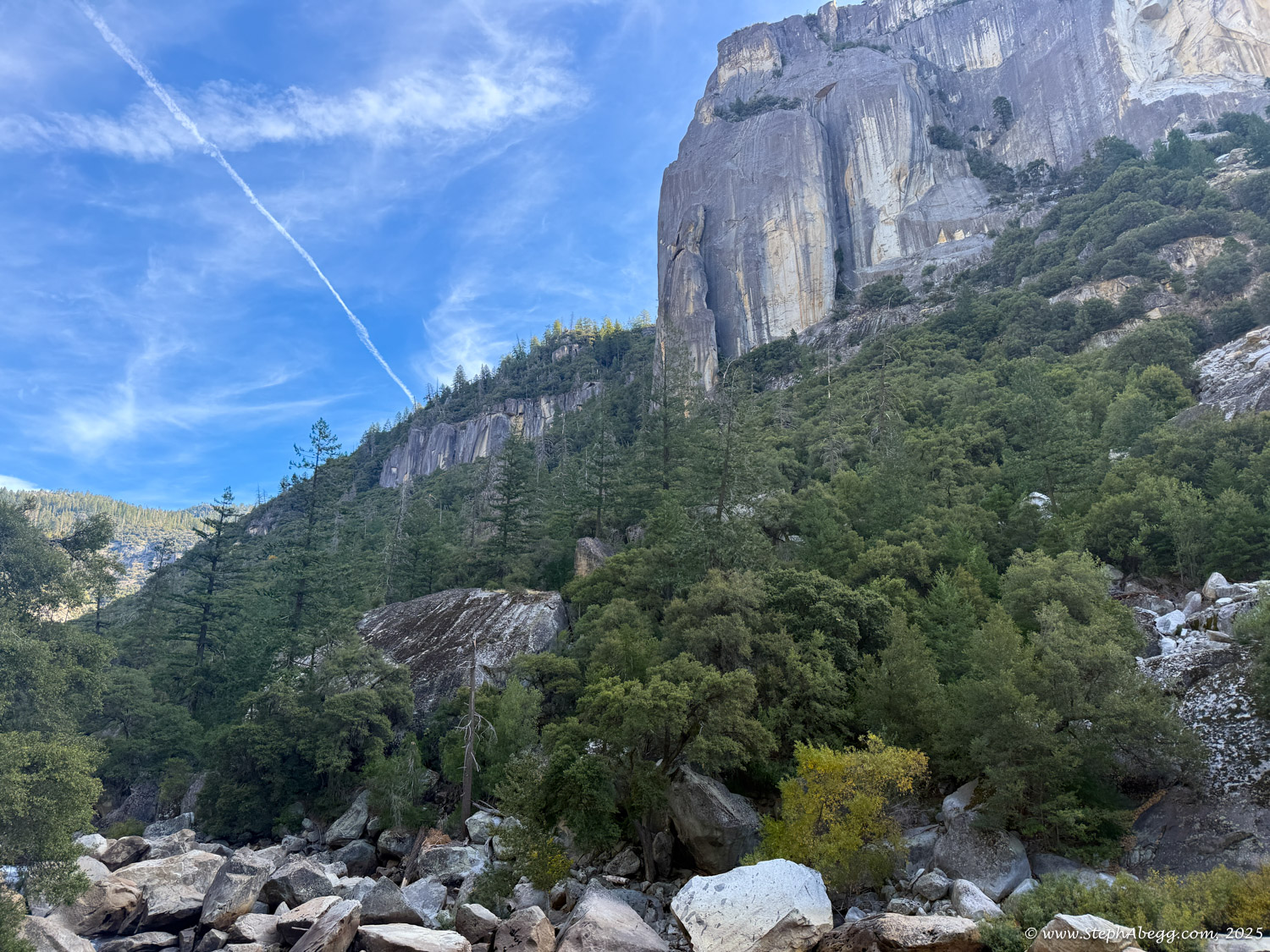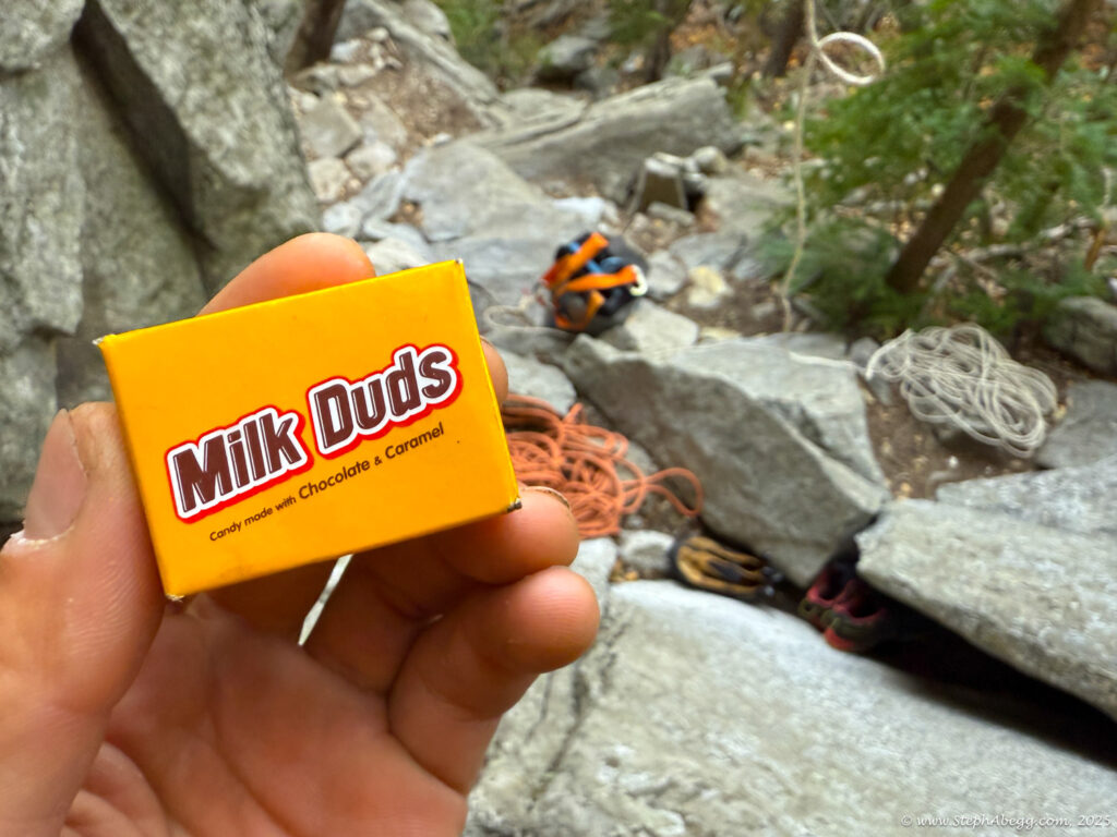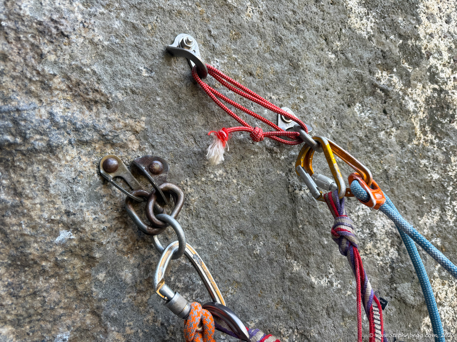 We climbed in fix-and-follow style, hauling a pack with water, food, and extra layers. The route was in the shade, and temps were perfect for climbing in a t-shirt—our jackets never left the bag. One of the day’s cruxes turned out to be the approach: crossing slick river rocks over the rushing water. It wasn’t too bad though—and honestly, pretty cool that you get to start the climb by crossing the river.