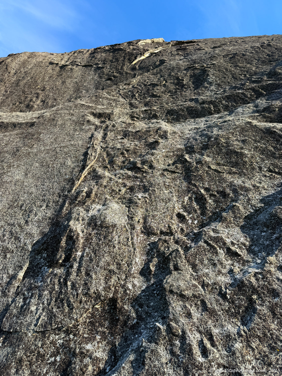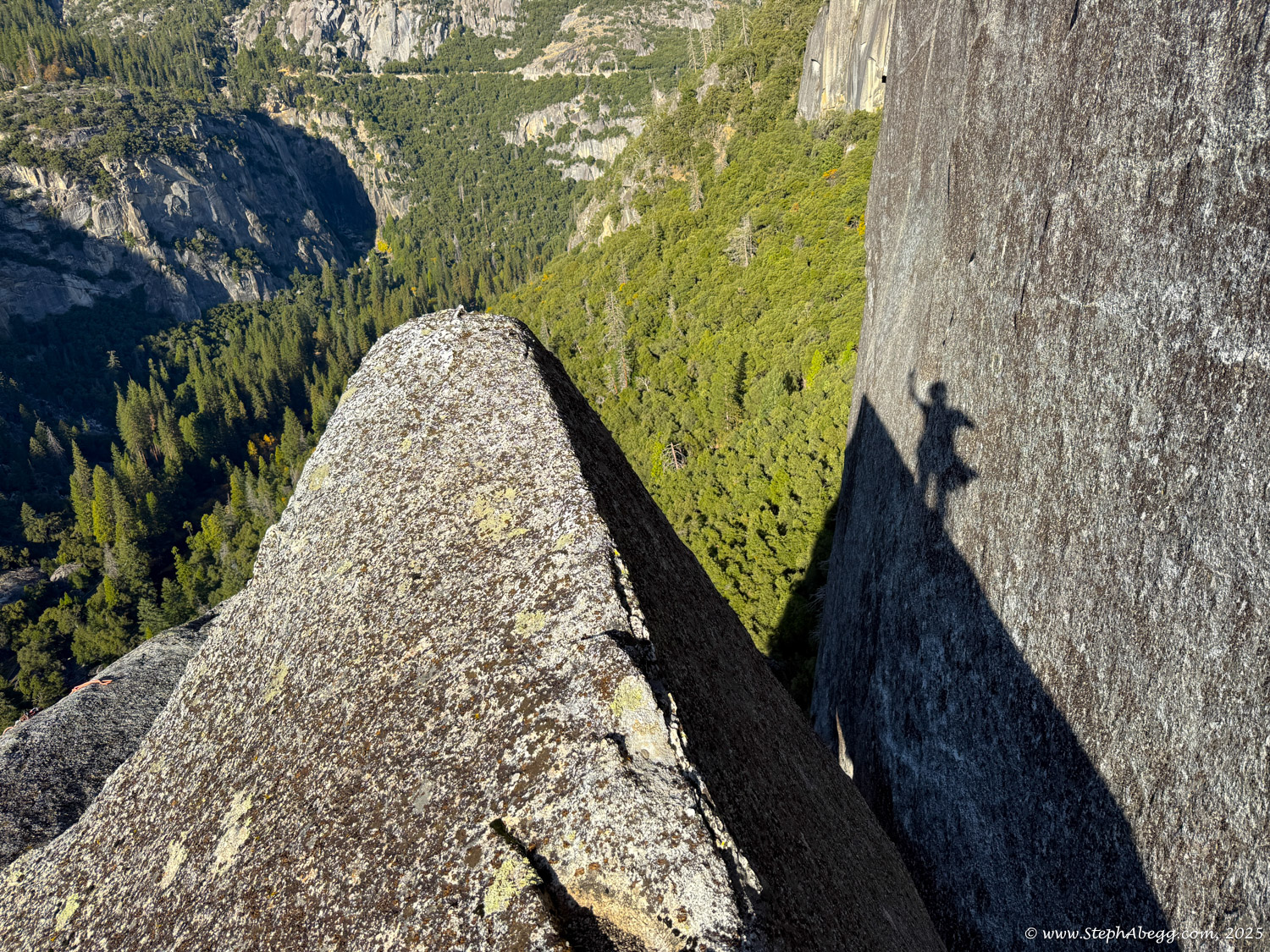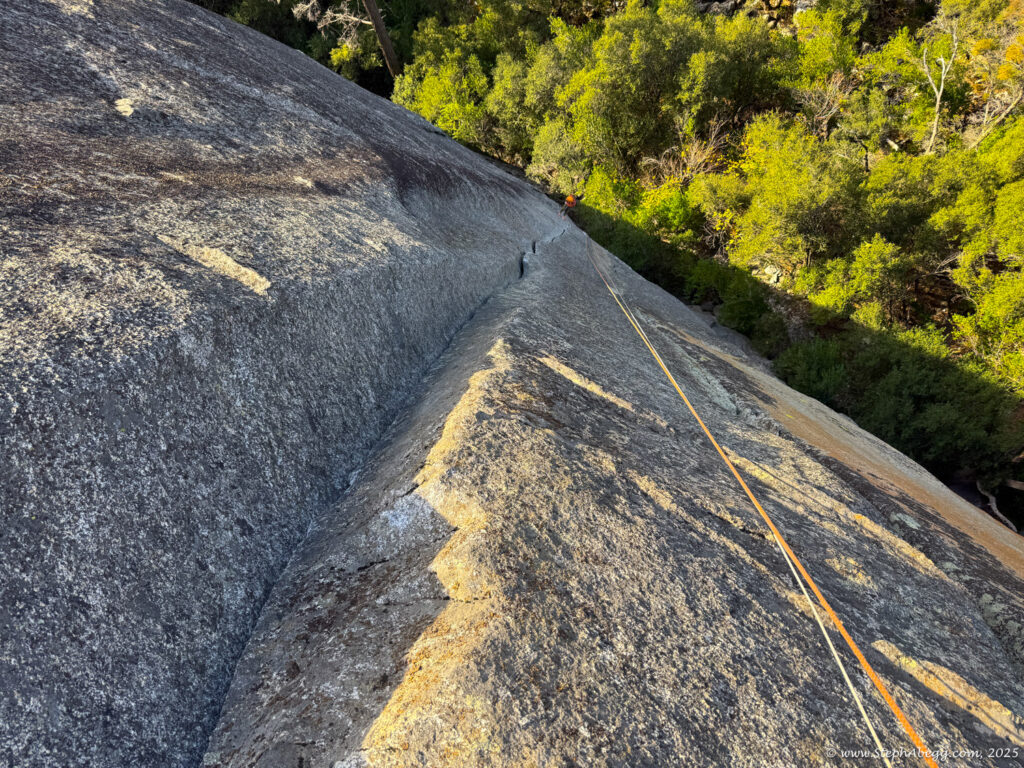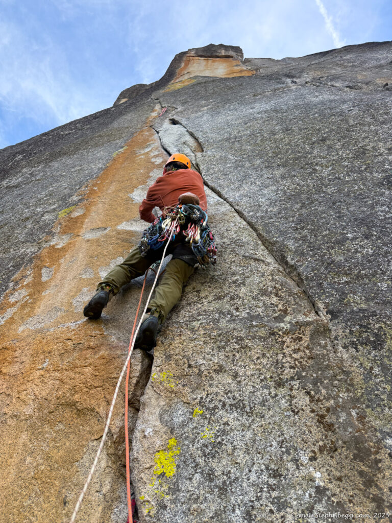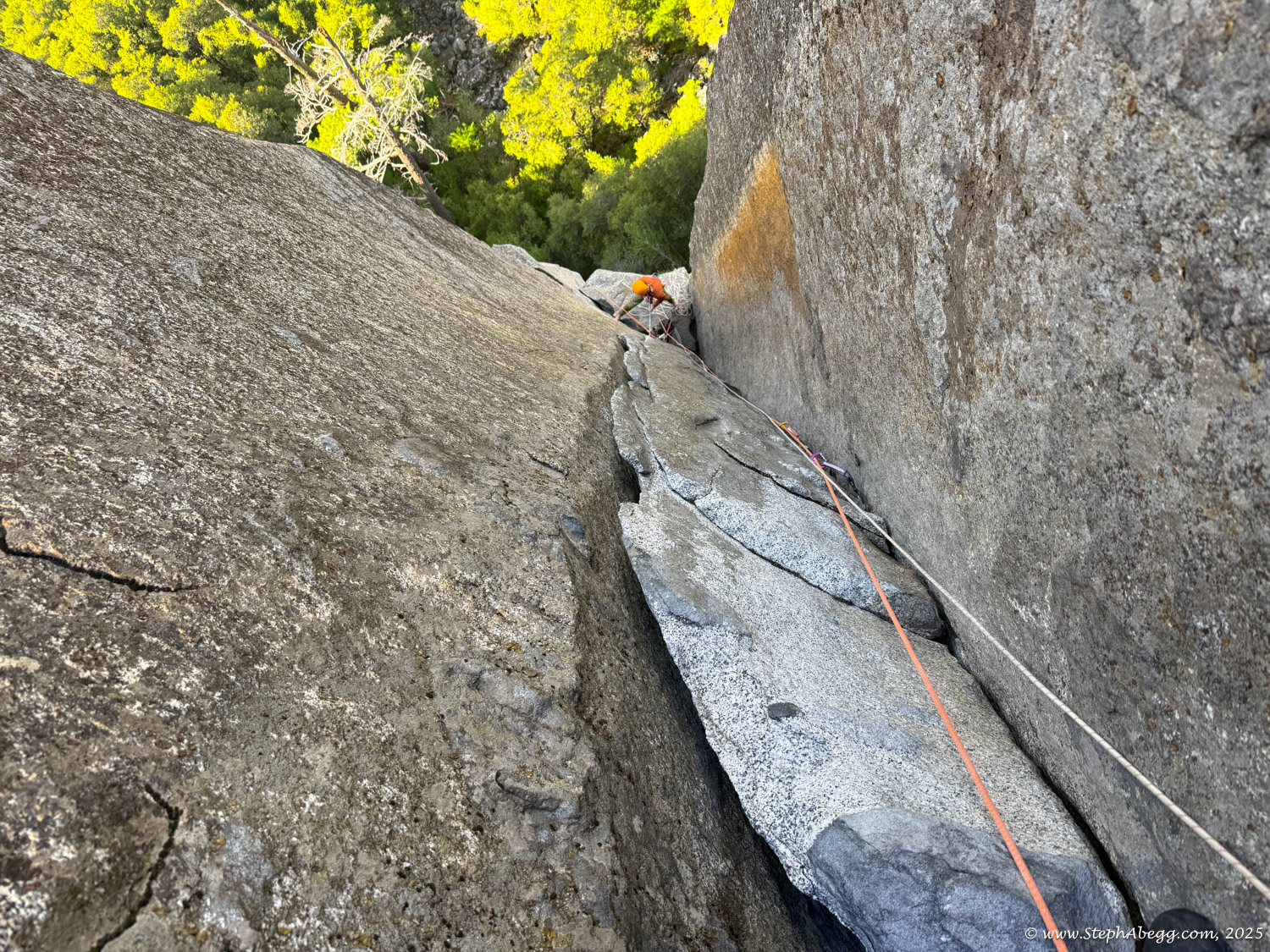 I climbed the route with Chris Guzman, who responded to my Mountain Project partner post. We block-led the route—Chris took Pitches 1 and 2, I led 3 through 5, and he finished with 6 and 7. My leads featured long stretches of crack and corner climbing, while Chris’s included the technical cruxes and the A0 pendulum. We both took a brief hang on the first 5.11d (powerful layback on finger jams) before quickly sorting it out, and we both ended up pulling through the second 11d section (powerful pull through roof on flaring jams) (although Chris nearly onsighted the 11d roof, and may have had he had hand jammies). I got the lead of the incredible 130-foot hand crack of Pitch 3—an absolute gem.