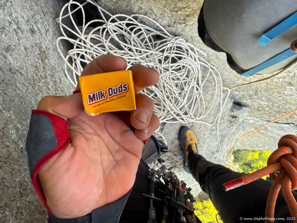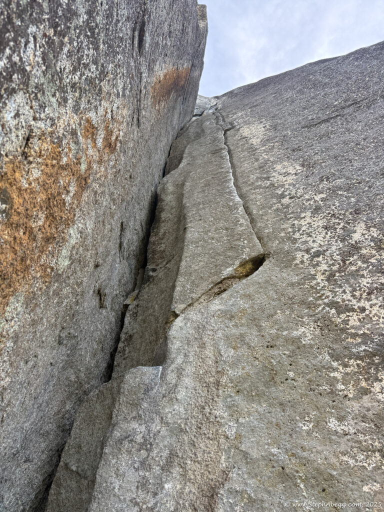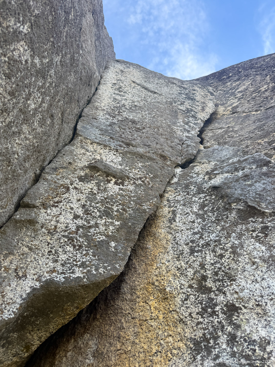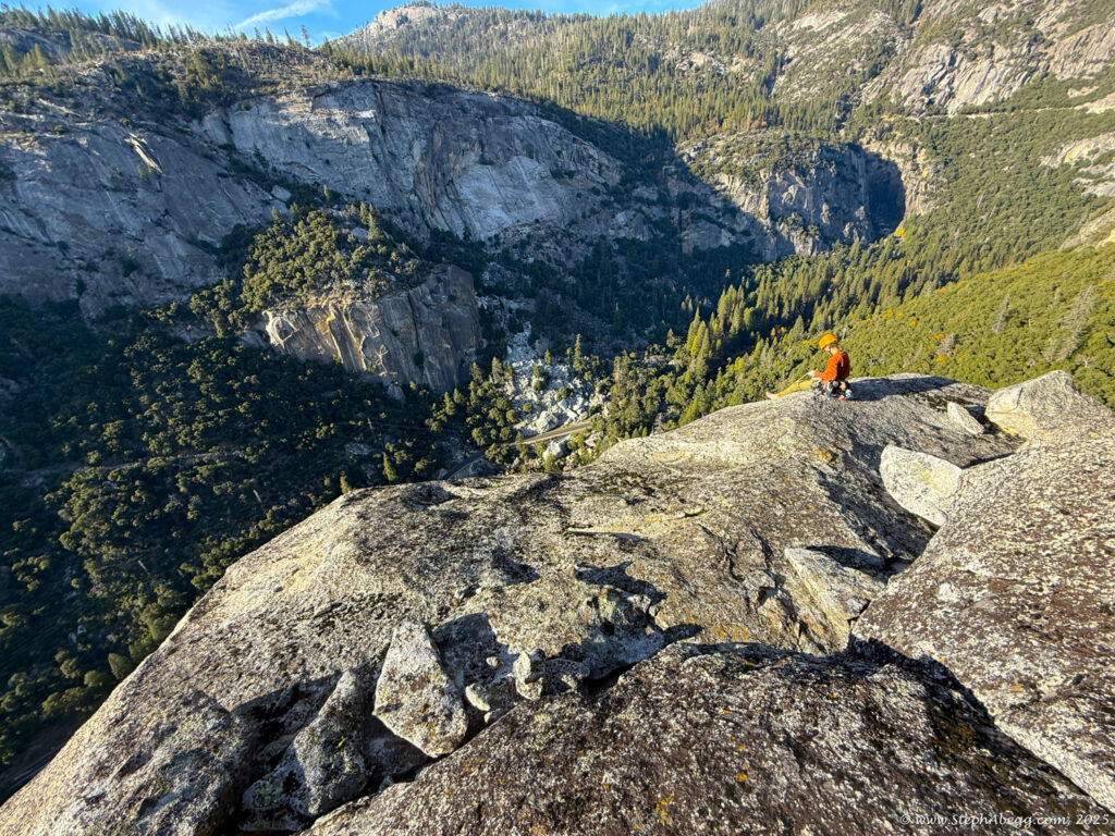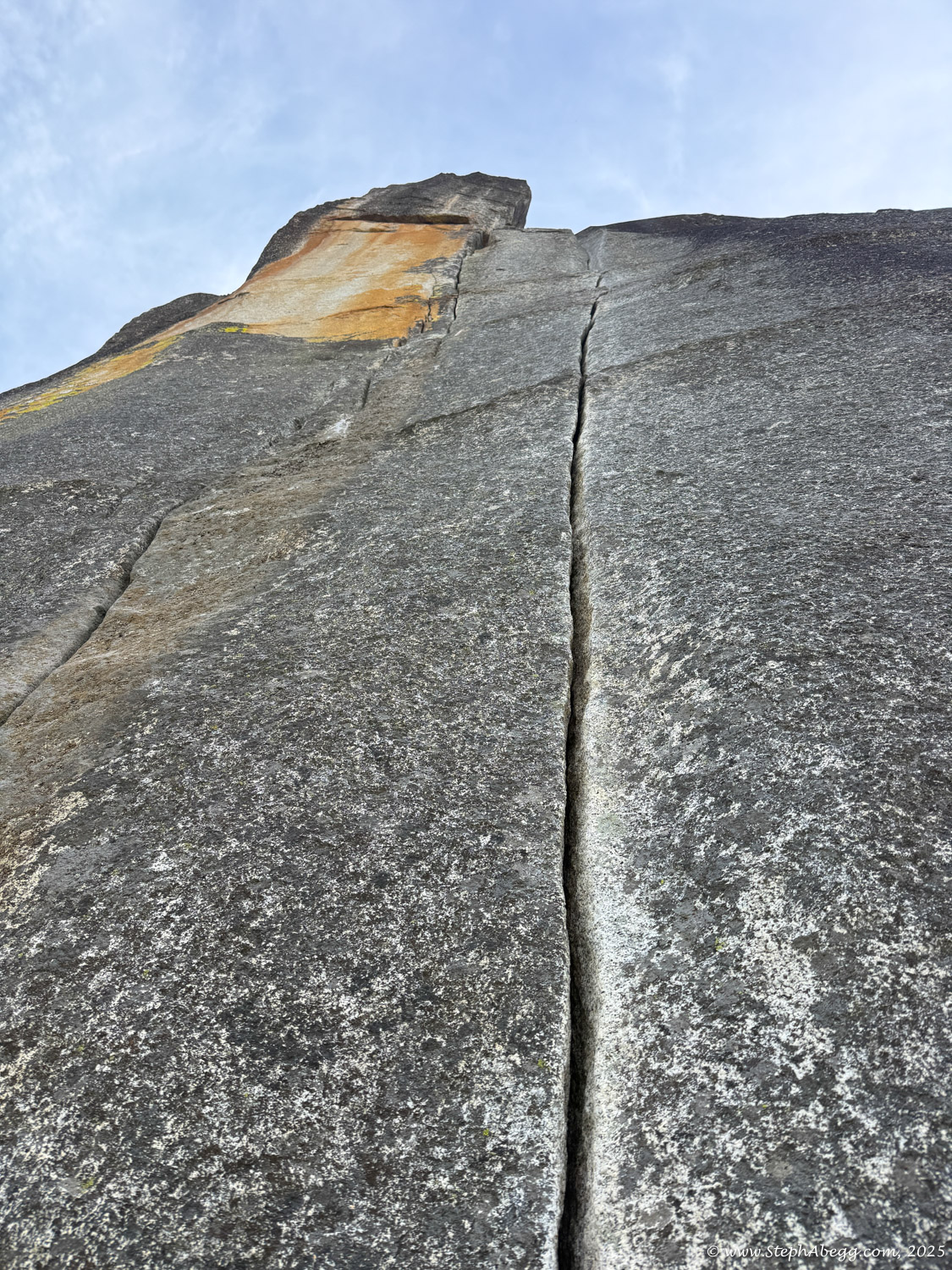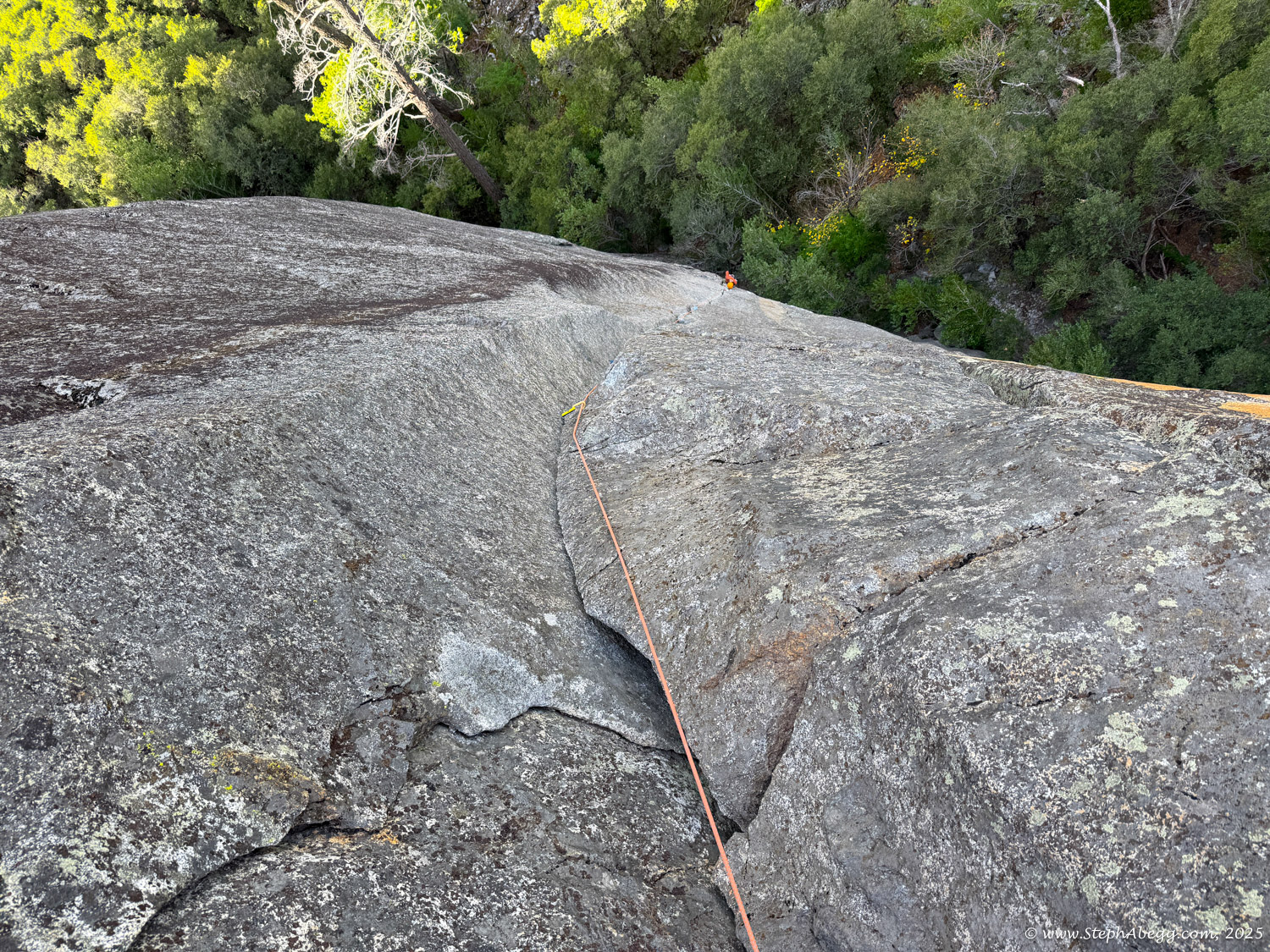 I climbed the route with Chris Guzman, who responded to my Mountain Project partner post. We block-led the route—Chris took Pitches 1 and 2, I led 3 through 5, and he finished with 6 and 7. My leads featured long stretches of crack and corner climbing, while Chris’s included the technical cruxes and the A0 pendulum. We both took a brief hang on the first 5.11d (powerful layback on finger jams) before quickly sorting it out, and we both ended up pulling through the second 11d section (powerful pull through roof on flaring jams) (although Chris nearly onsighted the 11d roof, and may have had he had hand jammies). I got the lead of the incredible 130-foot hand crack of Pitch 3—an absolute gem.