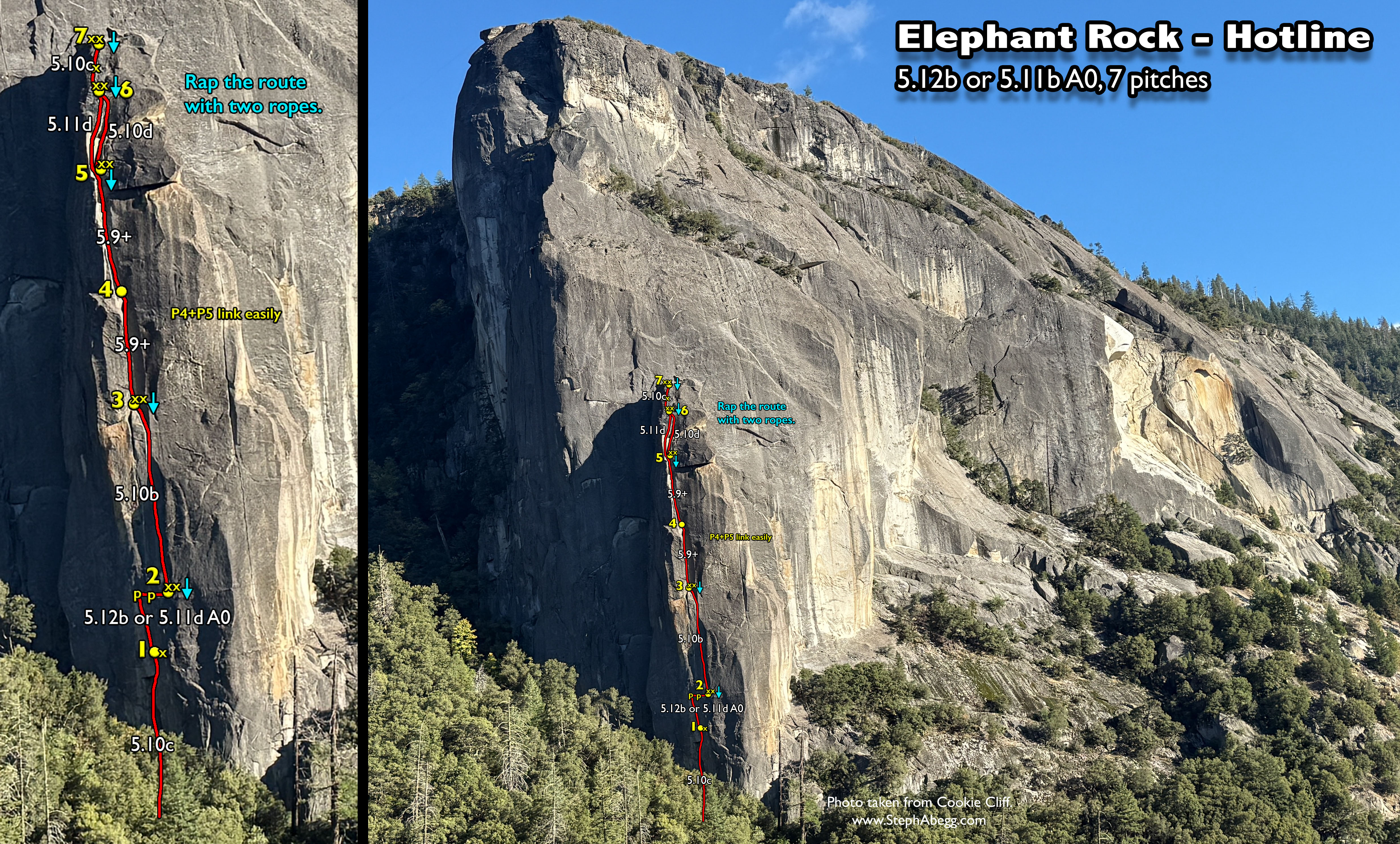 Hotline, often thought to be the first 5.12 in Yosemite (though that’s not actually the case), is a fantastic crack system that feels like a cragging route despite technically being seven pitches long. It follows the obvious roof-to-splitter line on the left side of the main face of the giant pillar on Elephant Rock, tracing the edge of a rectangular orange scar of rock. The climbing is outstanding—splitter cracks galore, with long stretches of high-quality 5.10 crack climbing and a few well-protected (and easily aidable) 5.11 cruxes, and a "5.12b" slab traverse that can be bypassed with a pendulum. The route is most commonly done at 5.11d A0 (or even 5.10 C1).