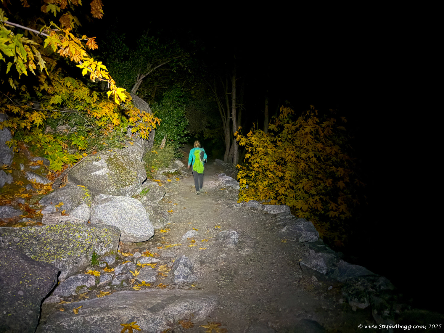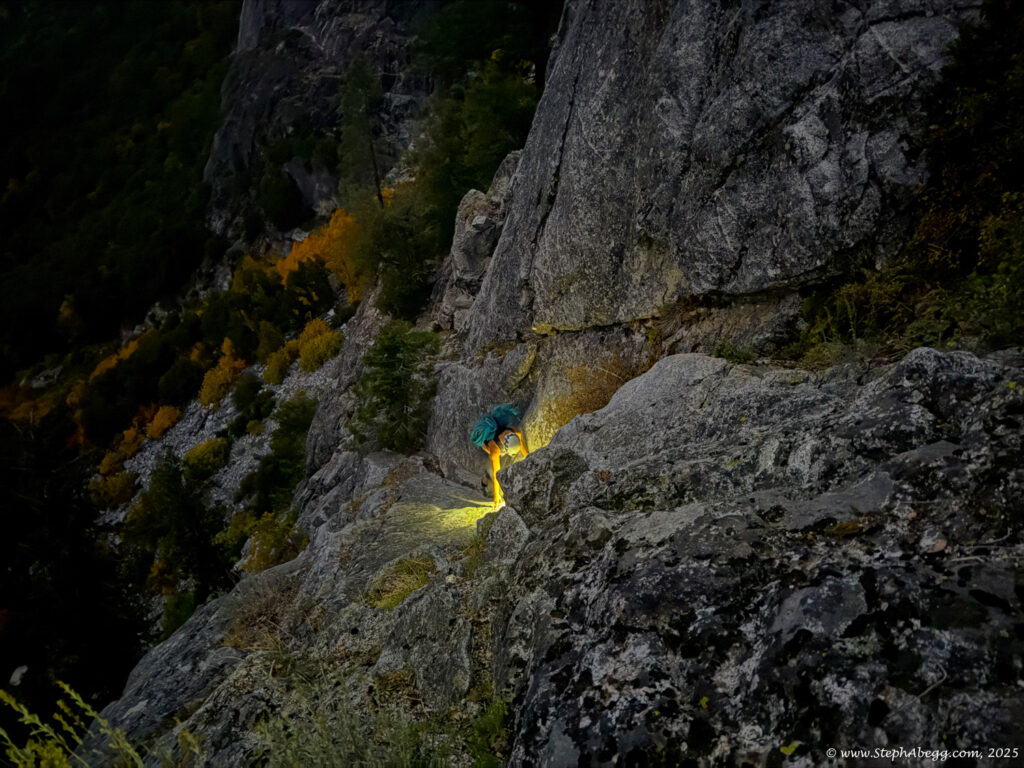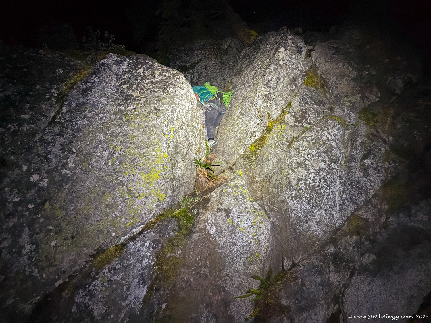 I ended up leading the entire route while Brooke followed with a small pack carrying our extra water, food, layers, headlamps, and shoes—a fair trade, in my opinion! I loved leading the full burly adventure, though I think I set a personal record for longest lead in the Narrows. I felt seriously claustrophobic in there and struggled to keep moving upward, but we made steady progress and topped out just before sunset. The descent was tedious and entirely in the dark, but we found a good line and reached the car just under four hours after leaving the summit.