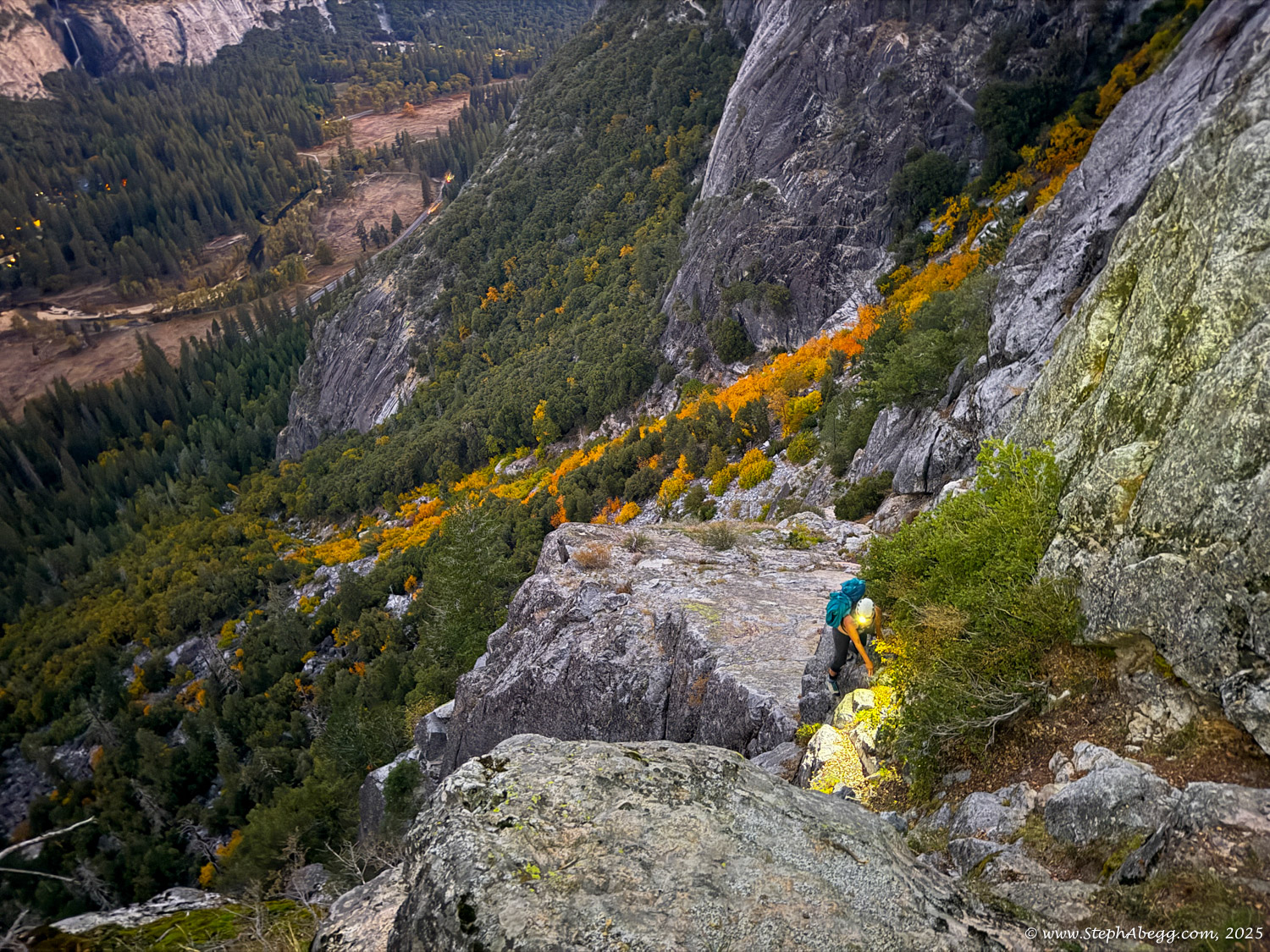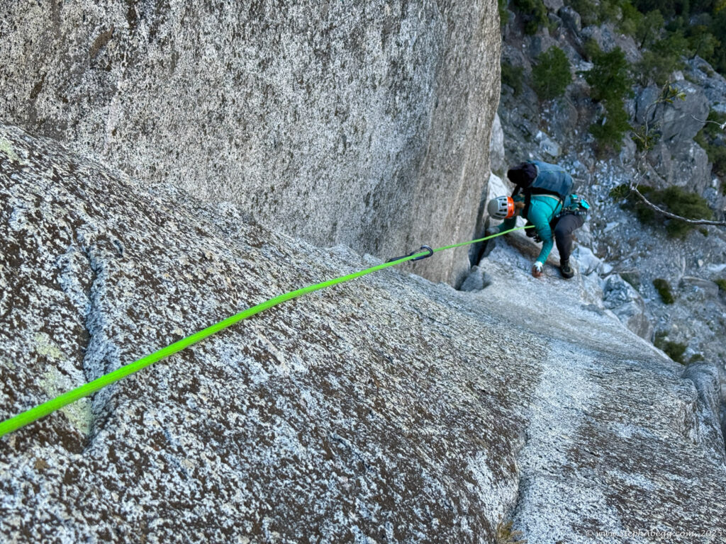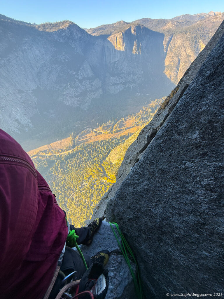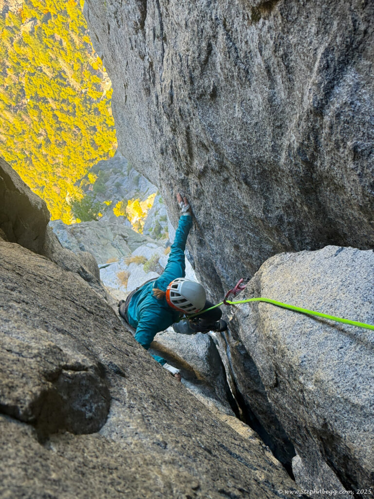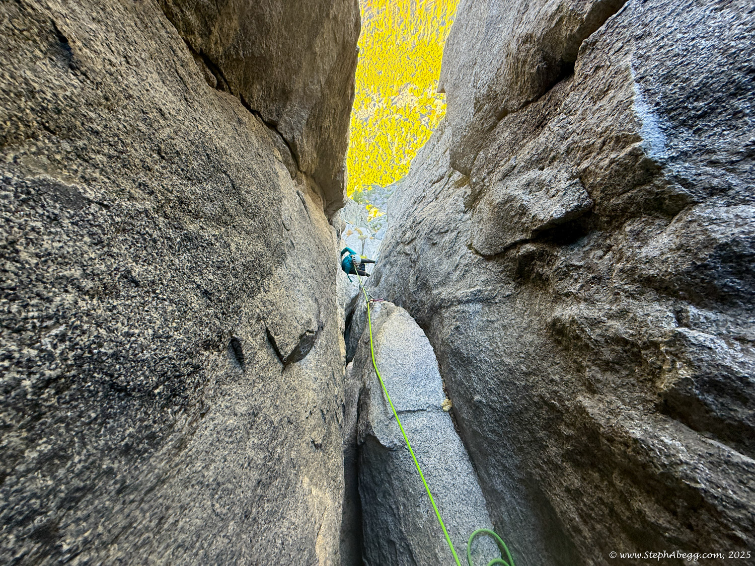 In 2025, I made two Valley trips, in June and October. With its shady aspect and long daylight hours, June seemed ideal for another go—but I couldn’t find a partner. (I’ll admit I’m a bit picky—this is a long, burly adventure, not a casual day out for anyone who just thinks they can “cruise 10b.”) When I came back in October, I renewed my search, posting on Mountain Project and bugging Nate. With shorter days and cold shade, the route’s Type 2 fun factor was definitely higher. Luckily, Brooke Schuemann responded with interest, and we made plans.