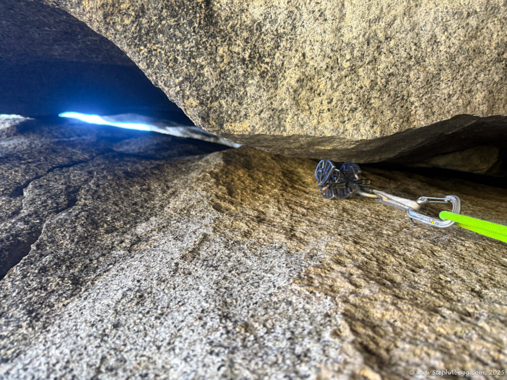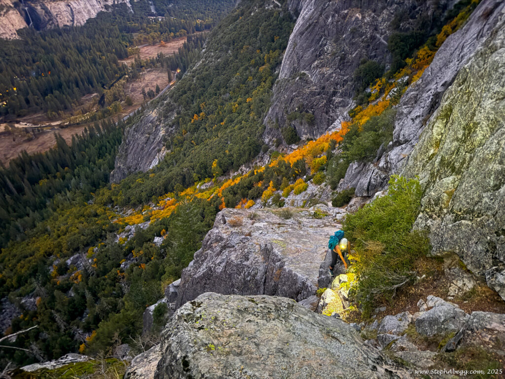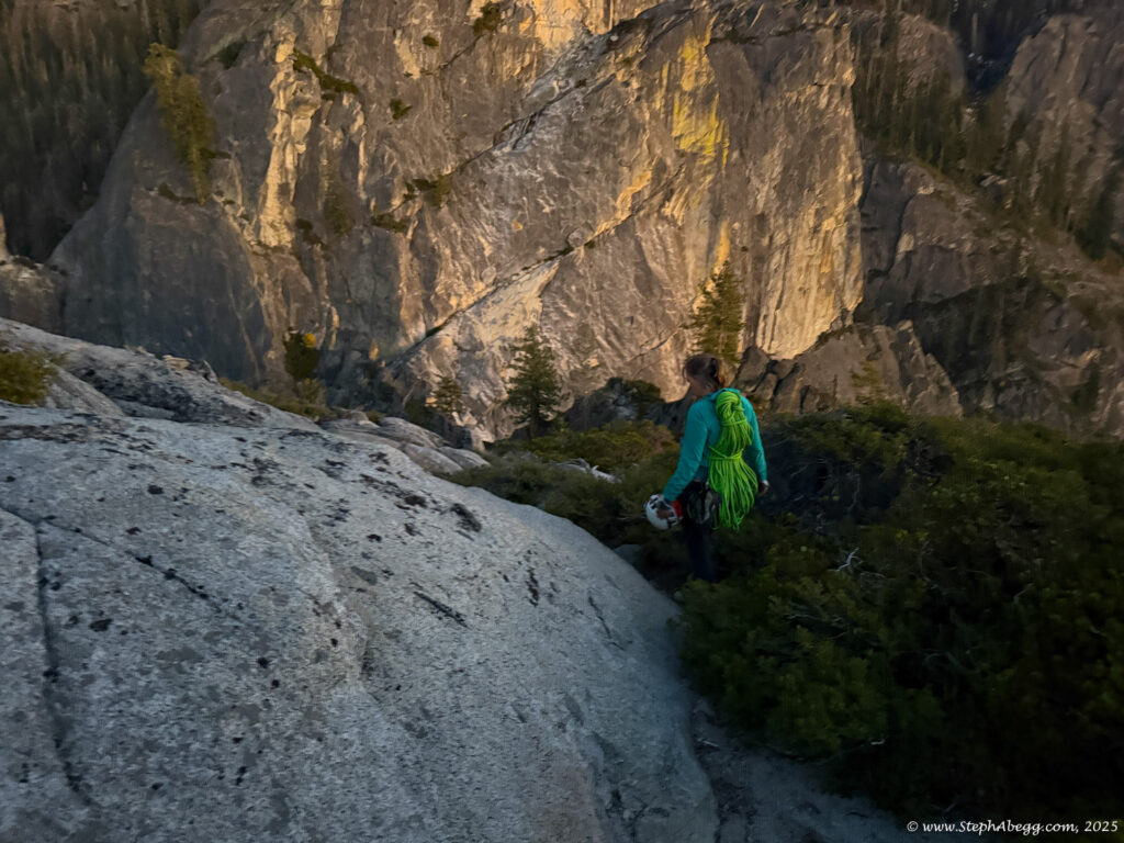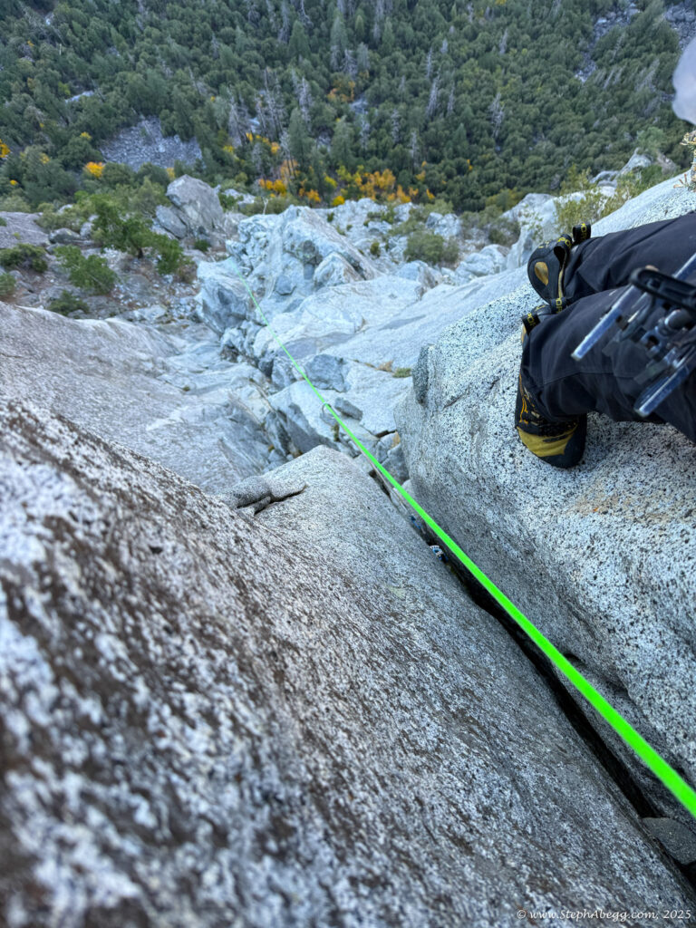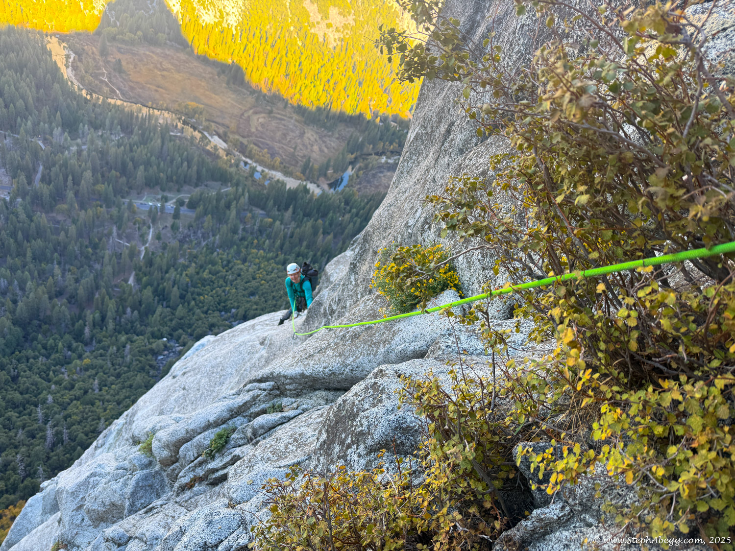 In 2025, I made two Valley trips, in June and October. With its shady aspect and long daylight hours, June seemed ideal for another go—but I couldn’t find a partner. (I’ll admit I’m a bit picky—this is a long, burly adventure, not a casual day out for anyone who just thinks they can “cruise 10b.”) When I came back in October, I renewed my search, posting on Mountain Project and bugging Nate. With shorter days and cold shade, the route’s Type 2 fun factor was definitely higher. Luckily, Brooke Schuemann responded with interest, and we made plans.
