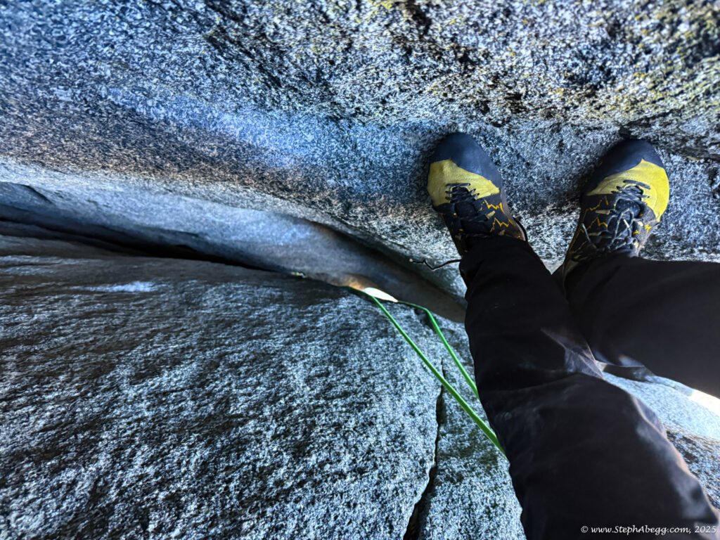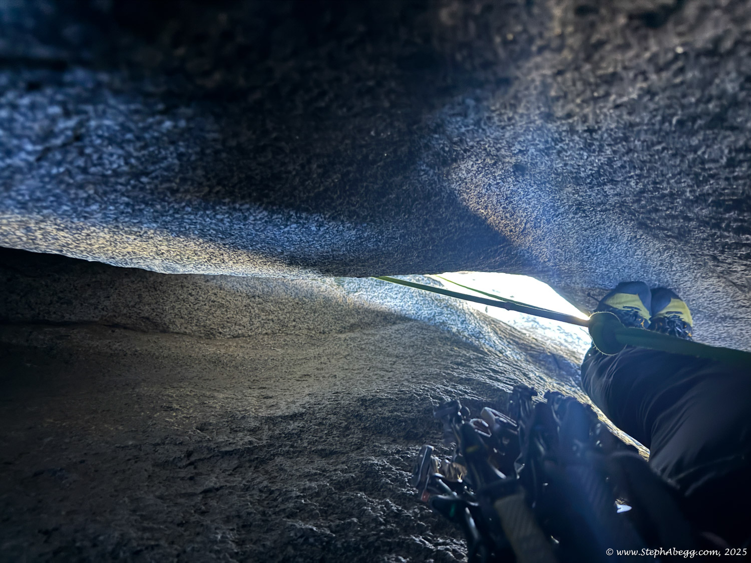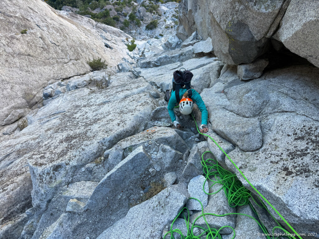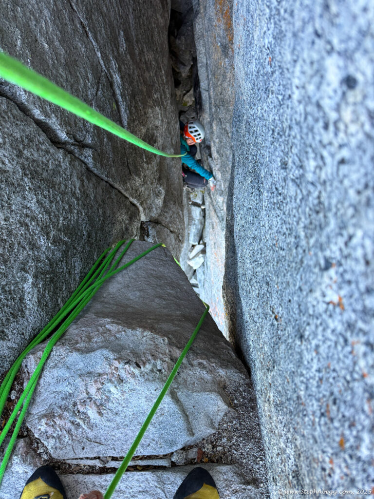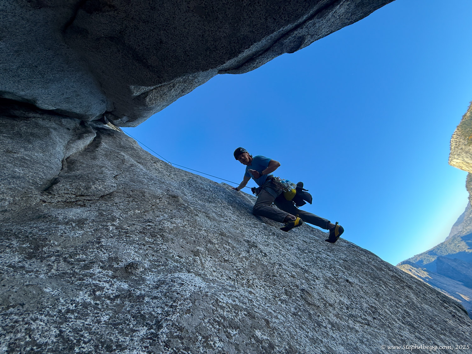 In 2025, I made two Valley trips, in June and October. With its shady aspect and long daylight hours, June seemed ideal for another go—but I couldn’t find a partner. (I’ll admit I’m a bit picky—this is a long, burly adventure, not a casual day out for anyone who just thinks they can “cruise 10b.”) When I came back in October, I renewed my search, posting on Mountain Project and bugging Nate. With shorter days and cold shade, the route’s Type 2 fun factor was definitely higher. Luckily, Brooke Schuemann responded with interest, and we made plans.