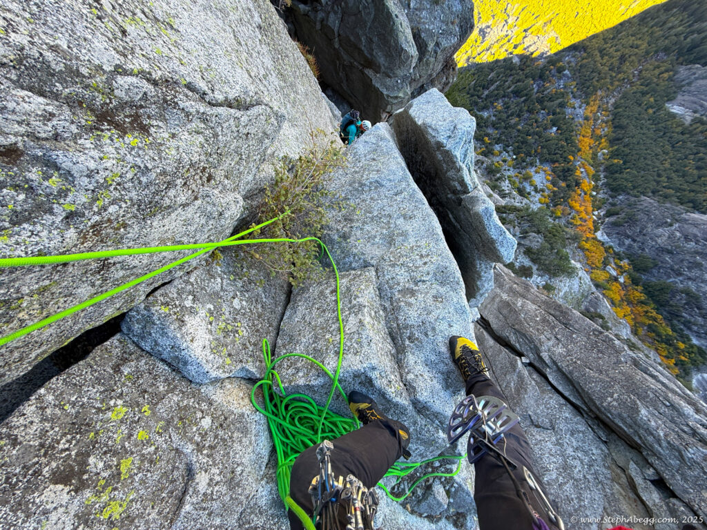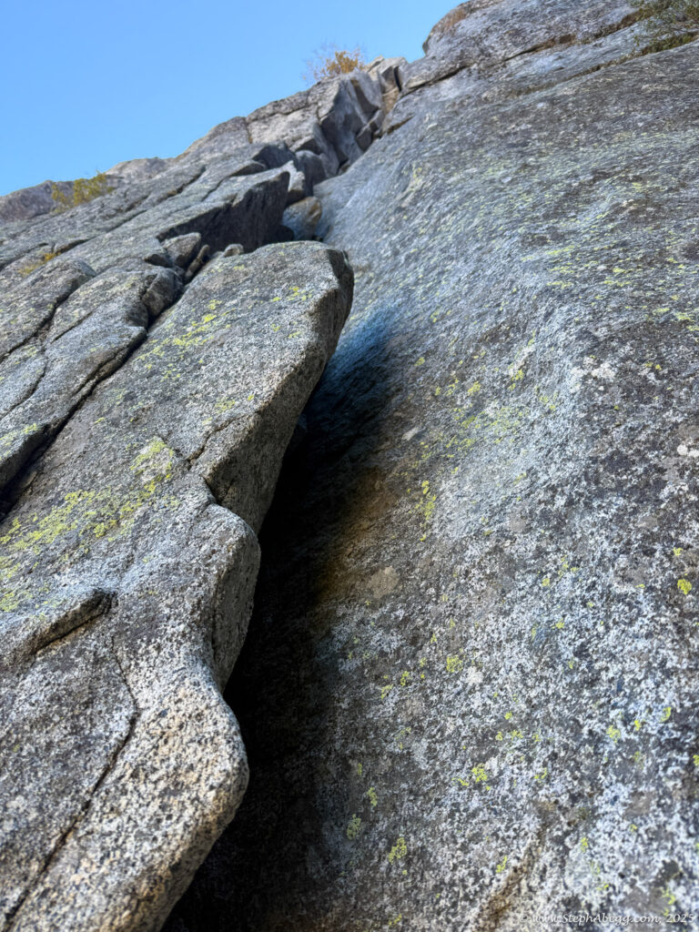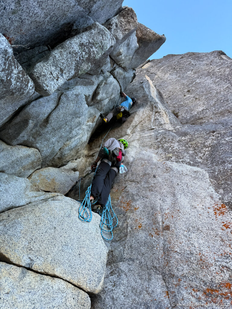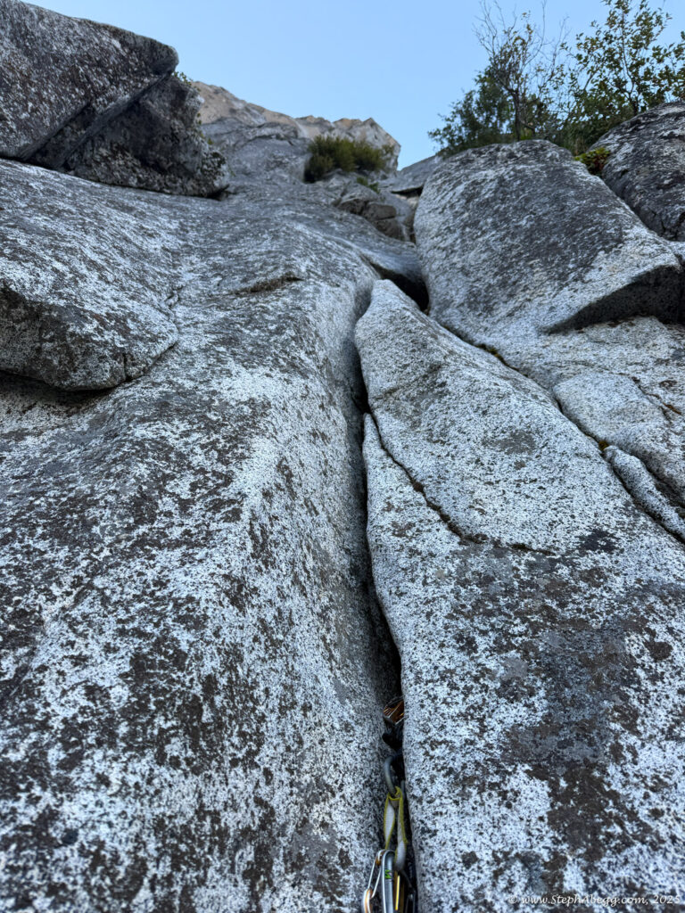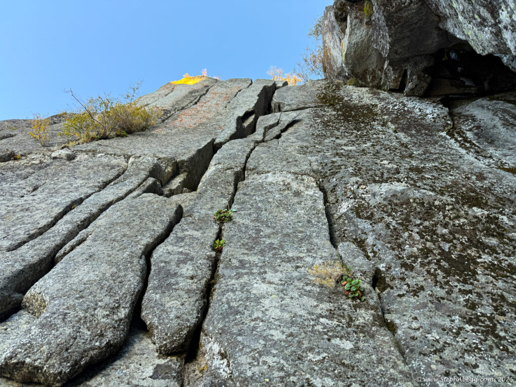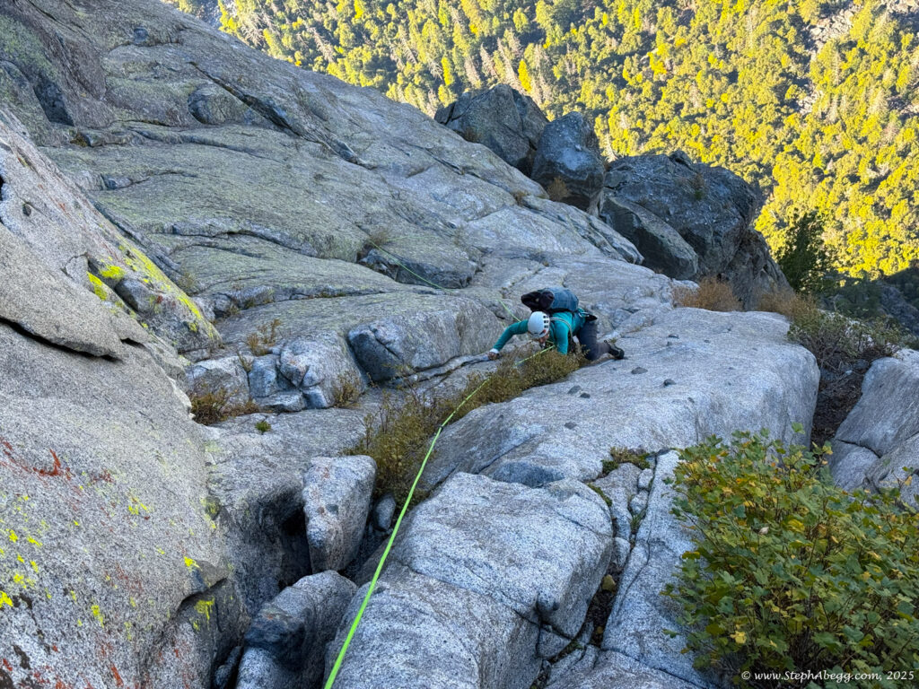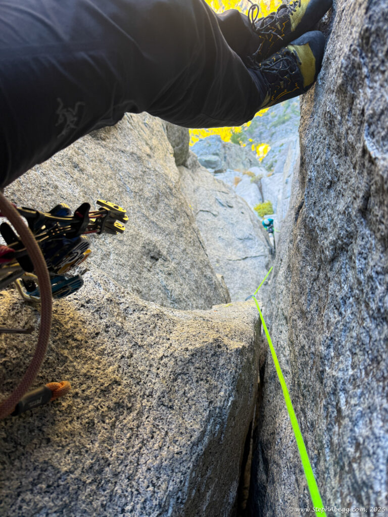With warm fall temps and calm winds, it was a perfect day to be on The Sentinel. Only one other party was on the route—they were simulclimbing and passed us early on.