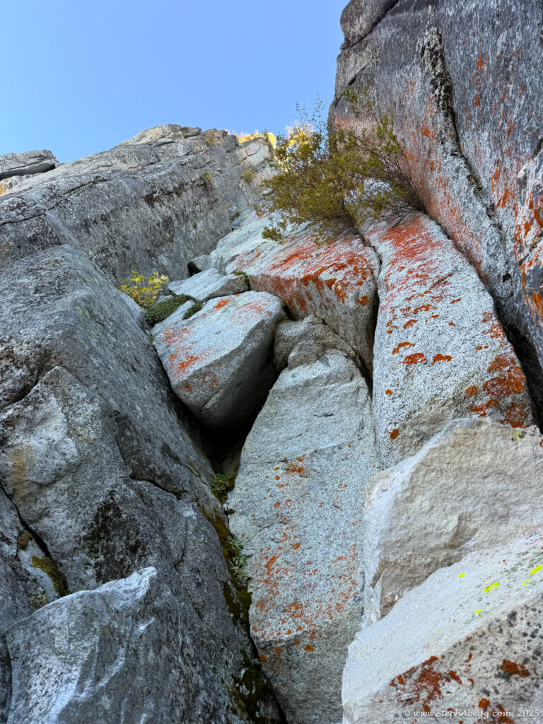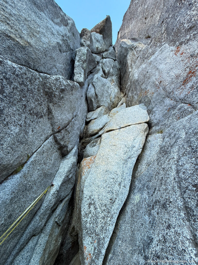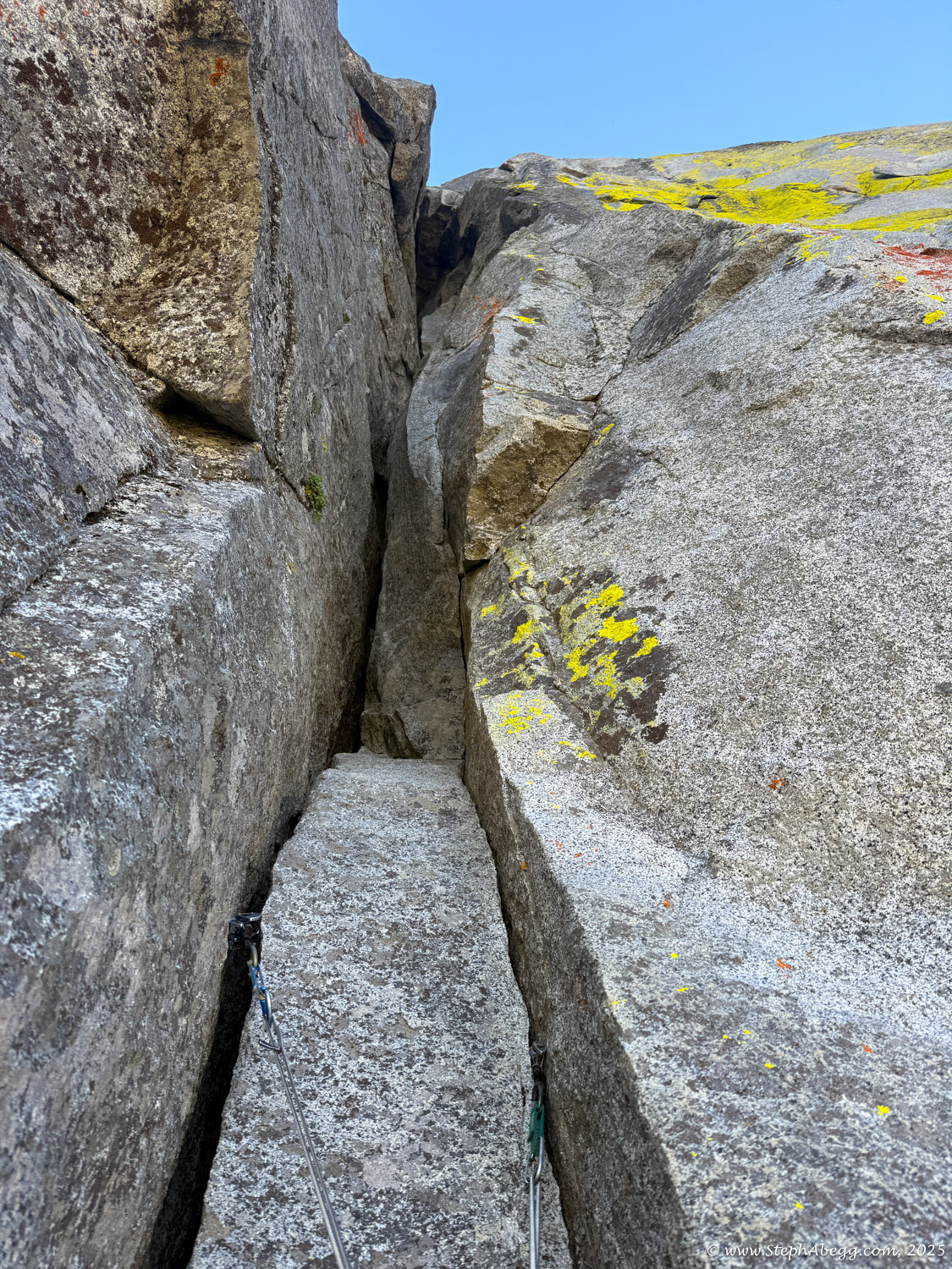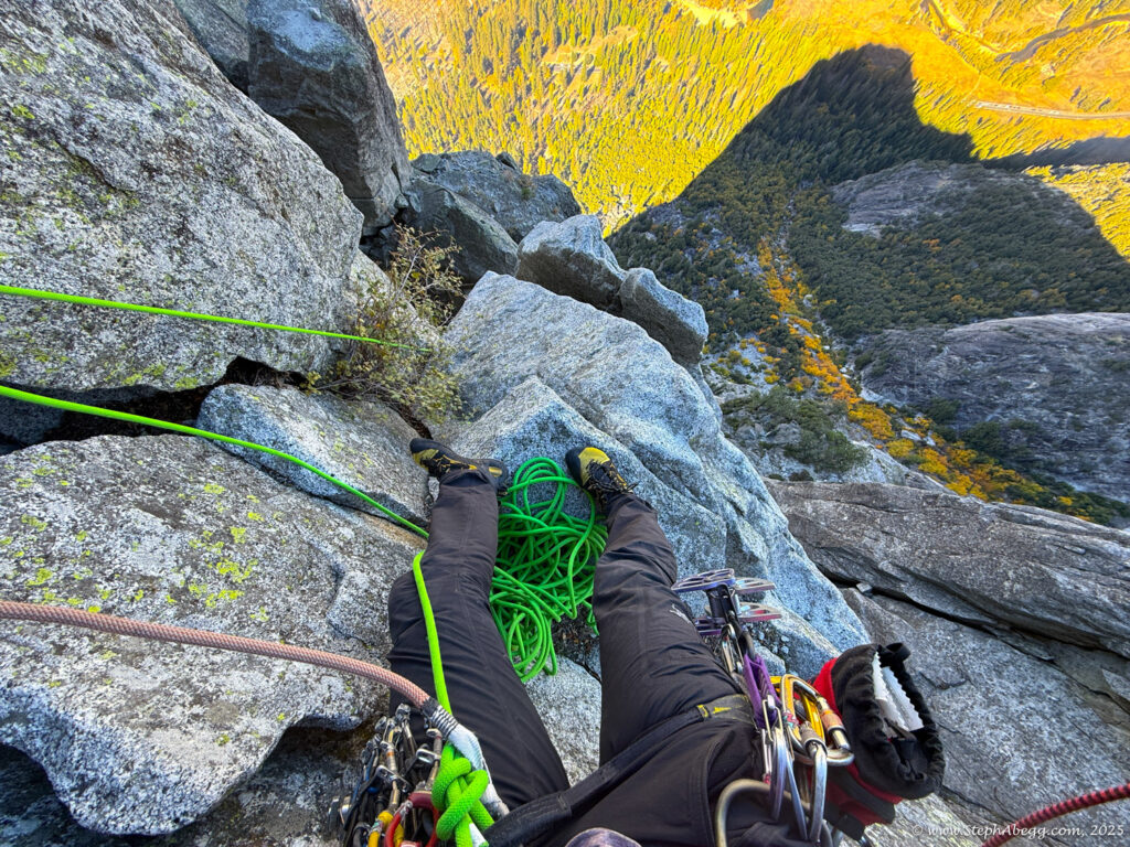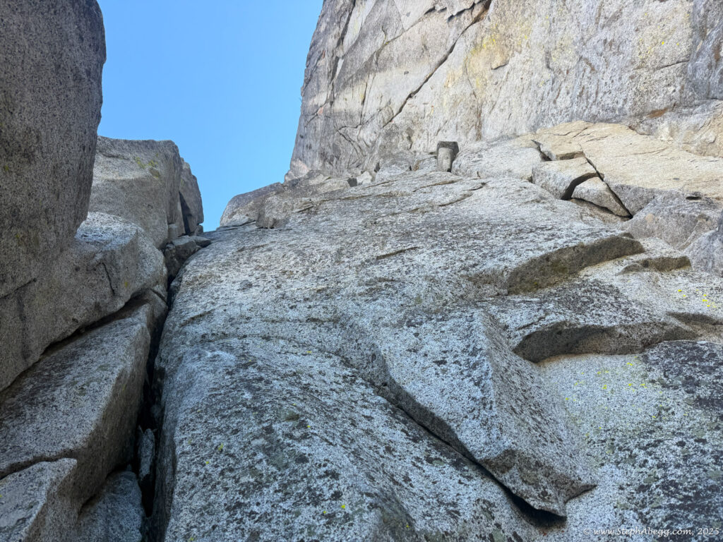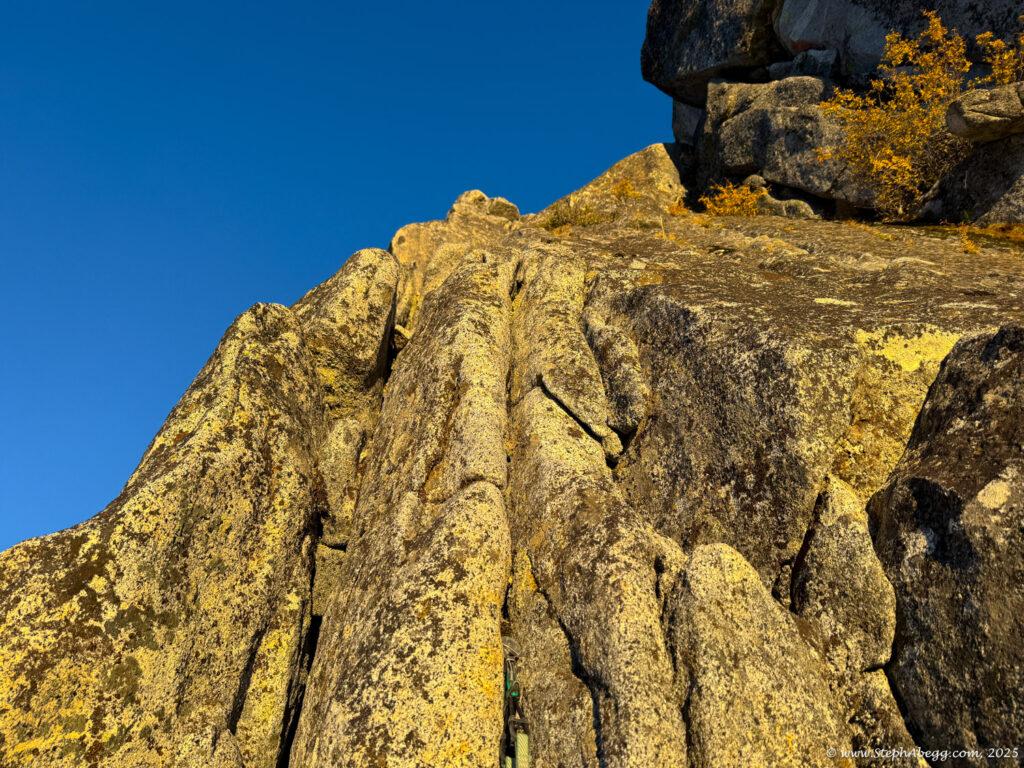 With warm fall temps and calm winds, it was a perfect day to be on The Sentinel. Only one other party was on the route—they were simulclimbing and passed us early on.