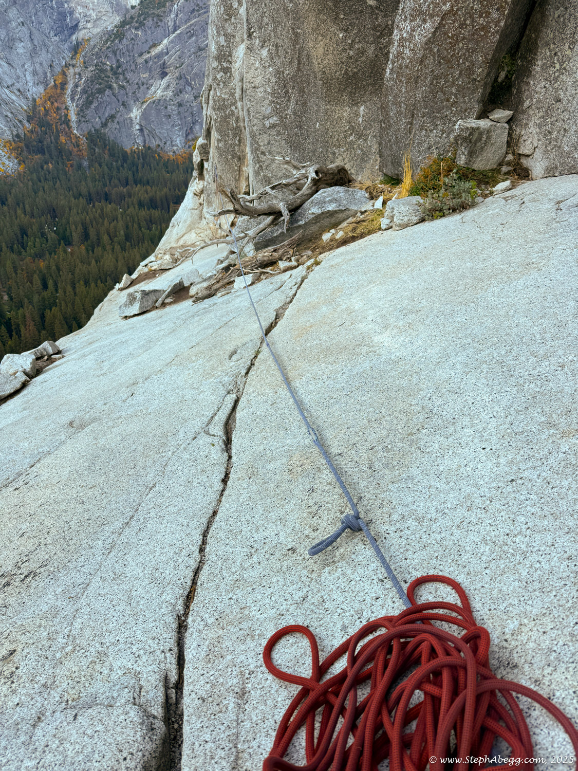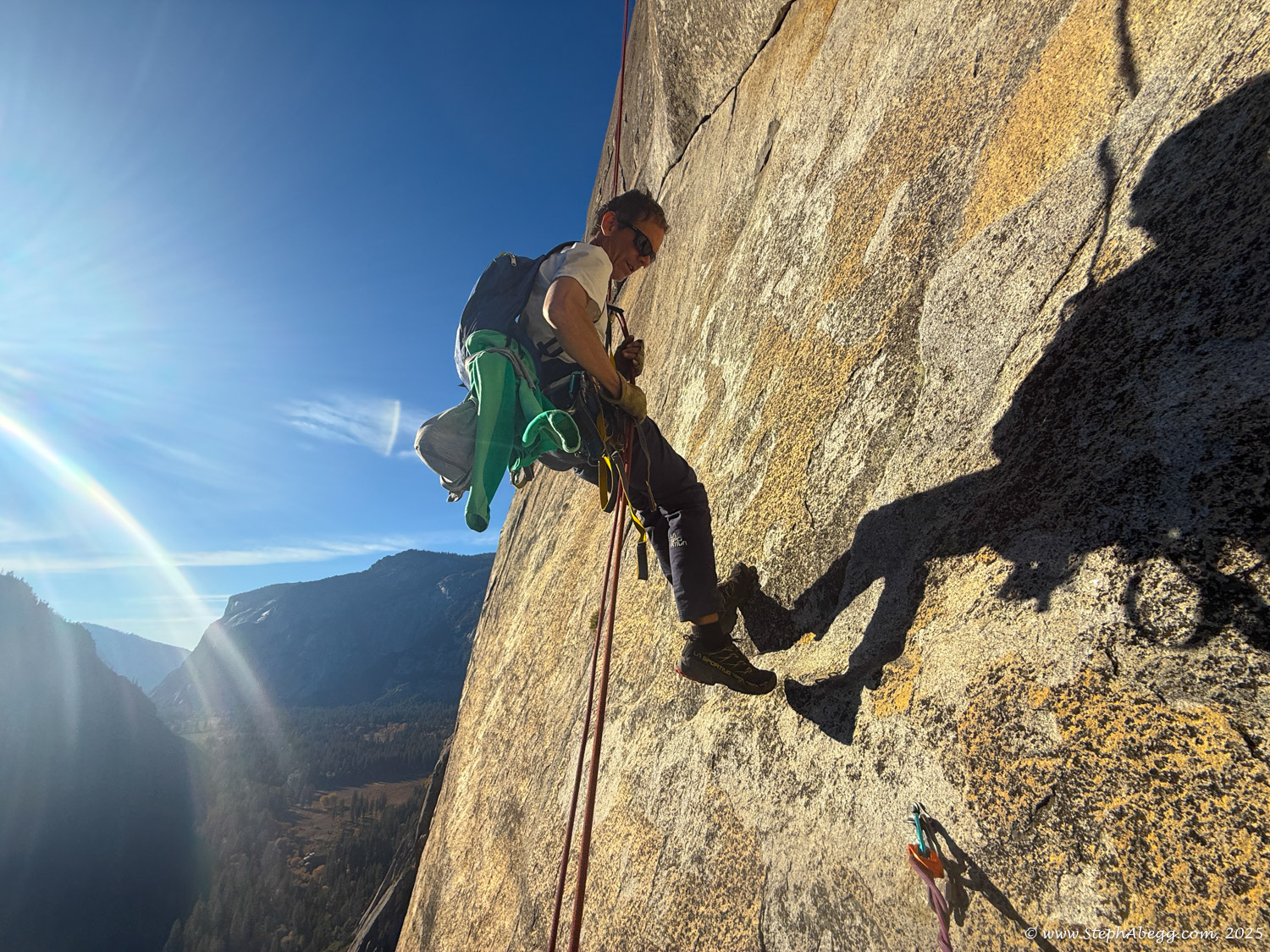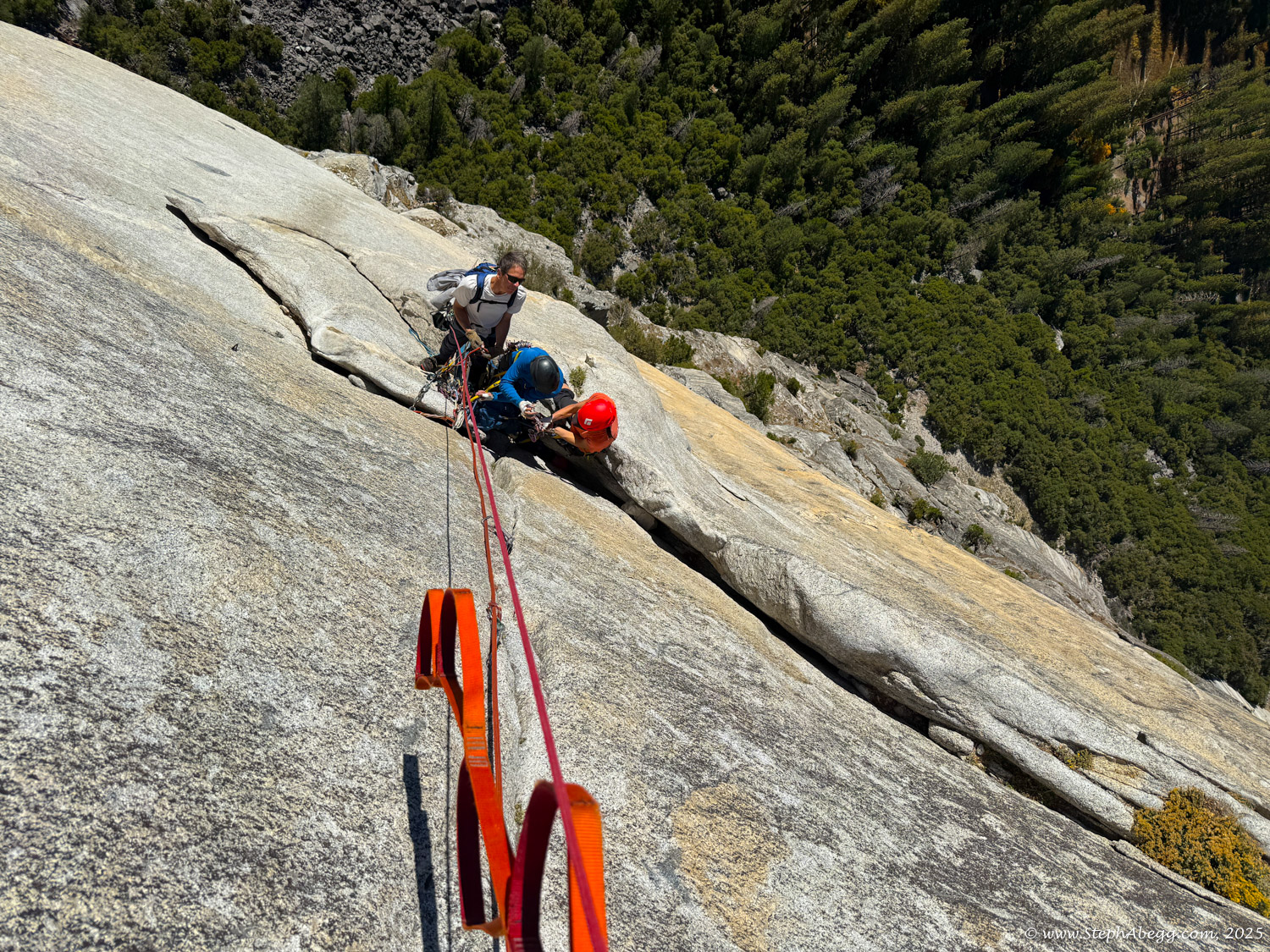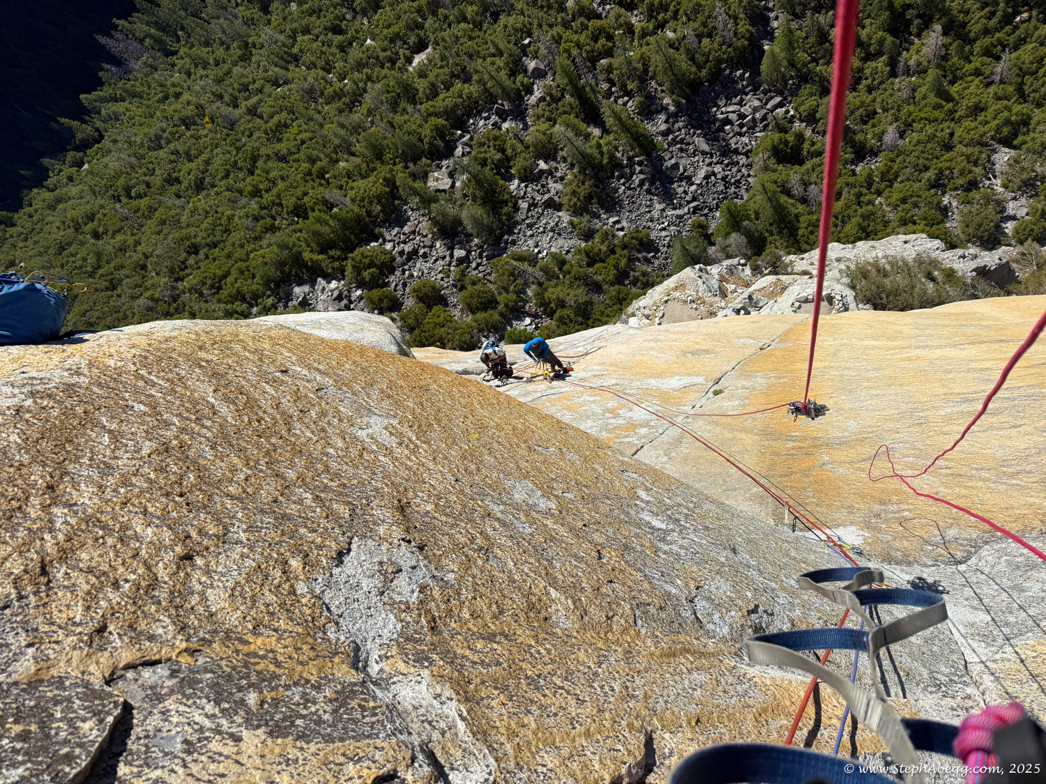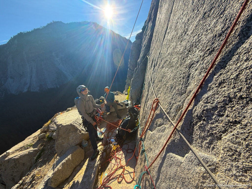 There were several other parties on the wall that day. Two were ahead of us, both having started from Dinner Ledge, and we passed one of them on the way up. When we rappelled, a few more teams were on Dinner Ledge fixing pitches above.