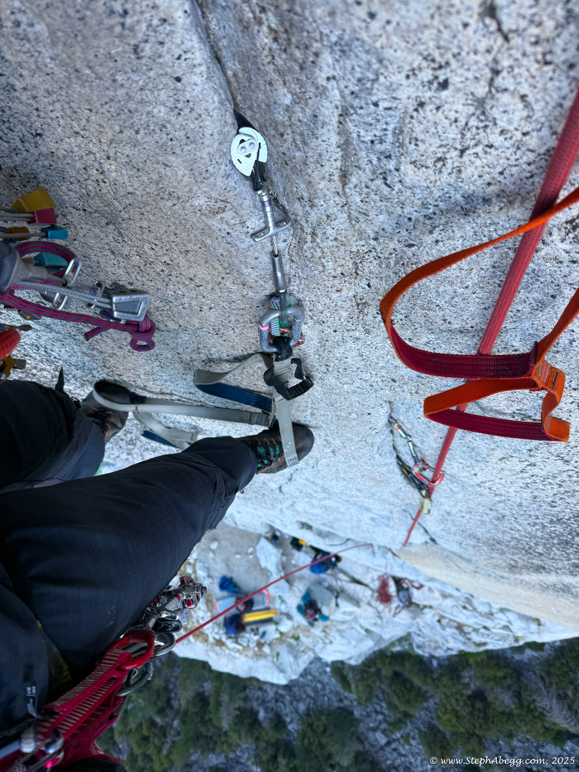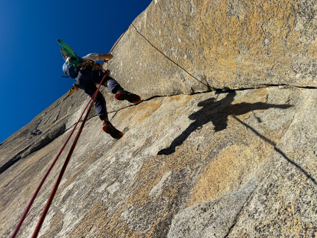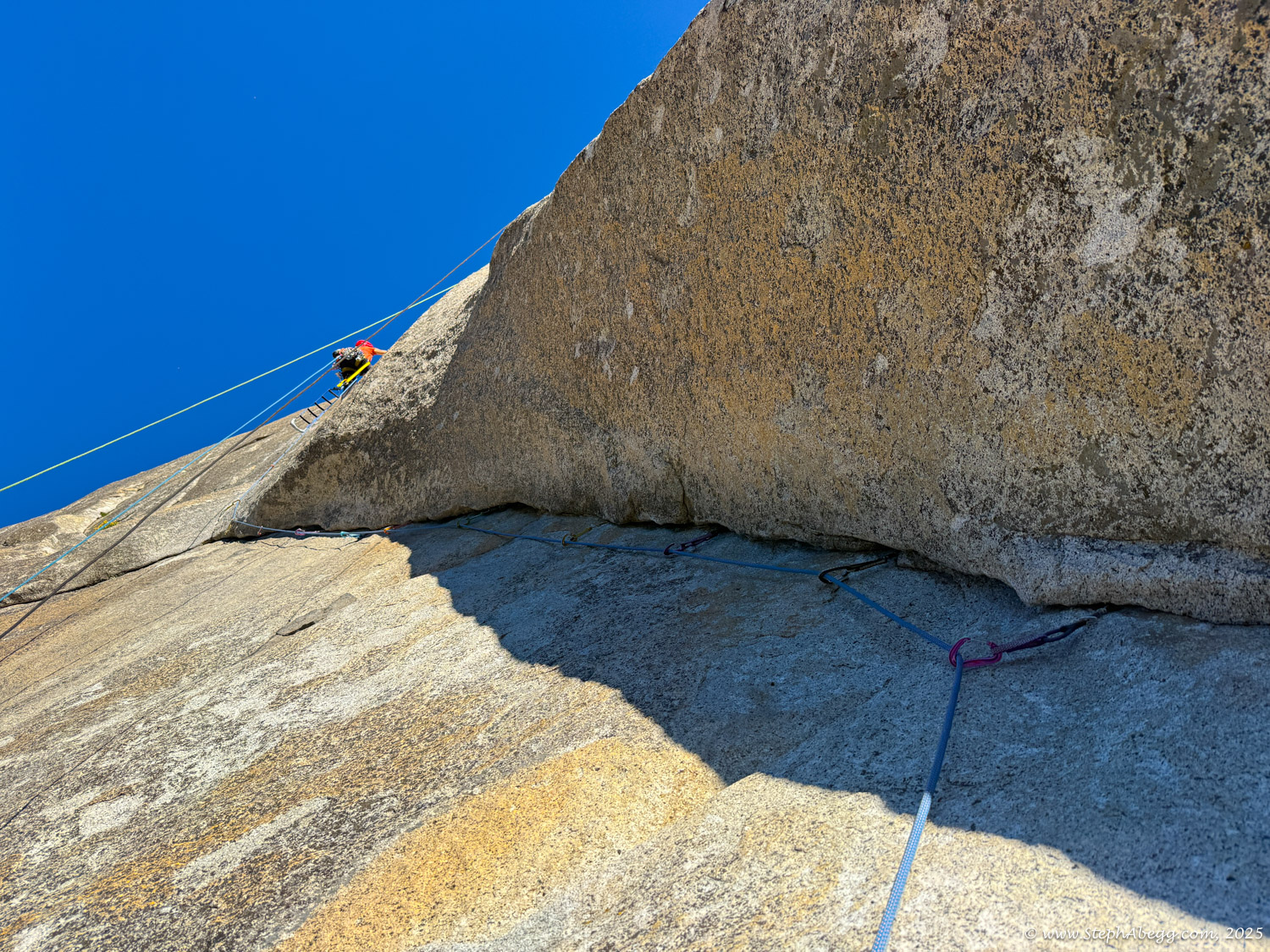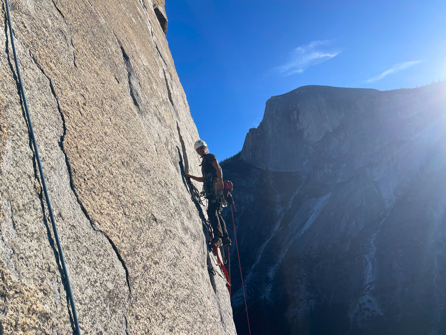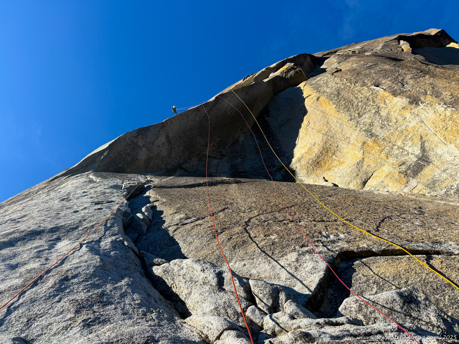 We short-fixed to stay efficient: I’d pull up slack to fix the rope for Nate to jug, yell “rope fixed,” and start into the next pitch, effectively belayed by the anchor. When Nate reached the anchor, he’d put me on belay and clip the gear he’d cleaned to the tag line I was trailing, which I’d then haul up to resupply. The system worked smoothly—we topped out our route in 7 hours and 21 minutes.
