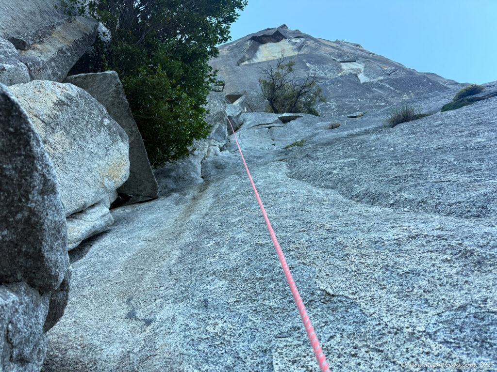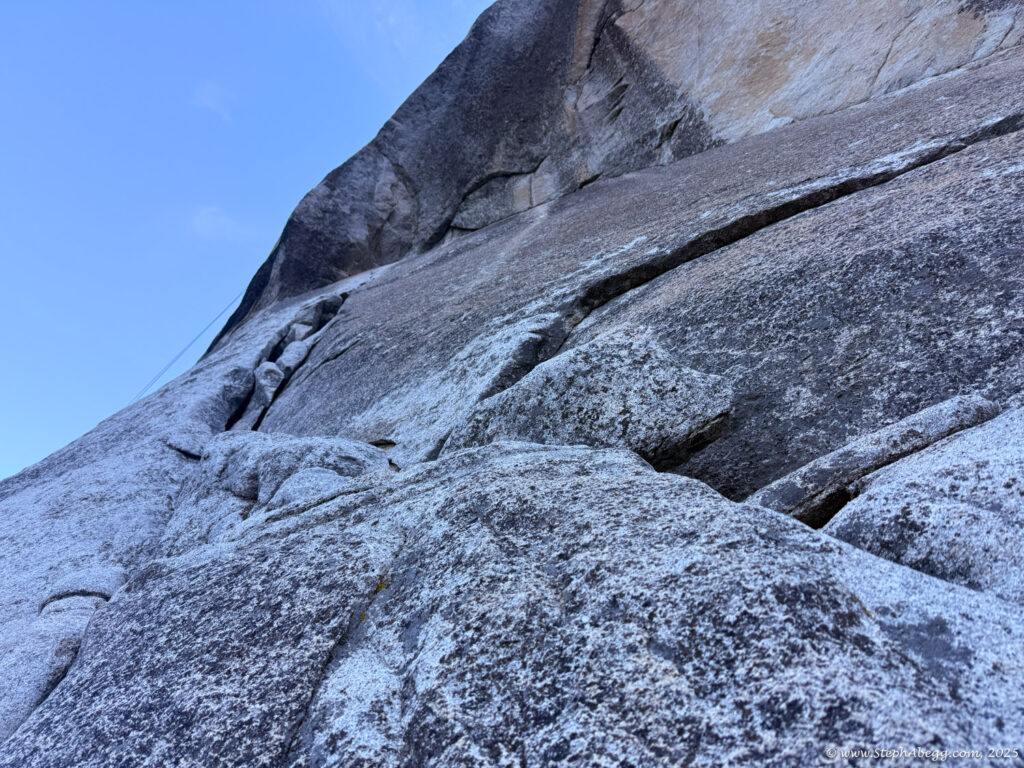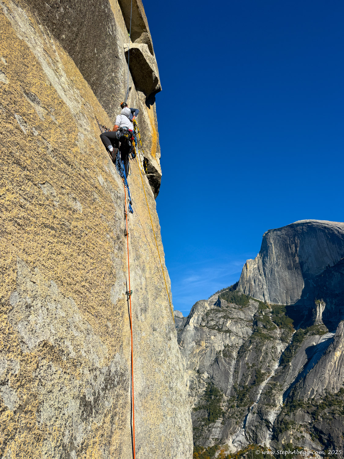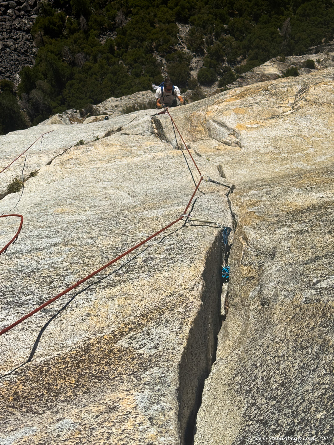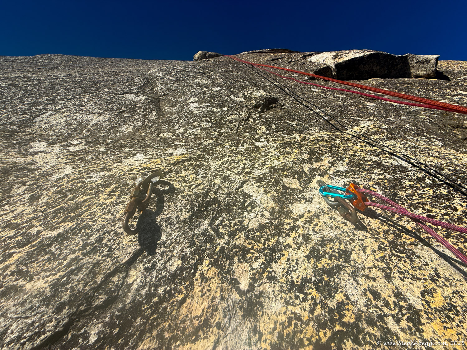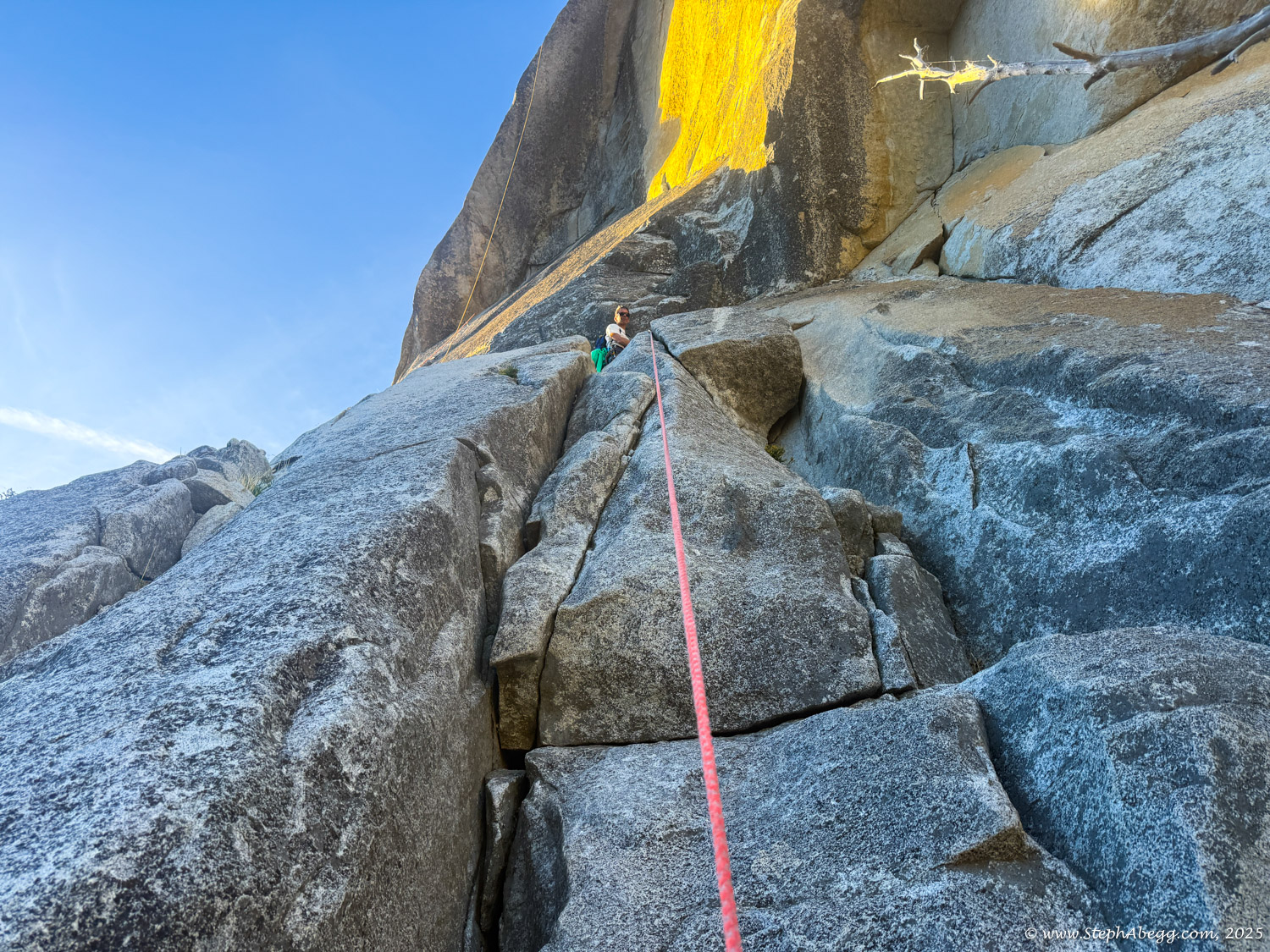 We short-fixed to stay efficient: I’d pull up slack to fix the rope for Nate to jug, yell “rope fixed,” and start into the next pitch, effectively belayed by the anchor. When Nate reached the anchor, he’d put me on belay and clip the gear he’d cleaned to the tag line I was trailing, which I’d then haul up to resupply. The system worked smoothly—we topped out our route in 7 hours and 21 minutes.