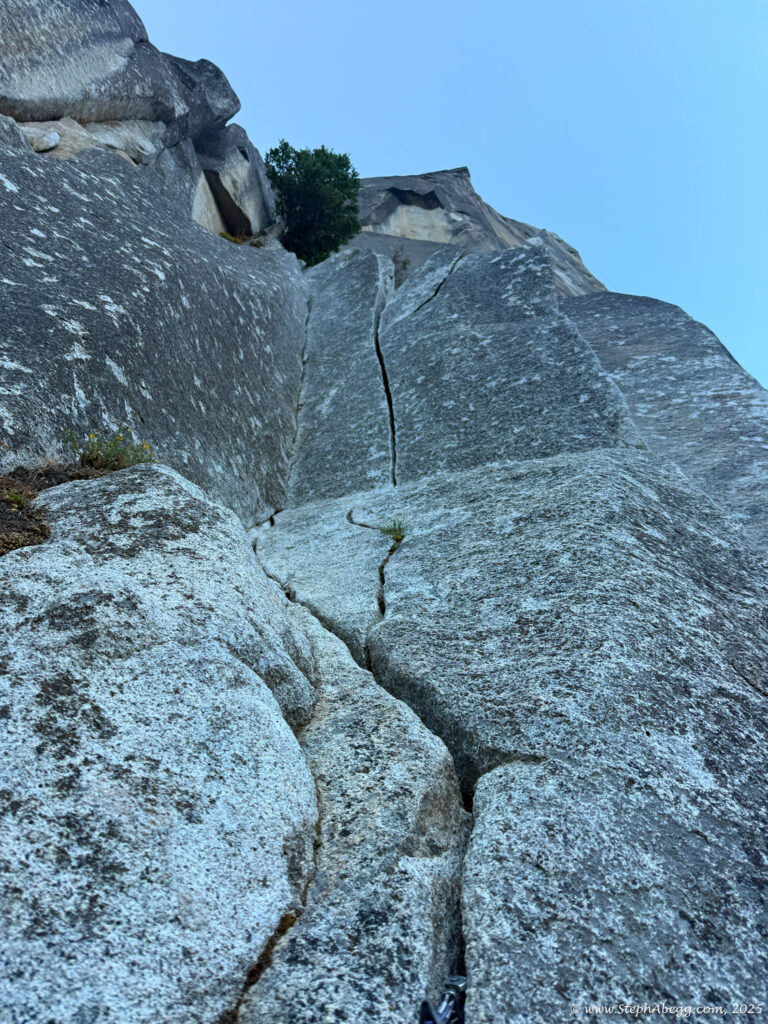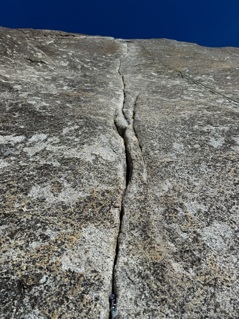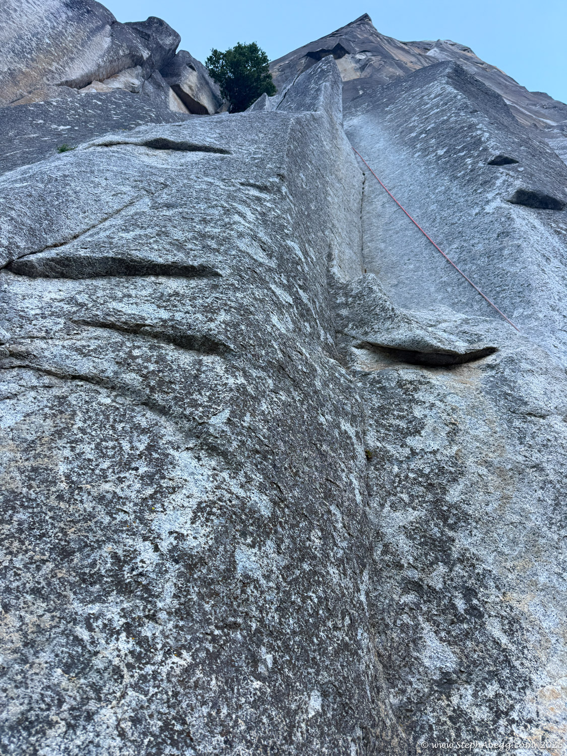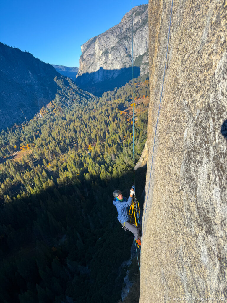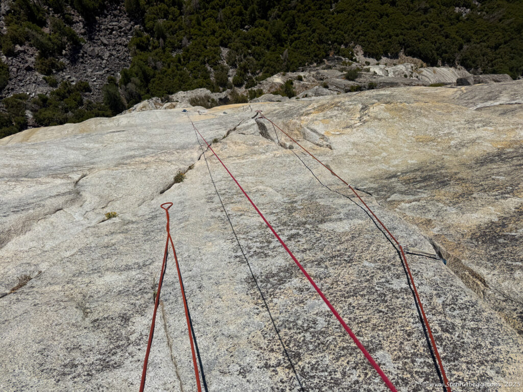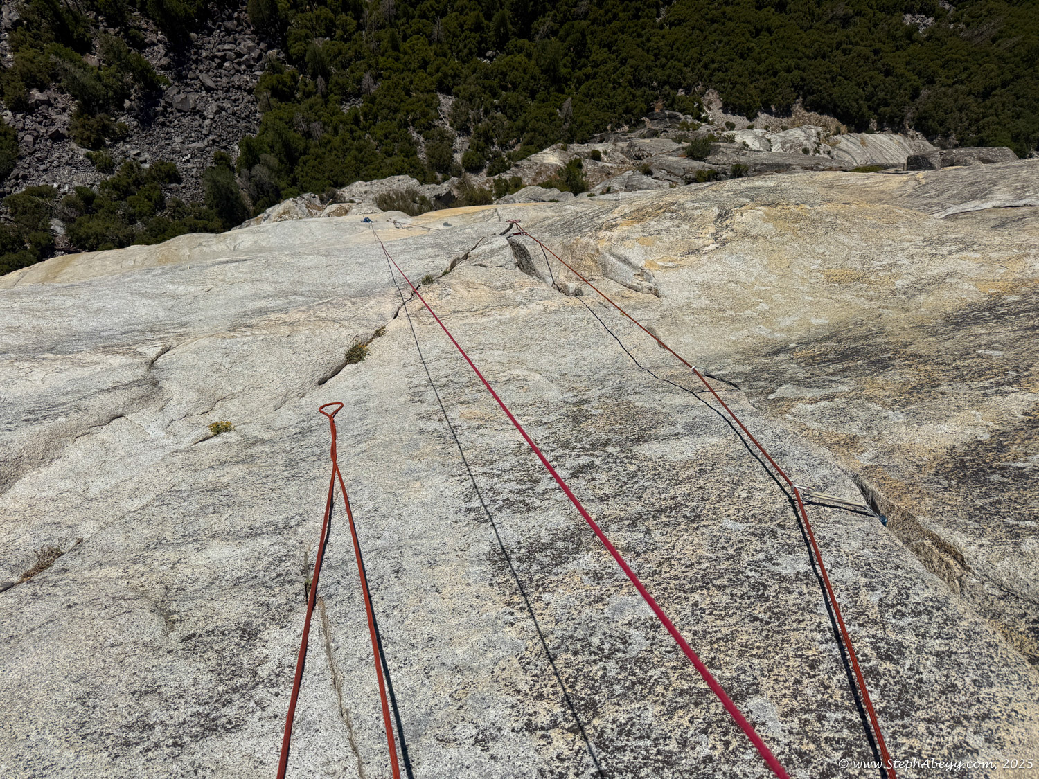 We short-fixed to stay efficient: I’d pull up slack to fix the rope for Nate to jug, yell “rope fixed,” and start into the next pitch, effectively belayed by the anchor. When Nate reached the anchor, he’d put me on belay and clip the gear he’d cleaned to the tag line I was trailing, which I’d then haul up to resupply. The system worked smoothly—we topped out our route in 7 hours and 21 minutes.