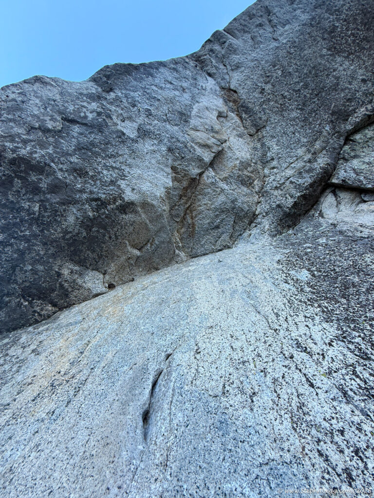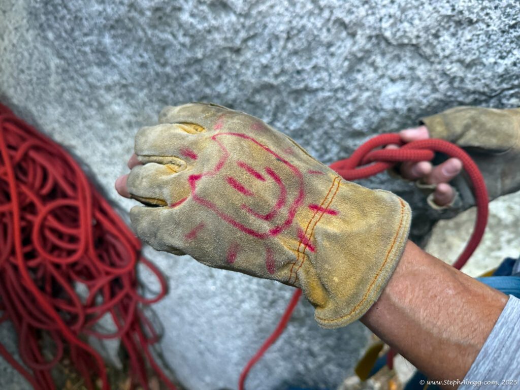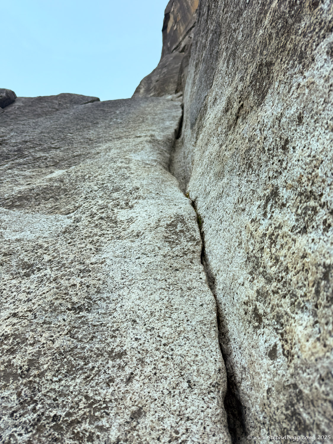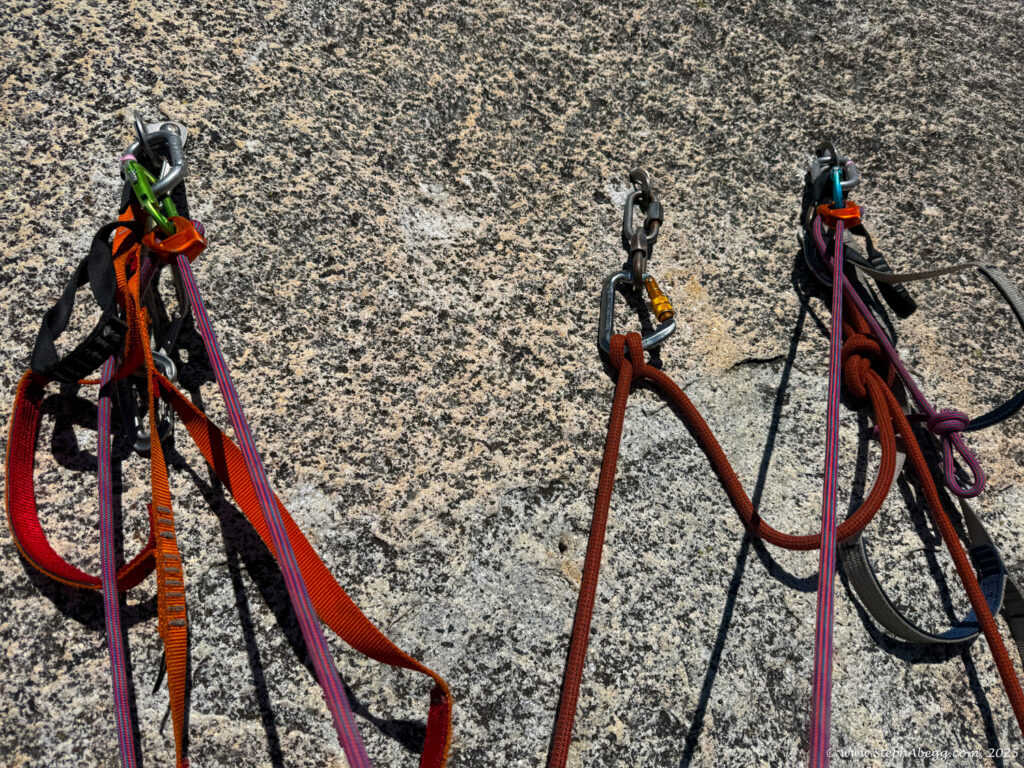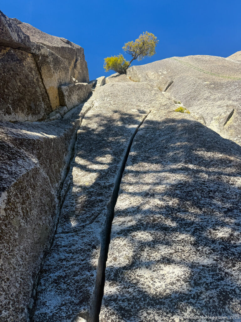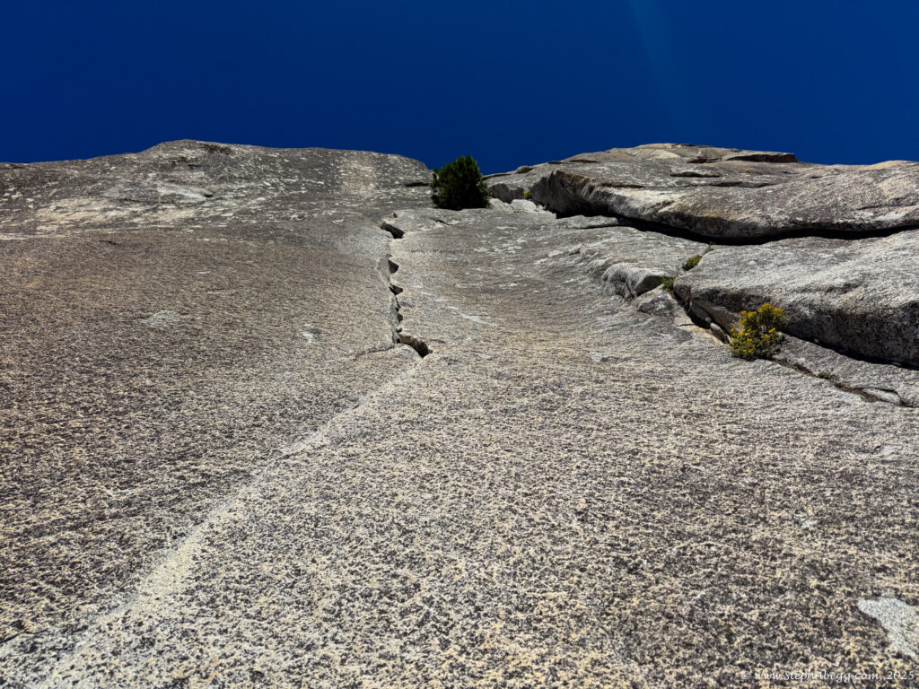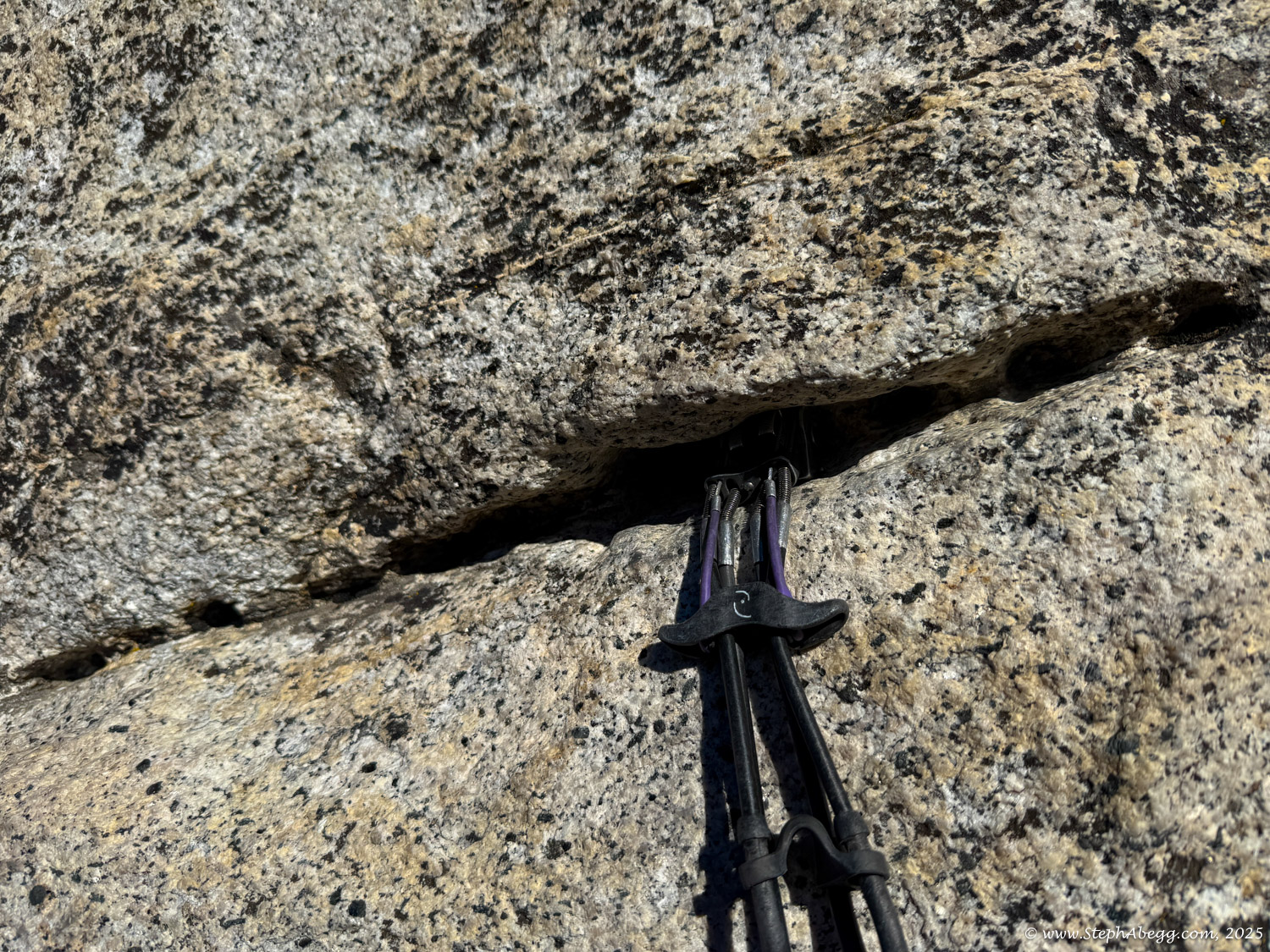 We short-fixed to stay efficient: I’d pull up slack to fix the rope for Nate to jug, yell “rope fixed,” and start into the next pitch, effectively belayed by the anchor. When Nate reached the anchor, he’d put me on belay and clip the gear he’d cleaned to the tag line I was trailing, which I’d then haul up to resupply. The system worked smoothly—we topped out our route in 7 hours and 21 minutes.