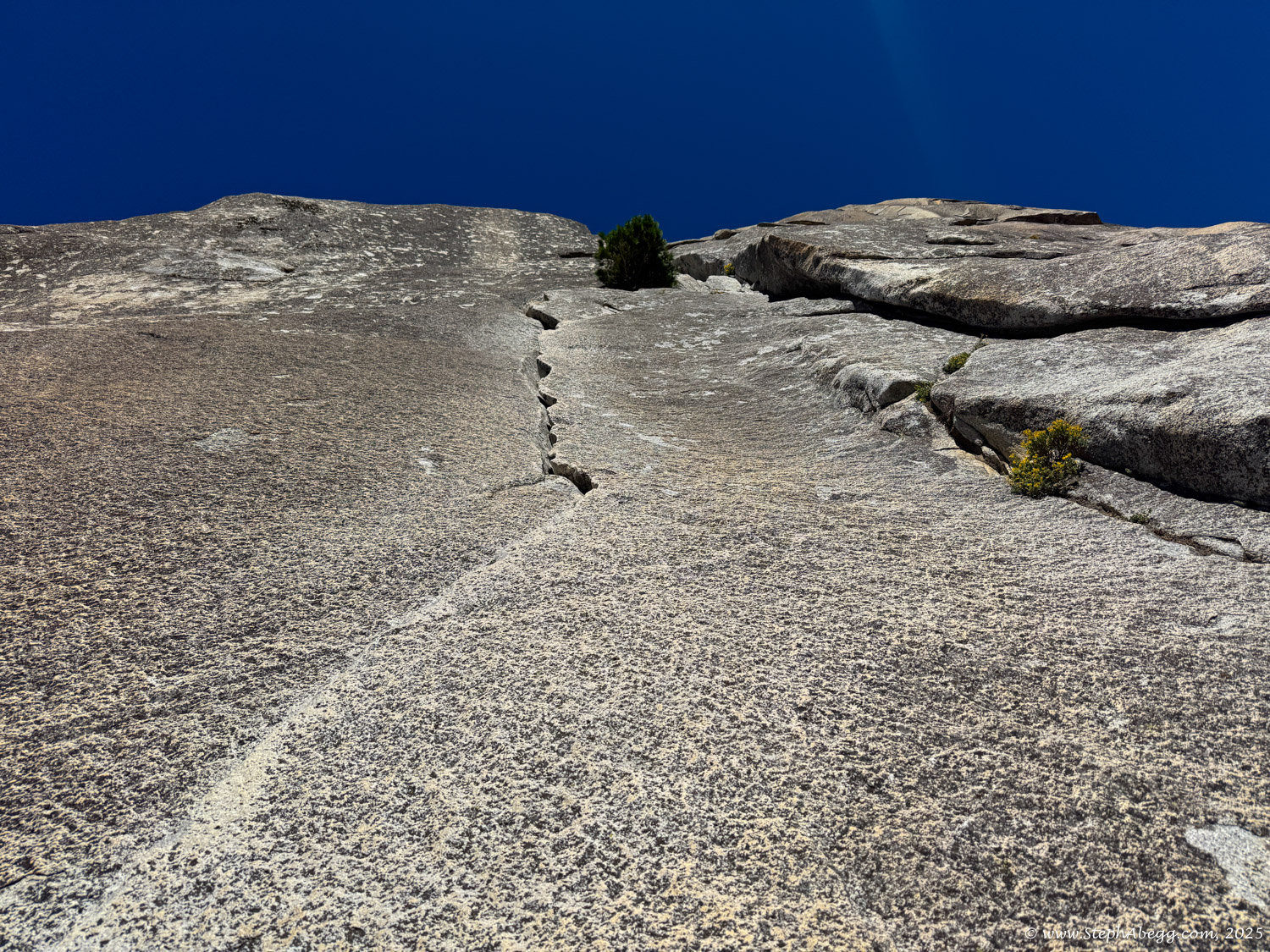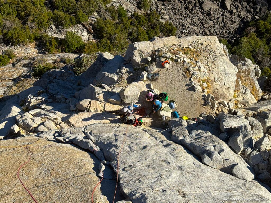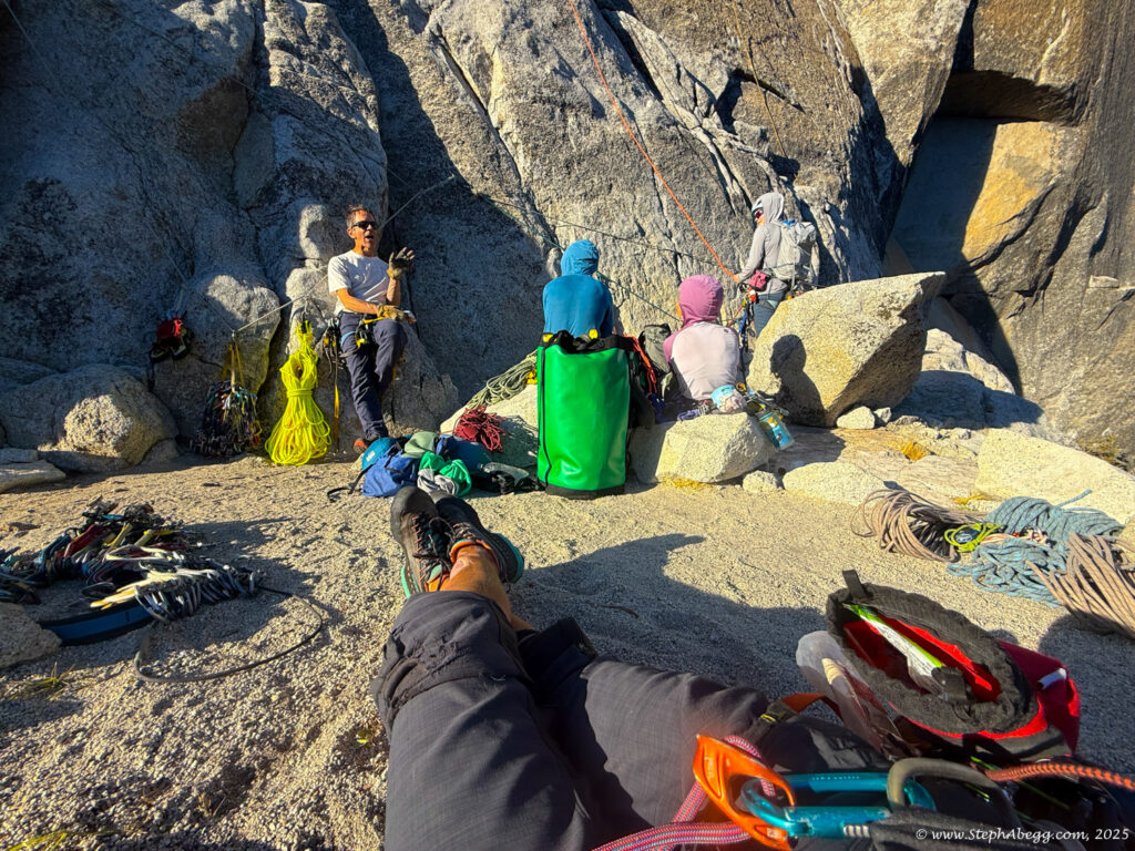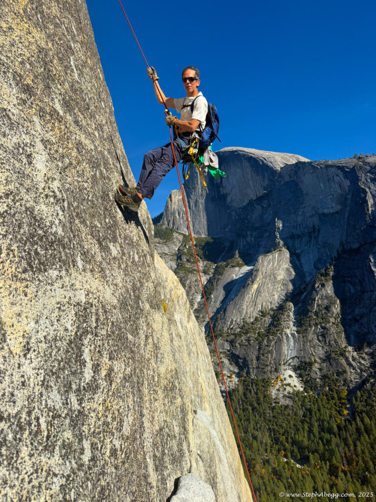 We debated walking off via the North Dome Gully but opted to rappel instead. We skipped Pitch 11 to the true summit (reportedly chossy and unremarkable). The descent went quickly, and we enjoyed hanging out on Dinner Ledge chatting with the other climbers.