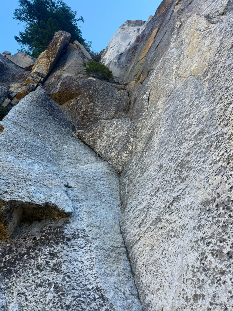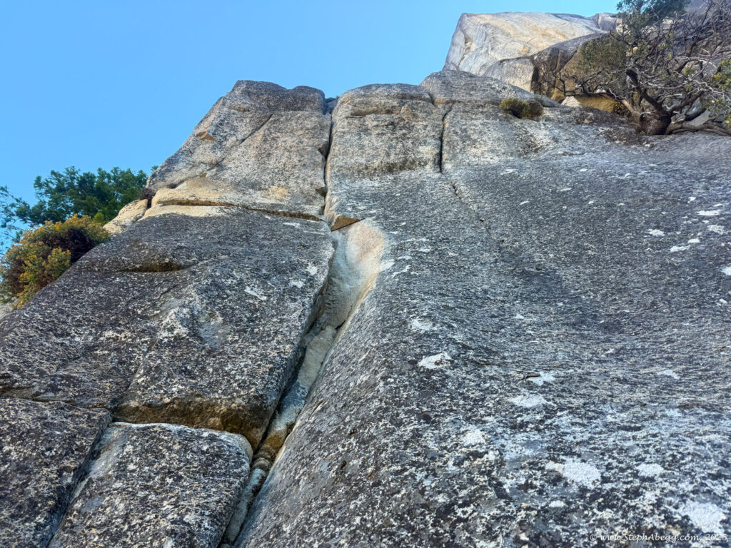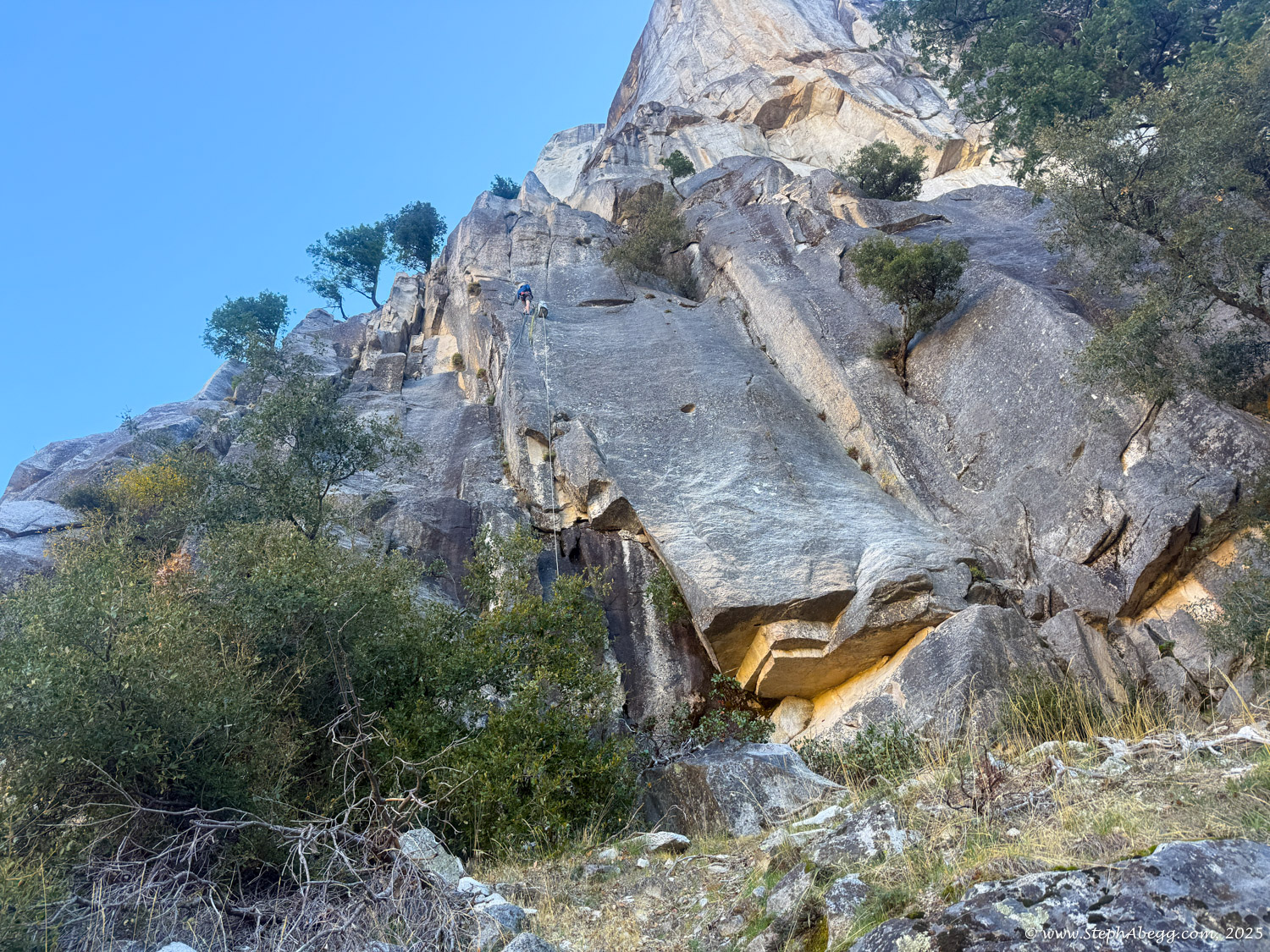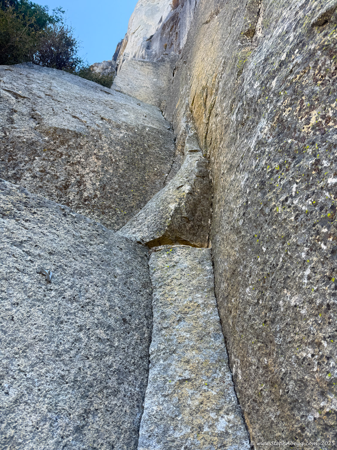 Wayward Son is roughly 55% independent and 45% shared with Call of the Yeti. It faces northwest and stays shaded until around 2 PM (depending on the season). The first ascent was completed in the morning of a day that later reached 94°F in the Valley.