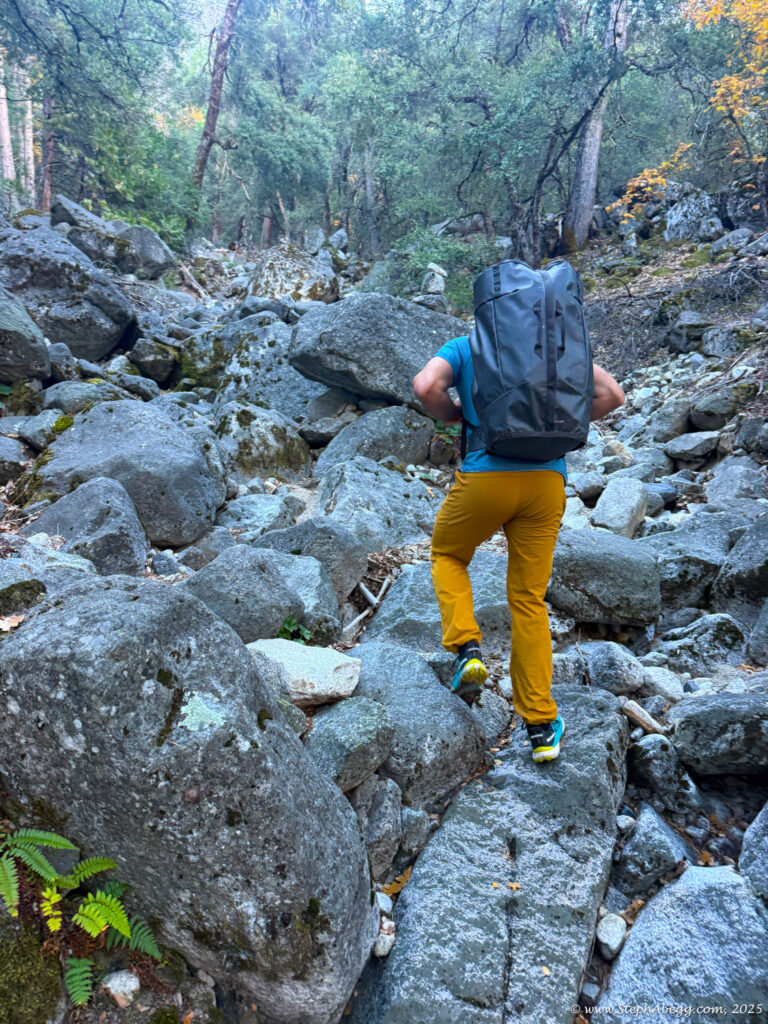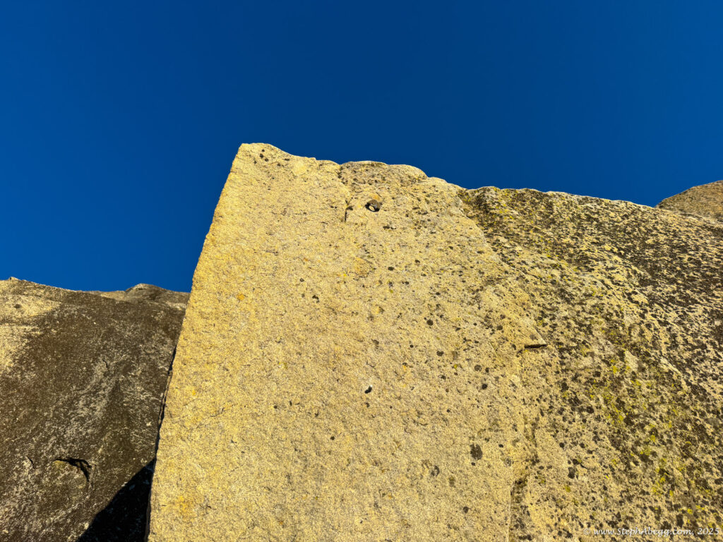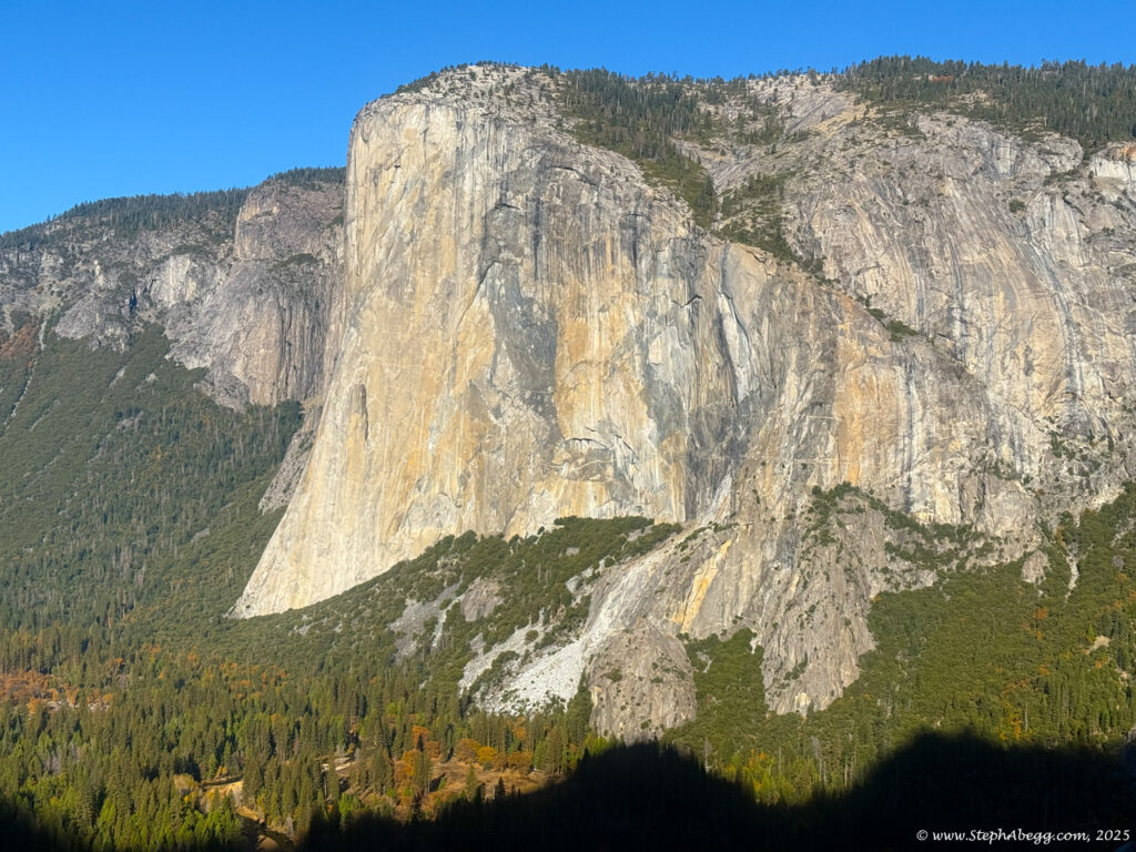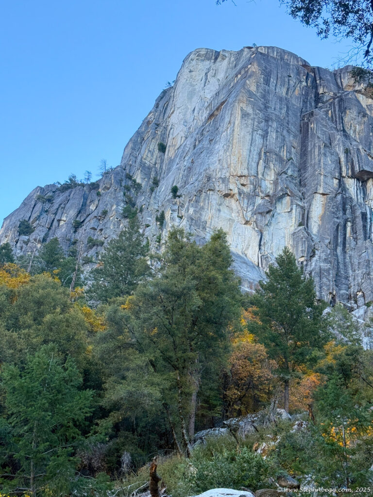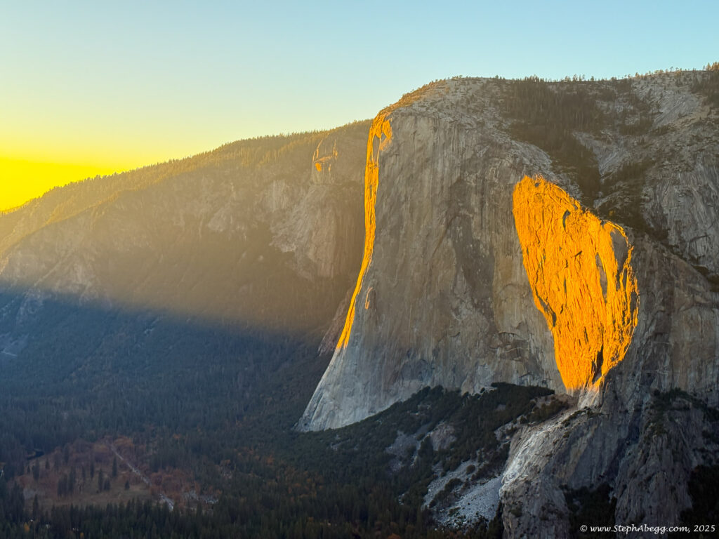 Wayward Son is roughly 55% independent and 45% shared with Call of the Yeti. It faces northwest and stays shaded until around 2 PM (depending on the season). The first ascent was completed in the morning of a day that later reached 94°F in the Valley.