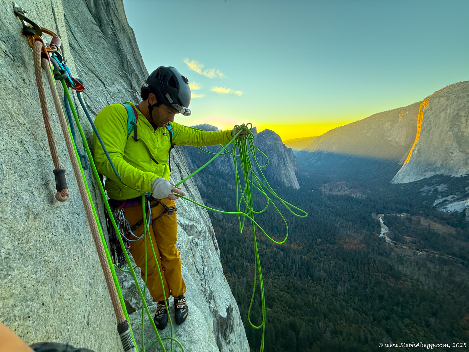 I climbed the route with Wade Morris, a fellow former Coloradan with whom I share several mutual friends and acquaintances. We climbed in a fix-and-follow style, alternating leads by blocks. Wade led Pitch 1 (5.11c); I took Pitches 2–5 (mostly 5.10 with one 5.11a); Wade led Pitches 6–9 (5.12b, 5.12b, 5.12c, and 5.11b); I took Pitches 10–11 (5.11b and 5.12a); and Wade finished with Pitches 12–13 (5.11d and 5.10c). I climbed it at 5.11 A0, while Wade managed to free several of the 5.12 cruxes.