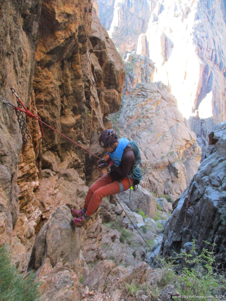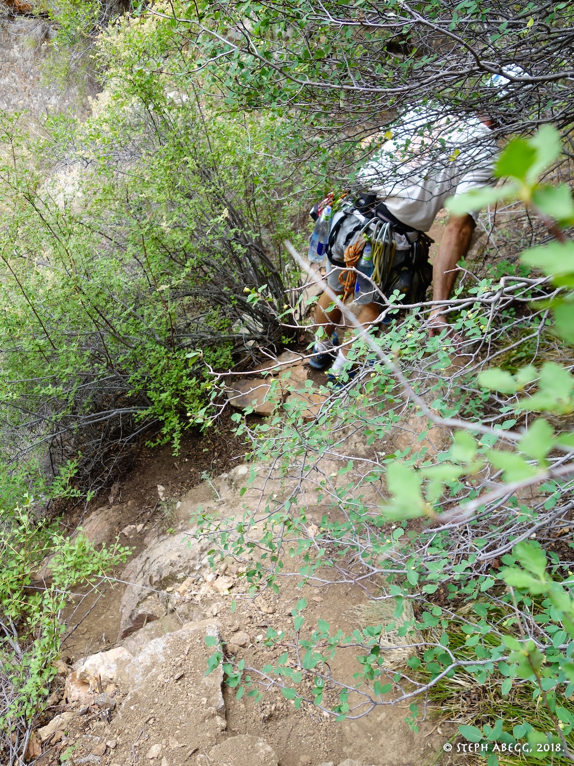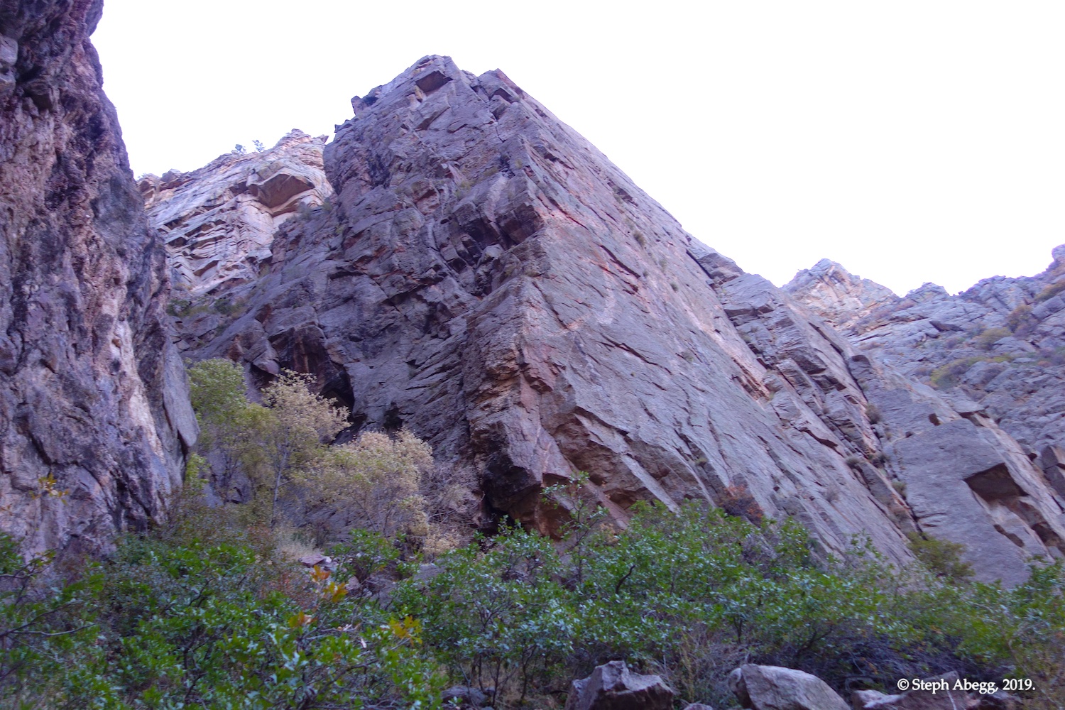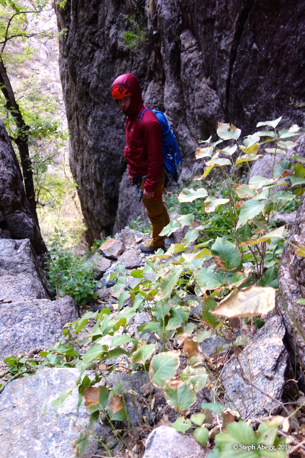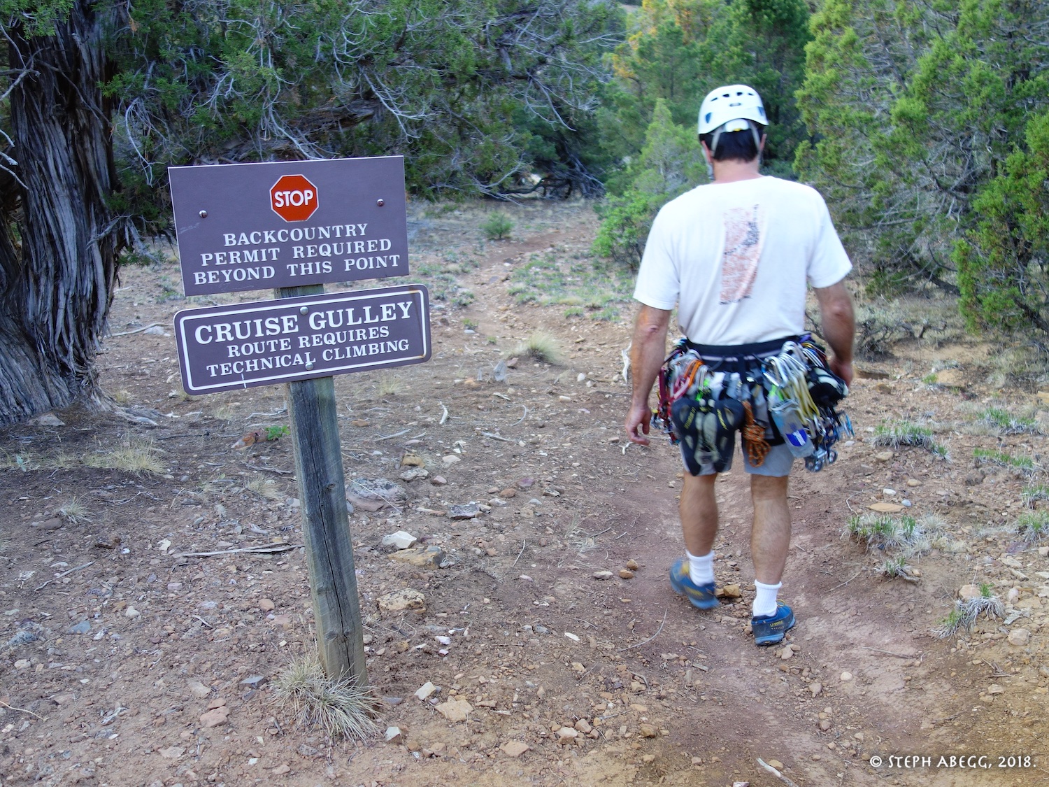 Descend the Cruise Gully, which involves scrambling and two rappels (fixed lines in 2024). Shortly after the second rappel, the gully opens up. Scramble down and right between North Chasm View wall and Newberry's Slabs buttress. The route starts at a prominent splitter below the ramp system on the upper portion of the formation.
