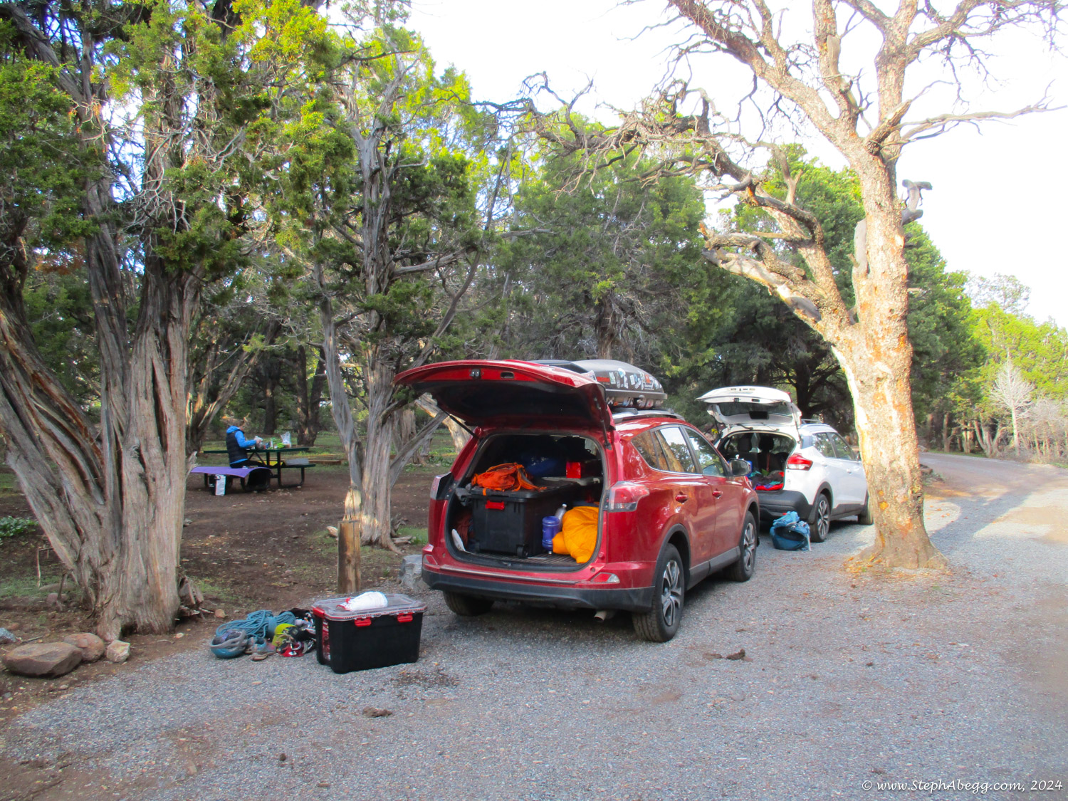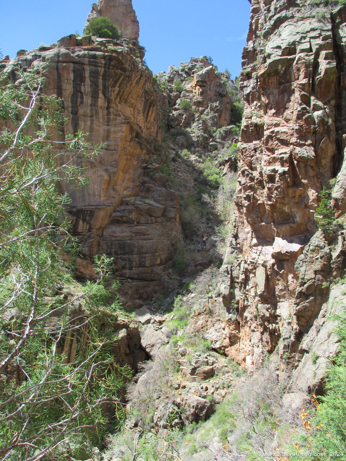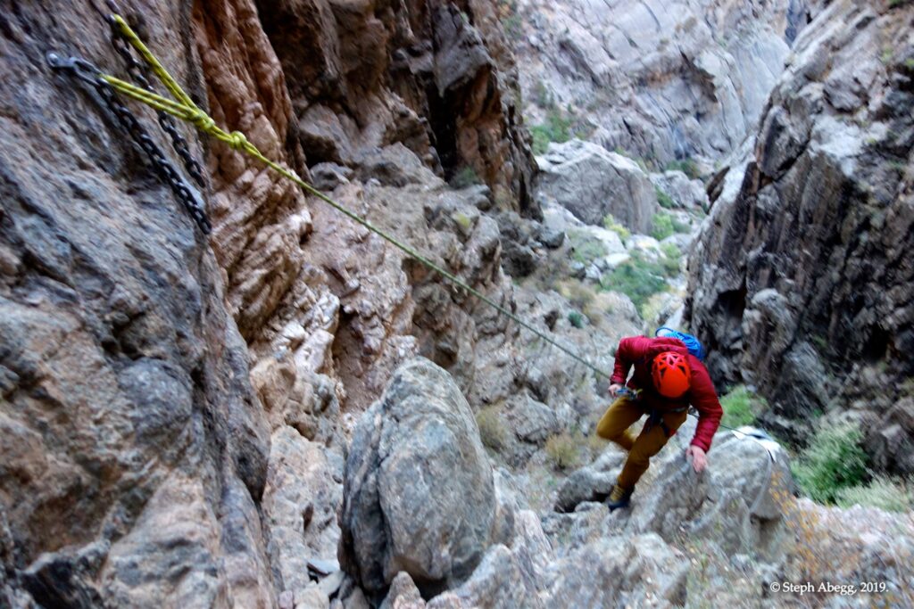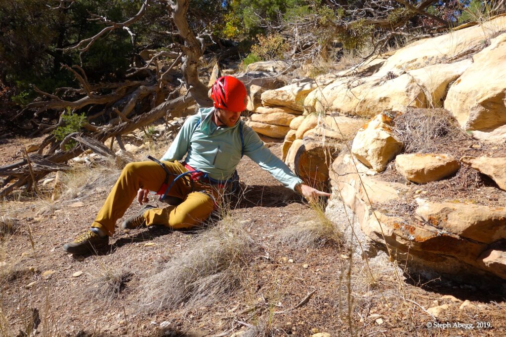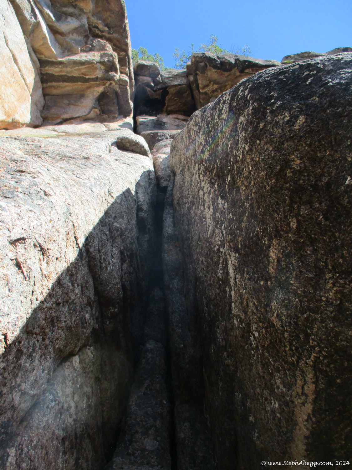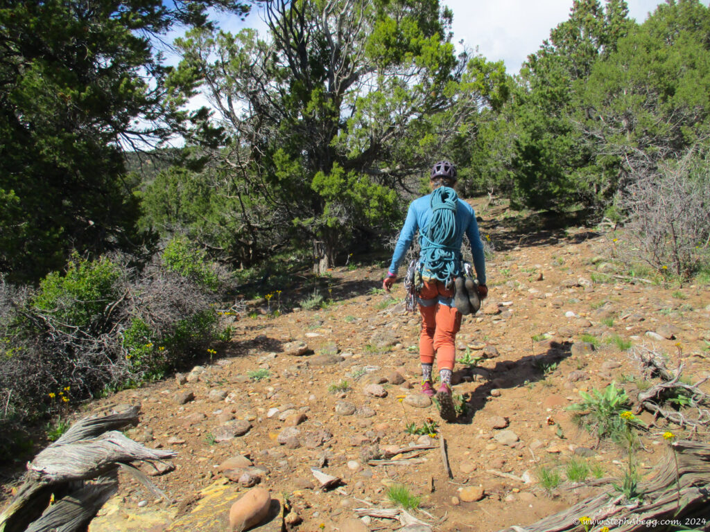 Descend the Cruise Gully, which involves scrambling and two rappels (fixed lines in 2024). Shortly after the second rappel, the gully opens up. Scramble down and right between North Chasm View wall and Newberry's Slabs buttress. The route starts at a prominent splitter below the ramp system on the upper portion of the formation.