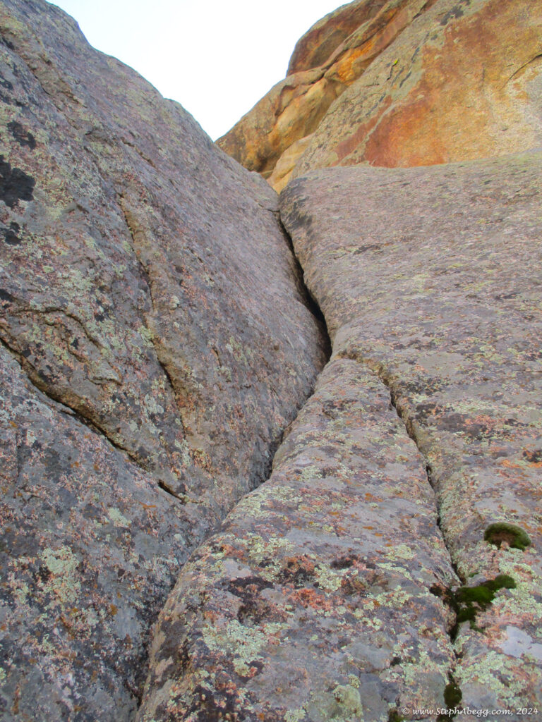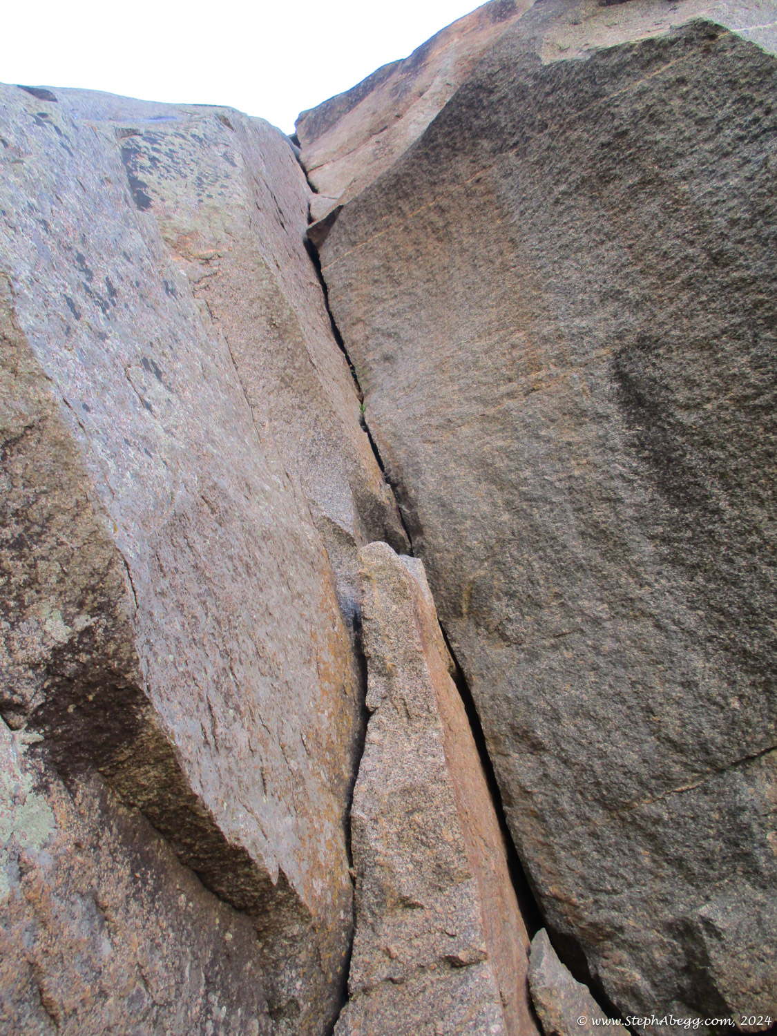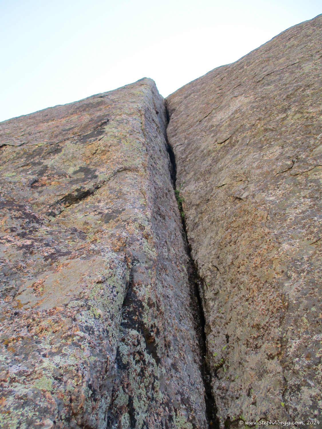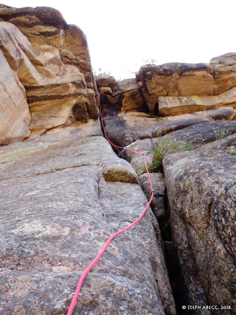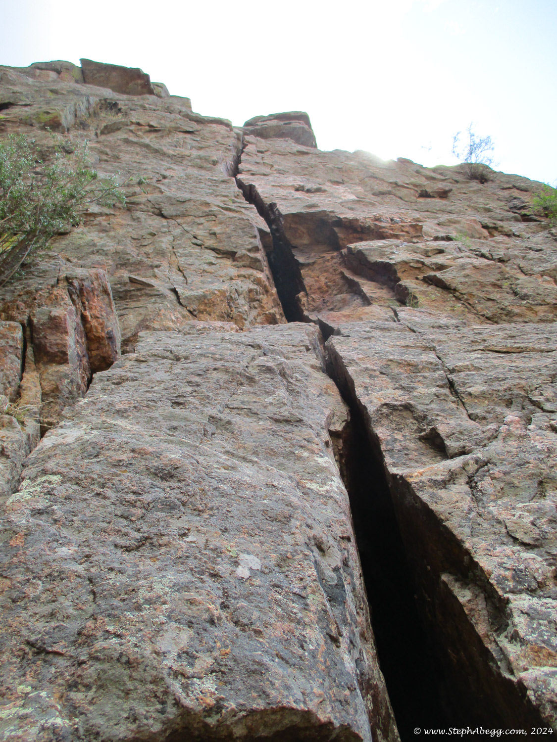 Climb the crack to easier slabs above, trending up and left to a large ledge and other hand crack. Pitches 3&4 can be linked for a 70m pitch.