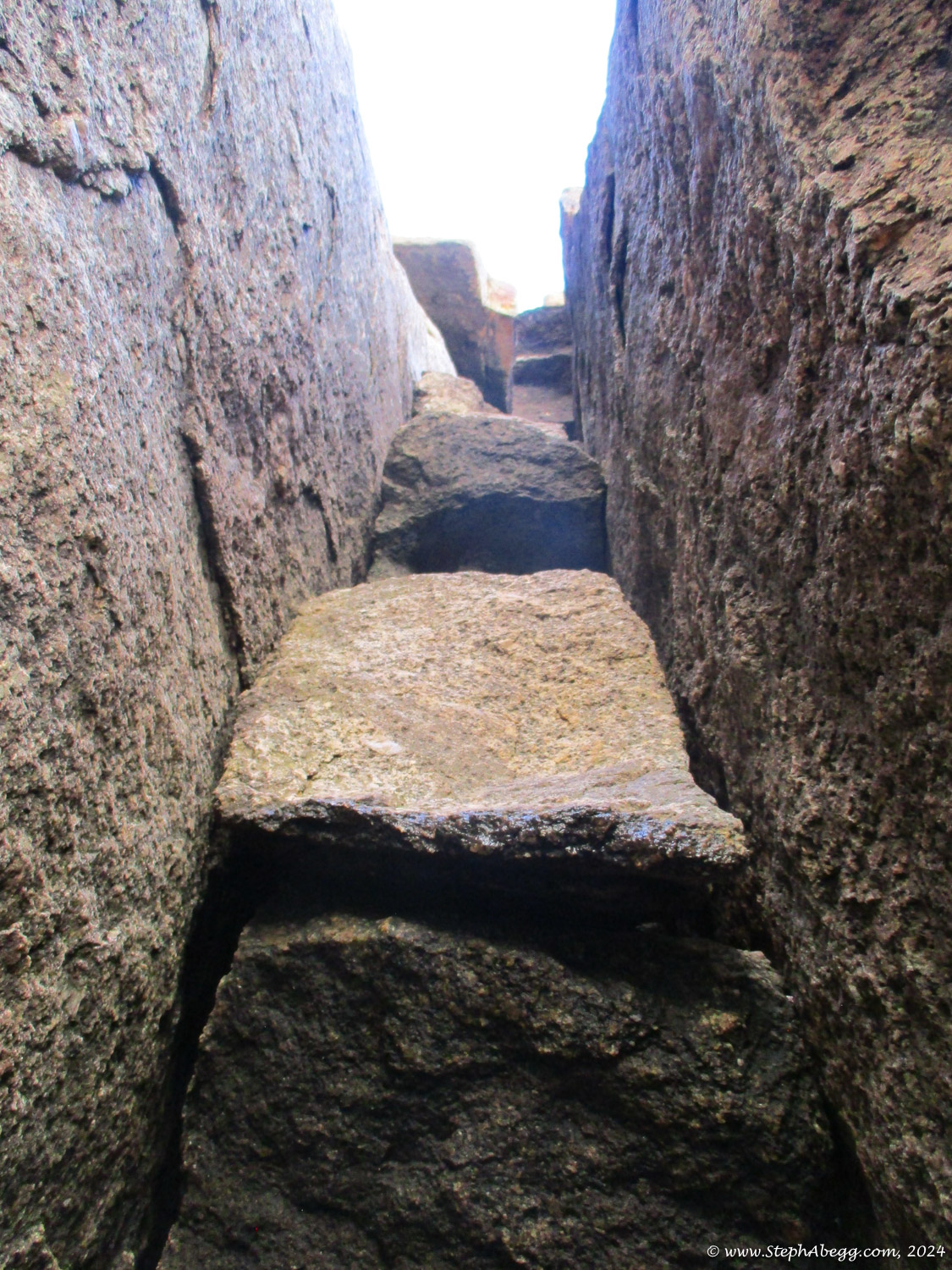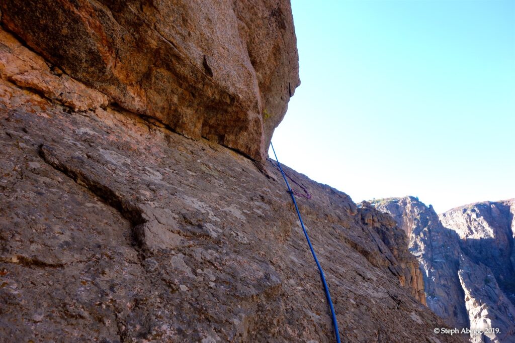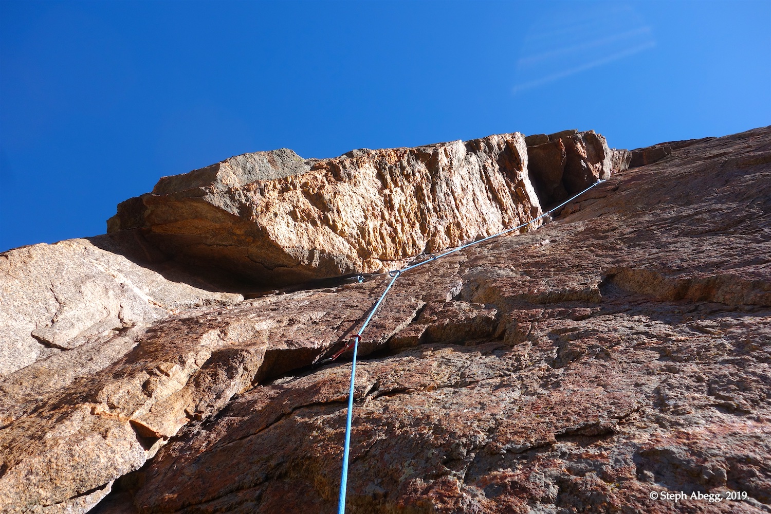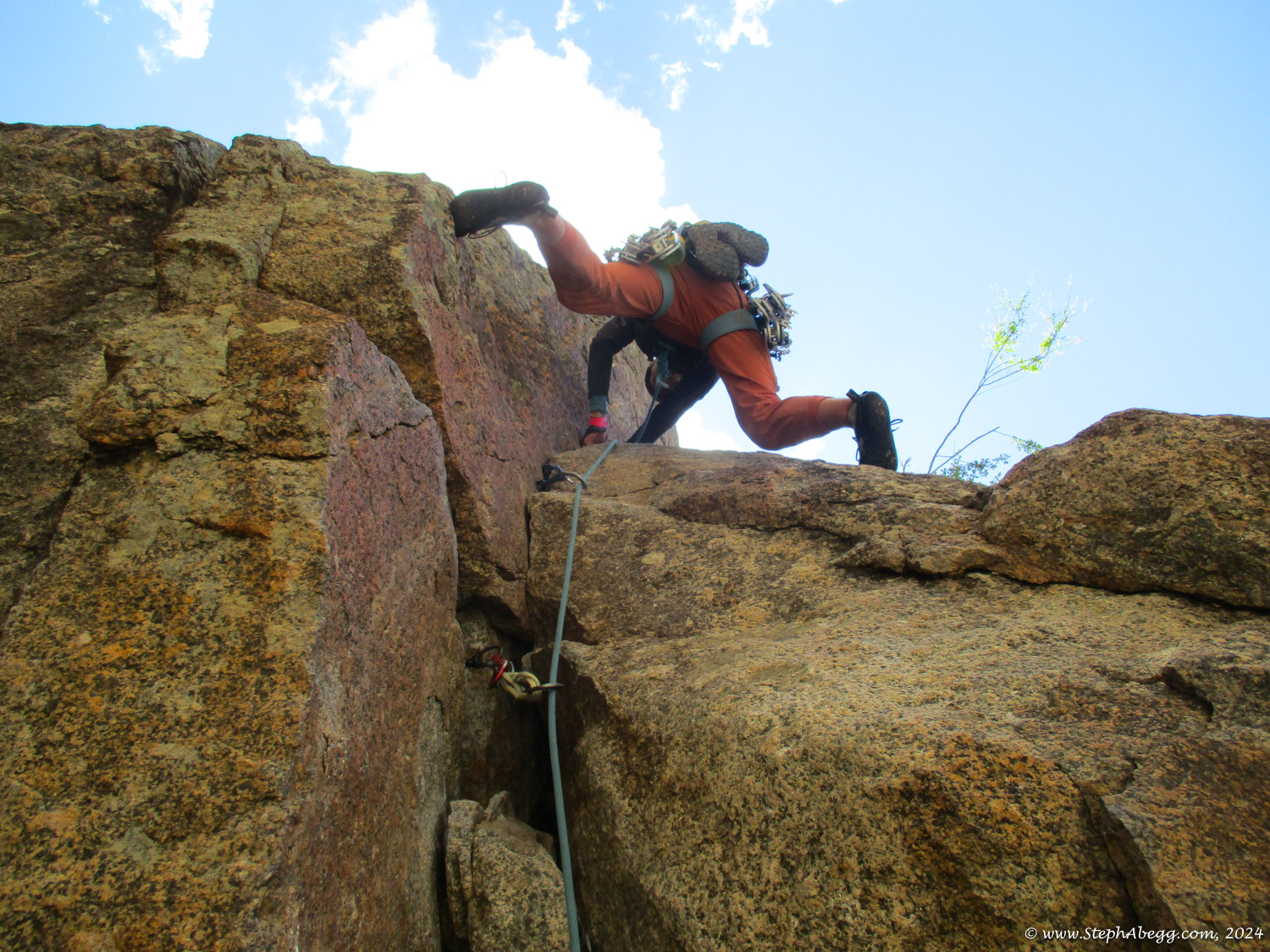 Climb the hand-fist crack, eventually entering a chimney. At a roof above, traverse left across a slab and belay on a ledge.