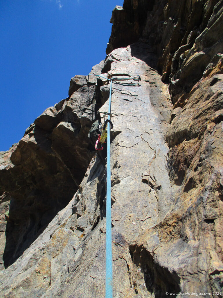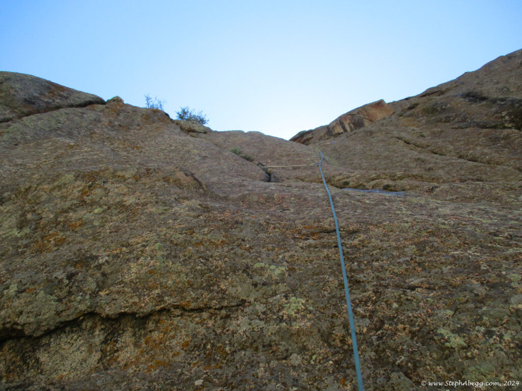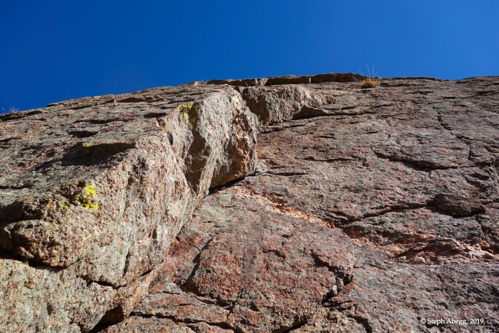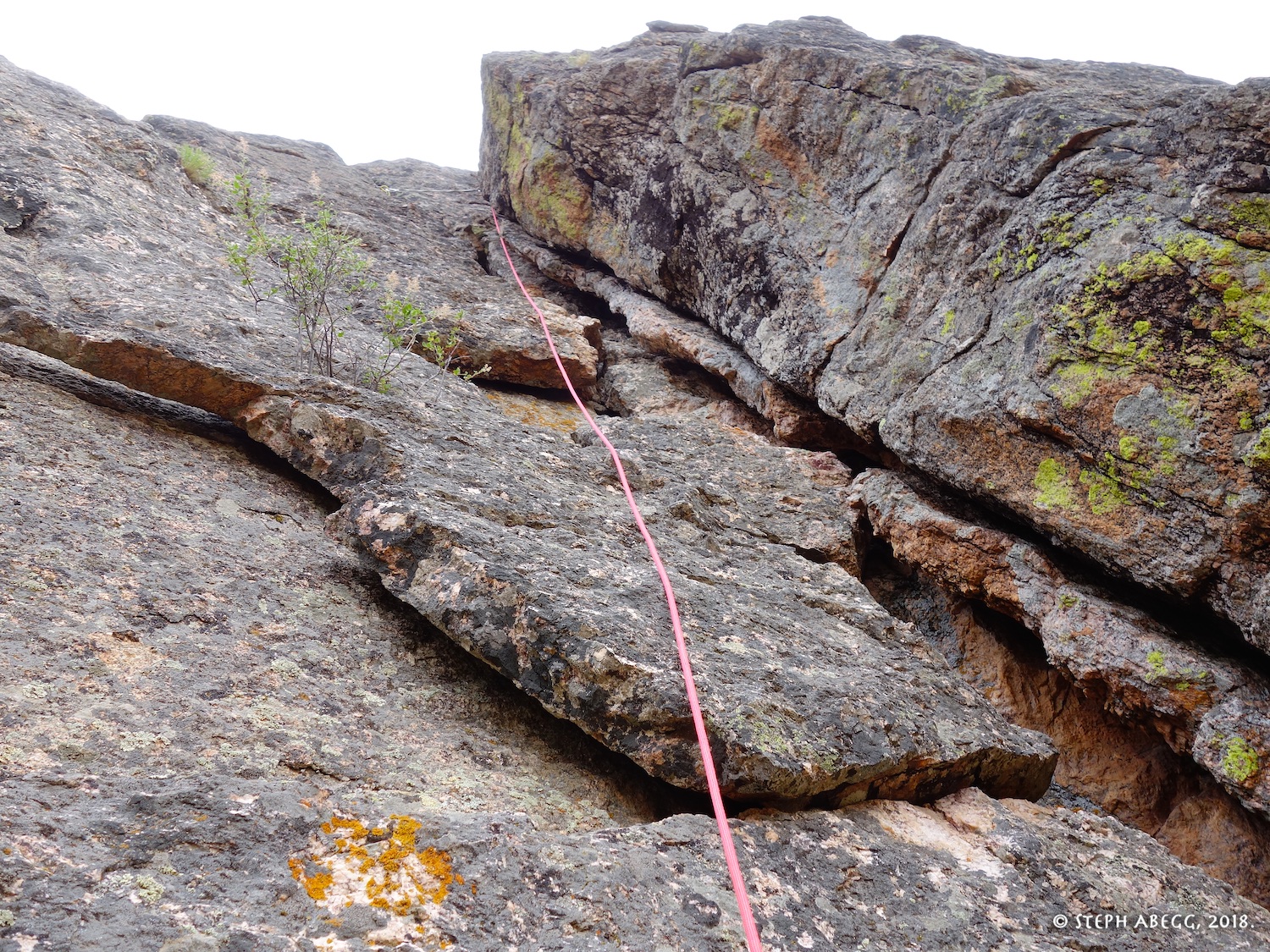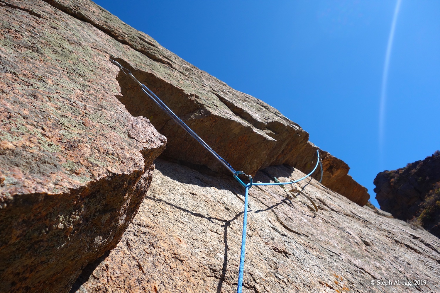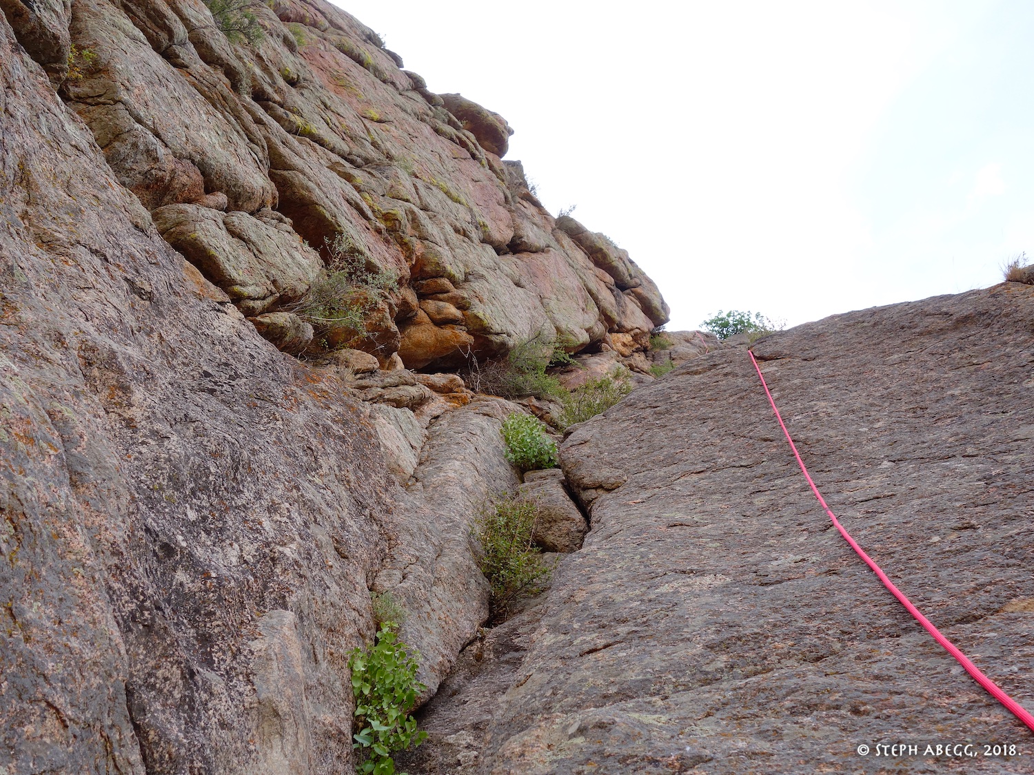 Routes on Newberry's Slabs require a linkup with another climb to reach the rim (unless you want to ascend Cruise Gully). A great 11-pitch 5.9 link-up is Newberry's Delight to Maiden Voyage to King Me (which is what we did).
