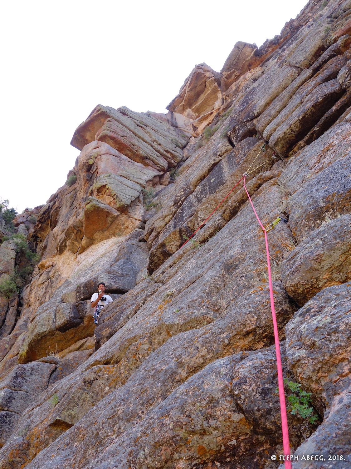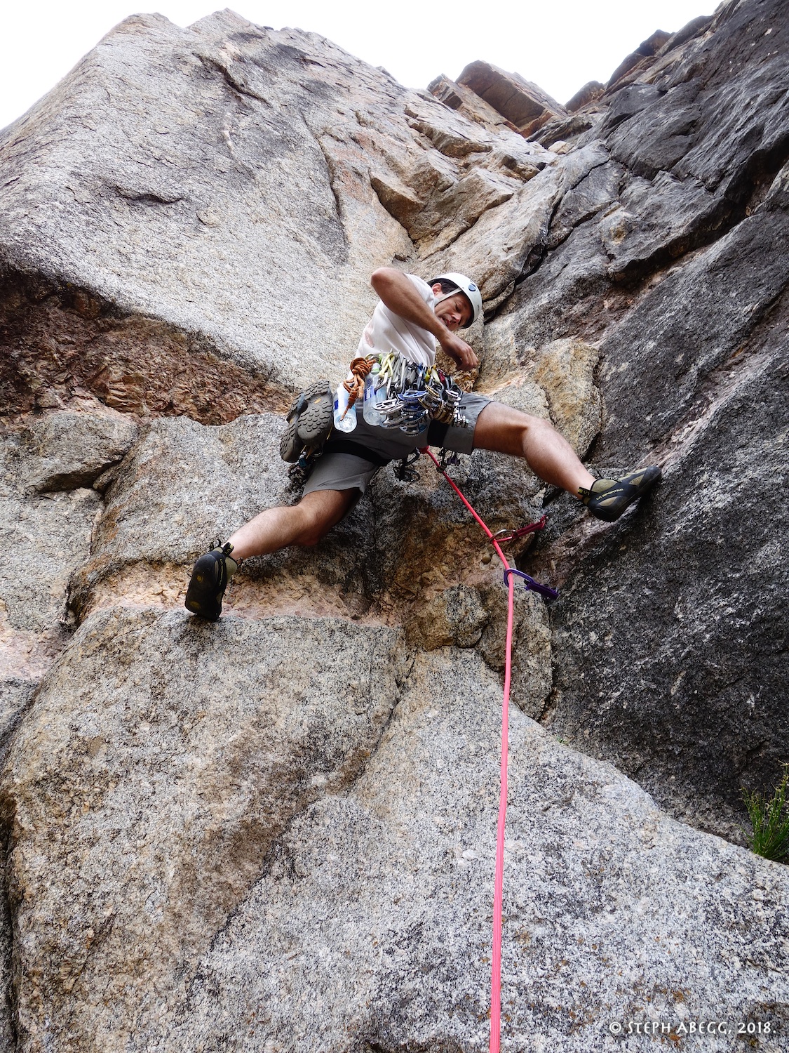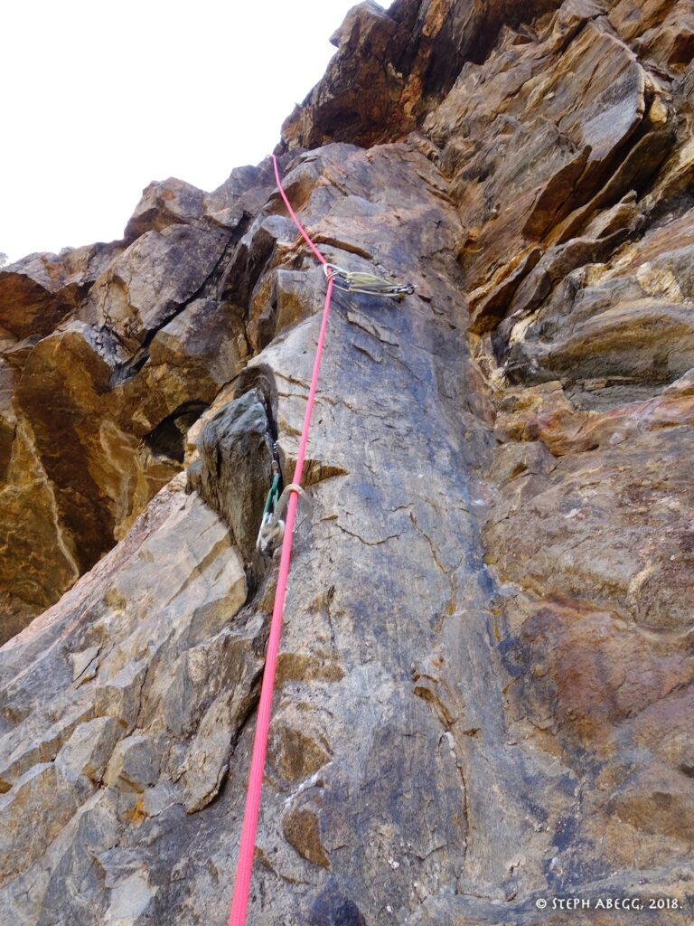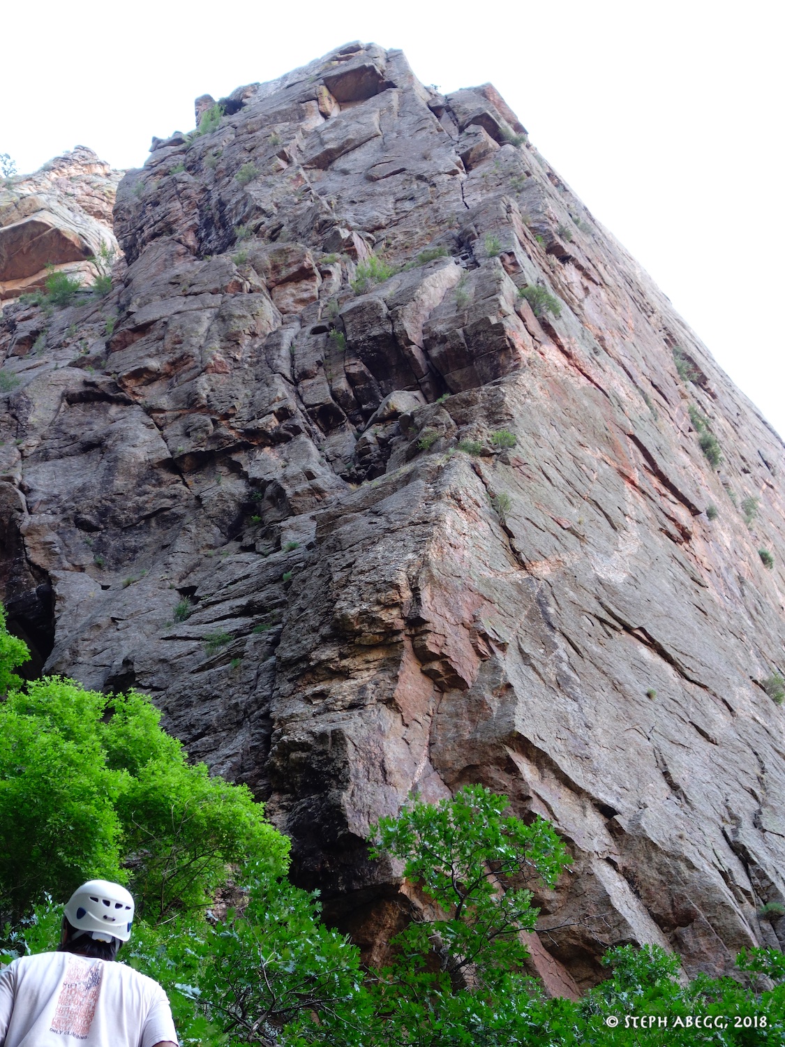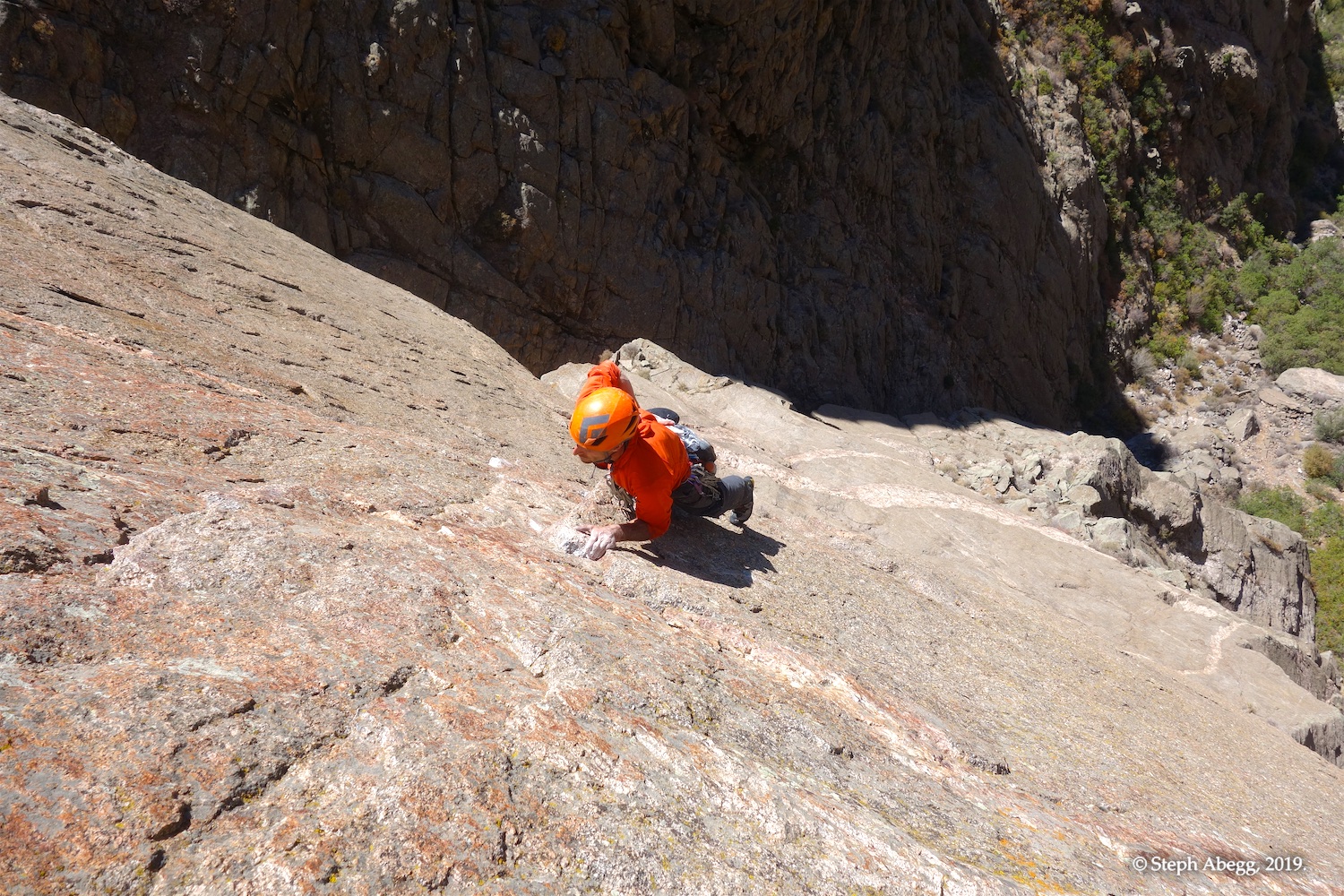 Routes on Newberry's Slabs require a linkup with another climb to reach the rim (unless you want to ascend Cruise Gully). A great 11-pitch 5.9 link-up is Newberry's Delight to Maiden Voyage to King Me (which is what we did).