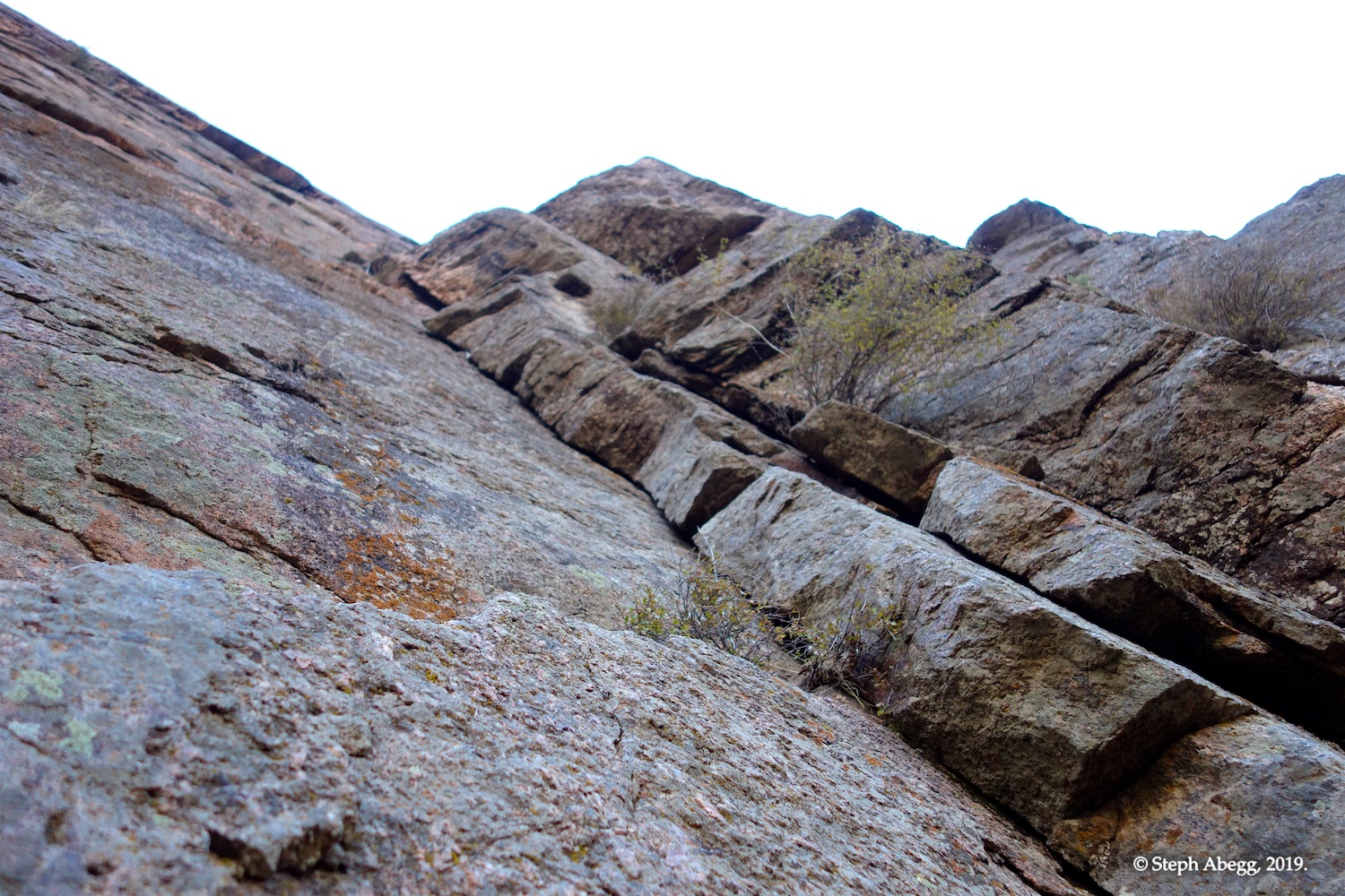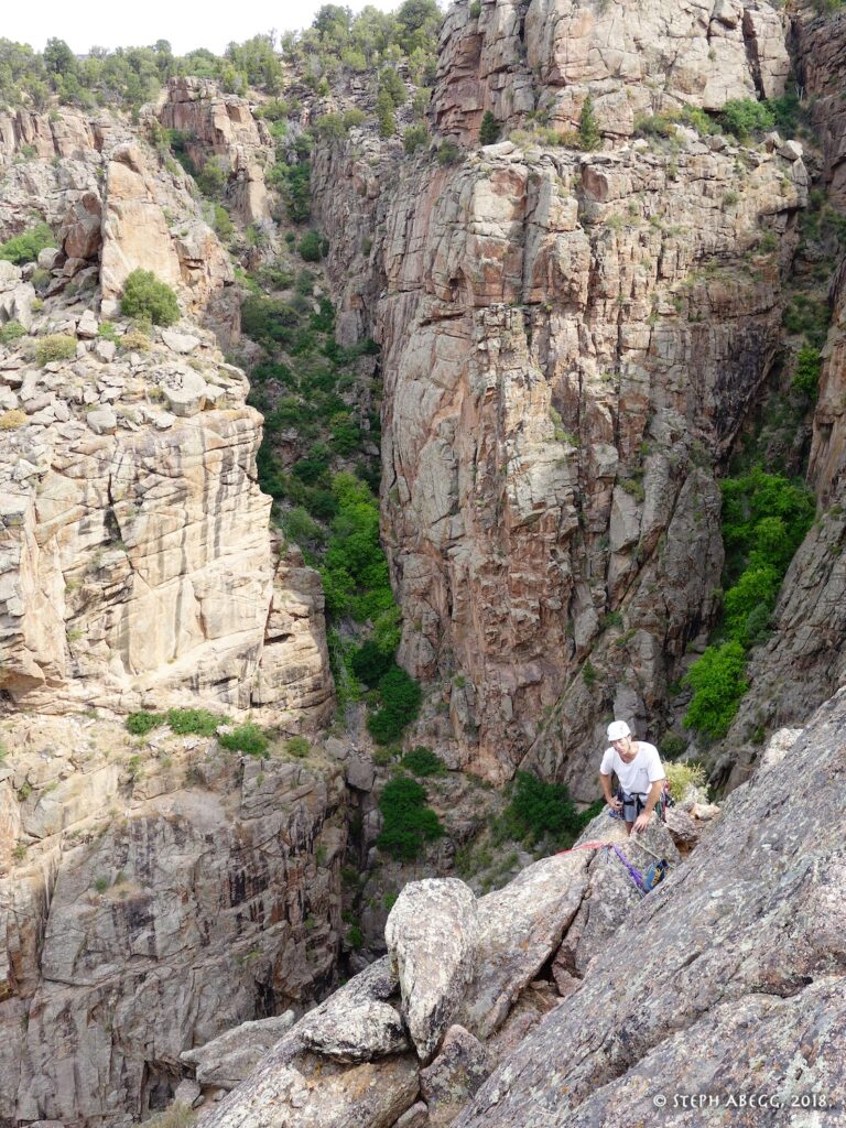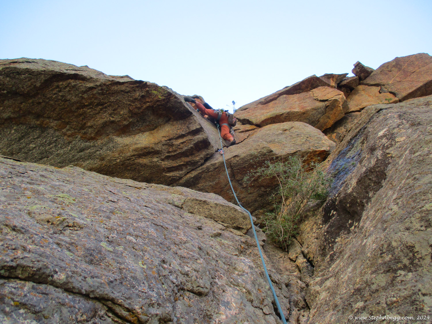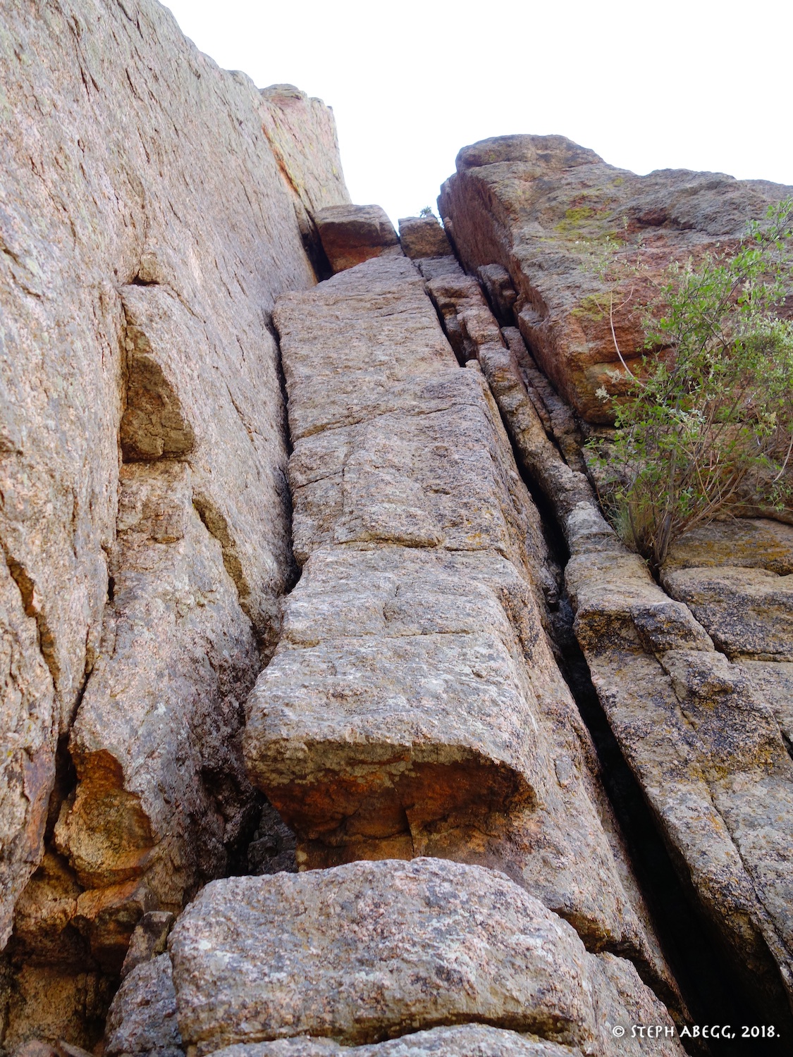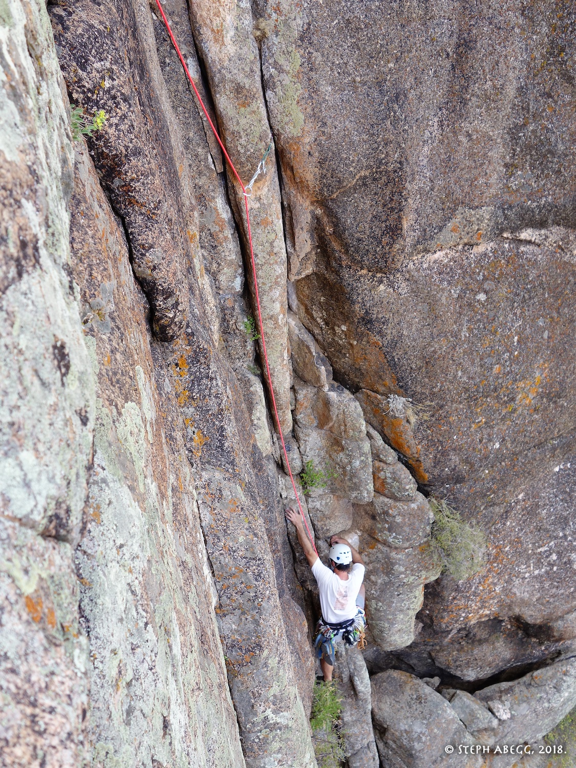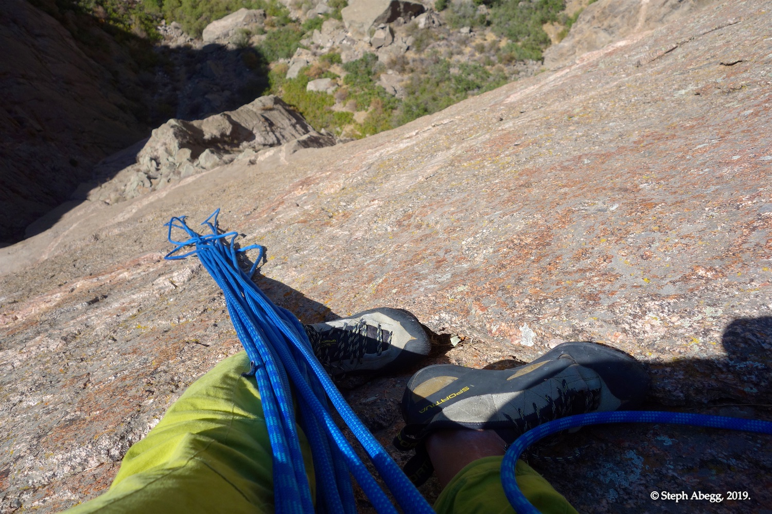 Routes on Newberry's Slabs require a linkup with another climb to reach the rim (unless you want to ascend Cruise Gully). A great 11-pitch 5.9 link-up is Newberry's Delight to Maiden Voyage to King Me (which is what we did).