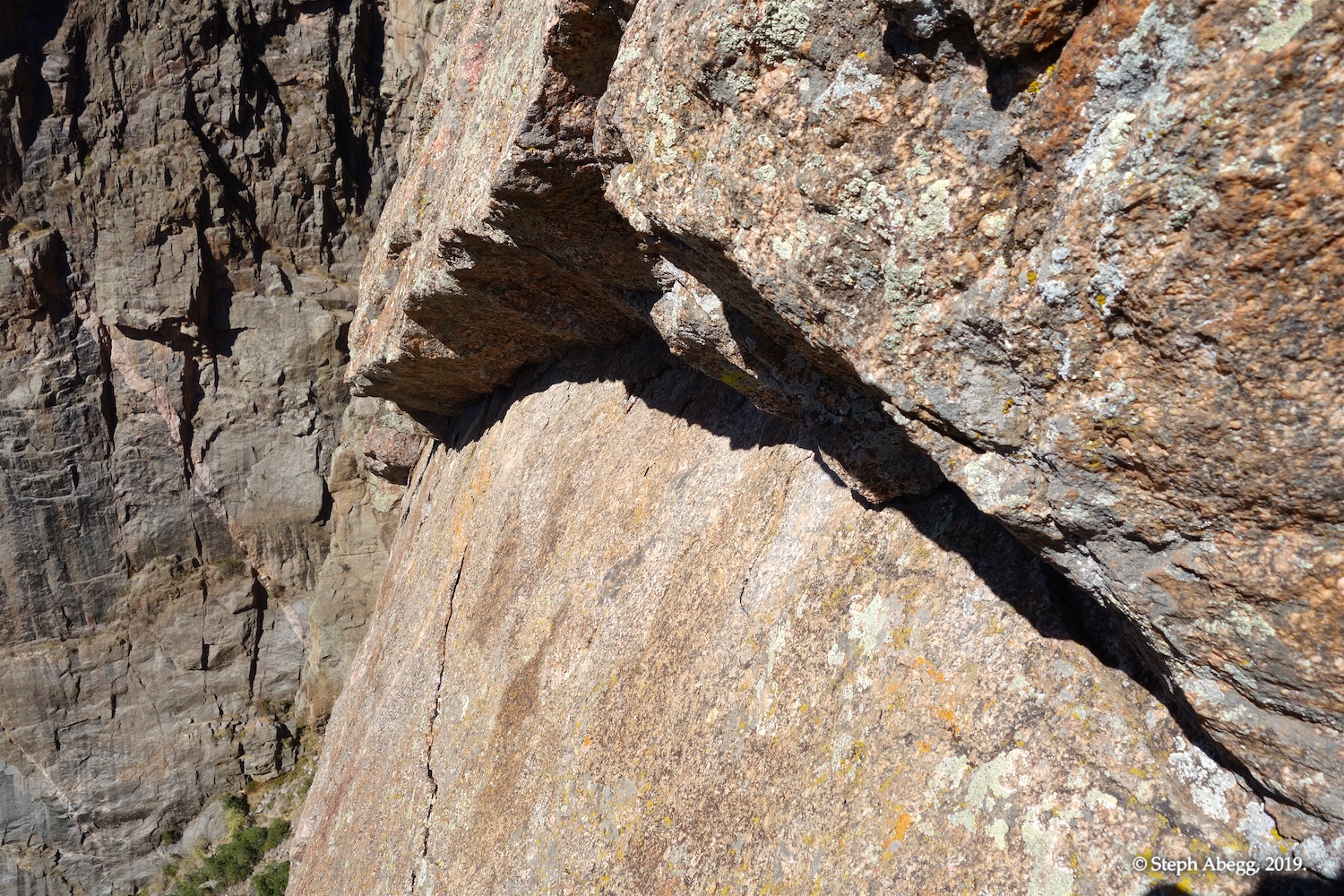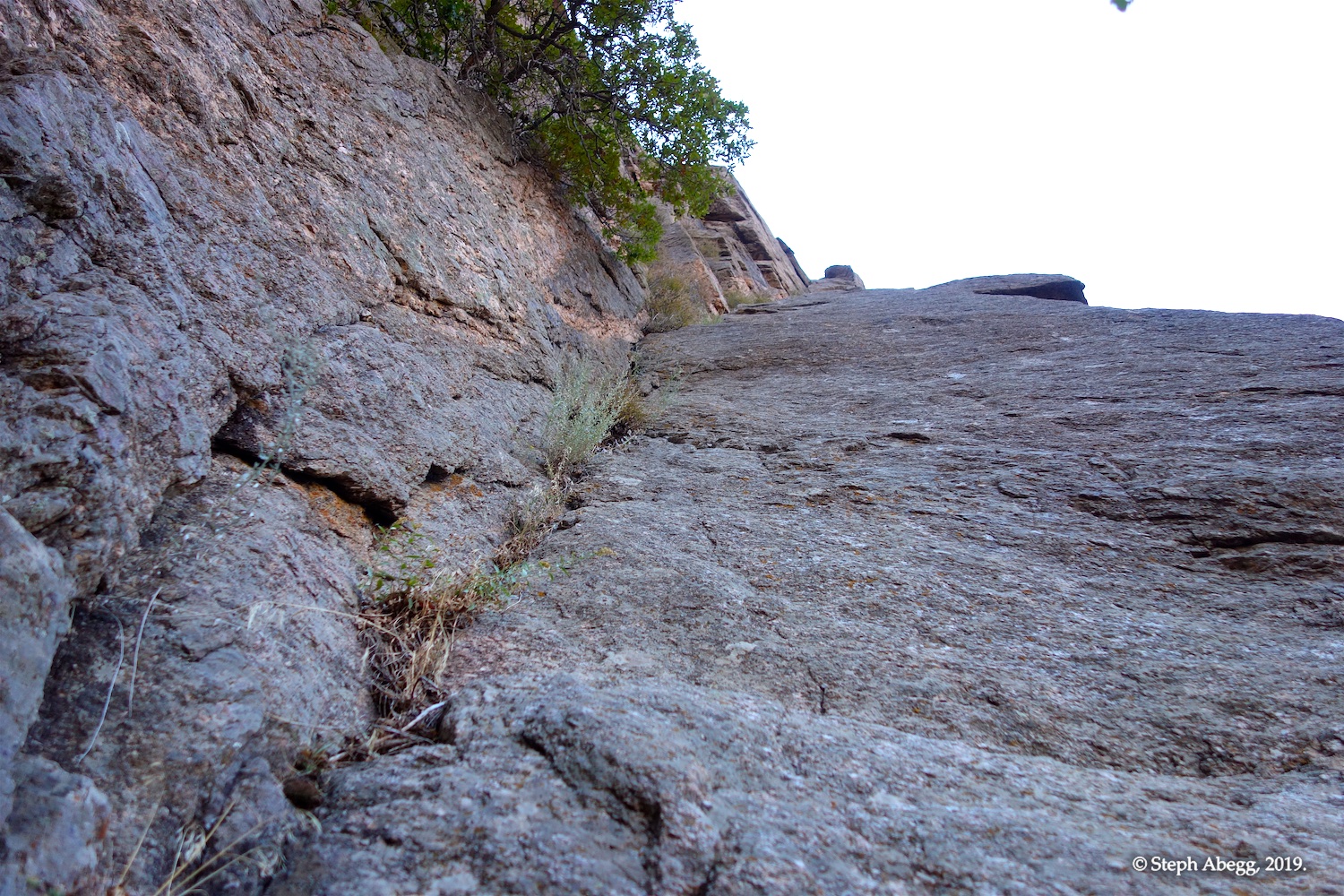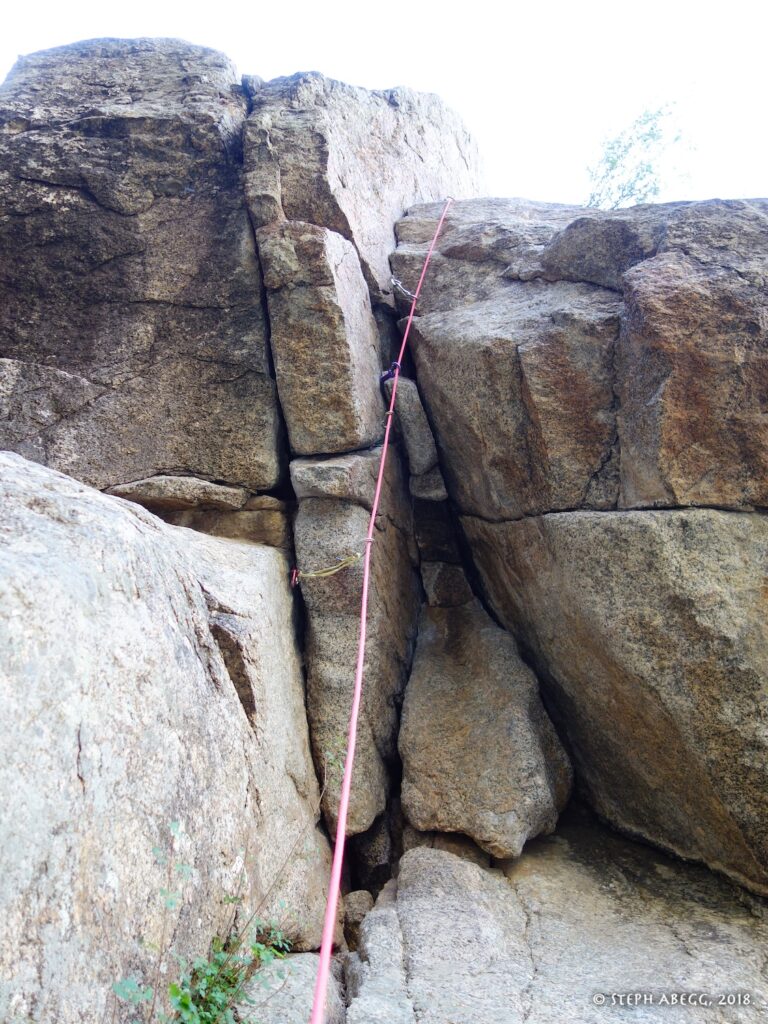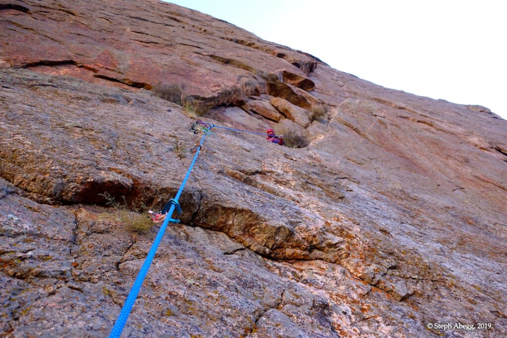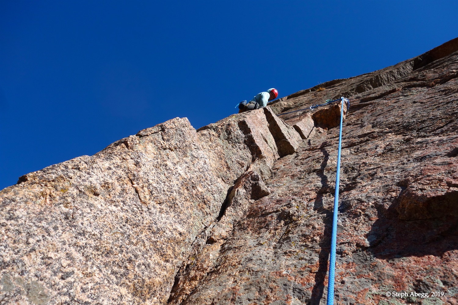 Routes on Newberry's Slabs require a linkup with another climb to reach the rim (unless you want to ascend Cruise Gully). A great 11-pitch 5.9 link-up is Newberry's Delight to Maiden Voyage to King Me (which is what we did).
